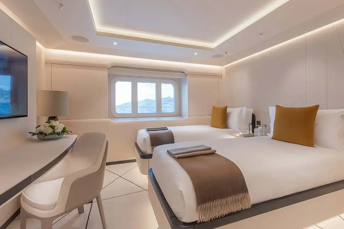 Exploring the rest of the yacht, your guests will find two main deck double VIP suites both entered from a striking marble-panelled lobby. Each stunning suite has an en suite bathroom, a king-sized berth, and is accessed via a separate dressing room. There are more light contemporary suites on the lower deck. Two double suites and a twin-berth cabin complete SYNTHESIS’ accommodation. Together they’ll offer your party a versatile arrangement of luxury suites that are ideal for families and friends.