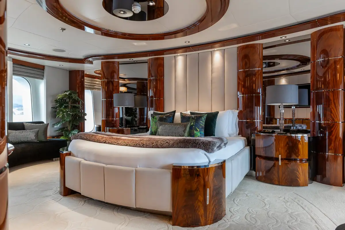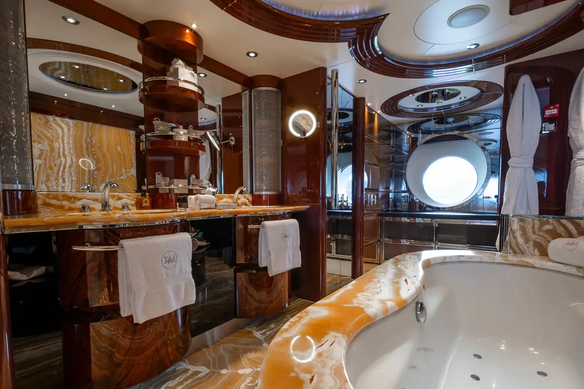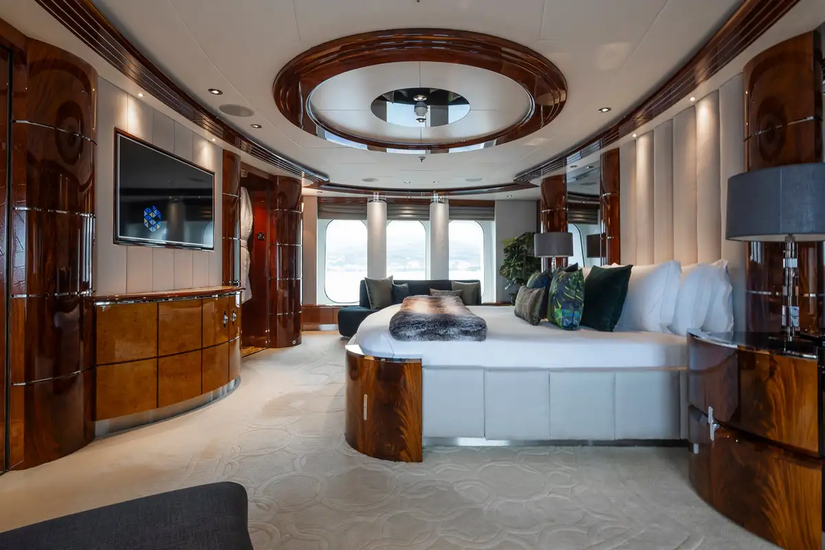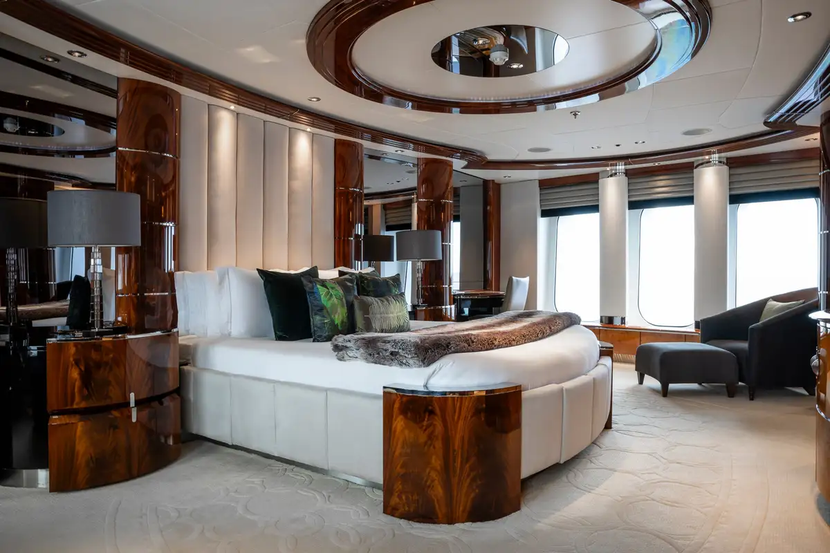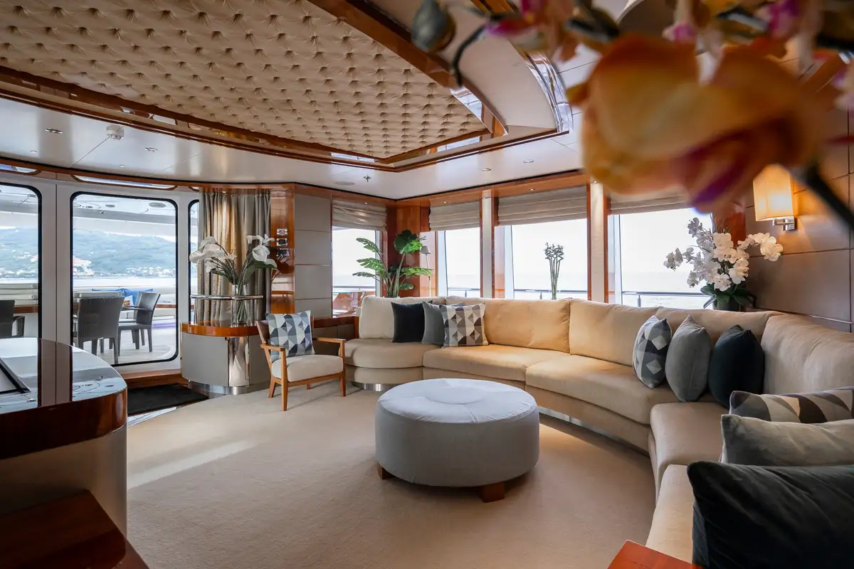 Her eye-catching interior blends Asian influences with Art Deco touches to create lavish entertaining spaces that are also supremely comfortable to live in. The more formal main salon and dining area is off-set by the relaxed setting of the sky lounge, with its large, curving corner sofa and wide opening onto the bridge deck aft.