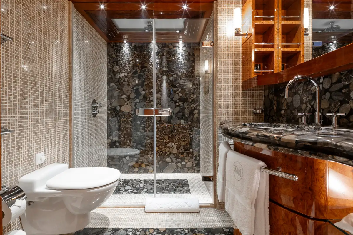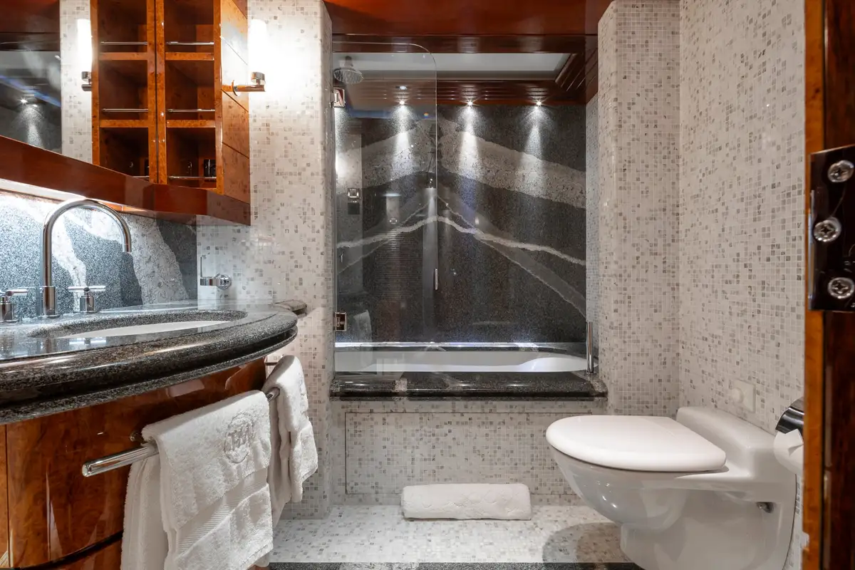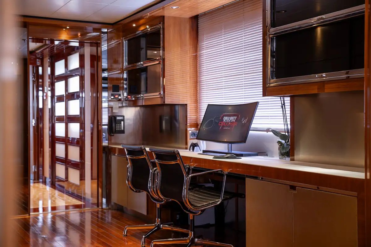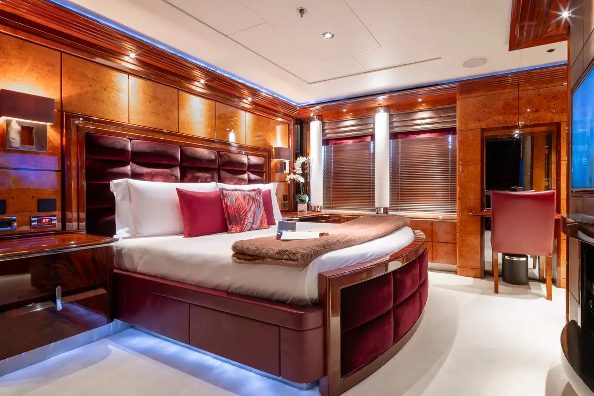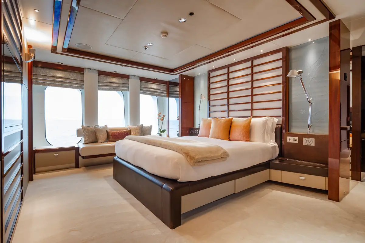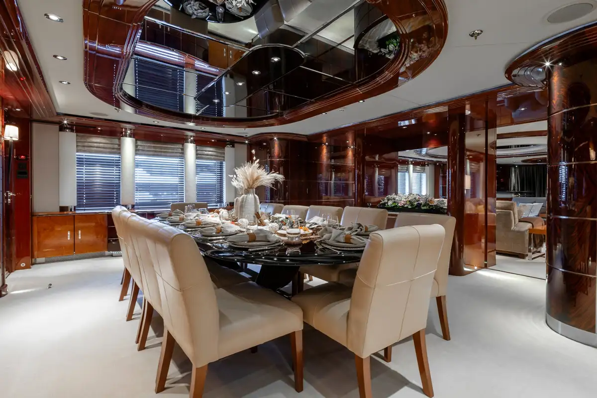 Her eye-catching interior blends Asian influences with Art Deco touches to create lavish entertaining spaces that are also supremely comfortable to live in. The more formal main salon and dining area is off-set by the relaxed setting of the sky lounge, with its large, curving corner sofa and wide opening onto the bridge deck aft.