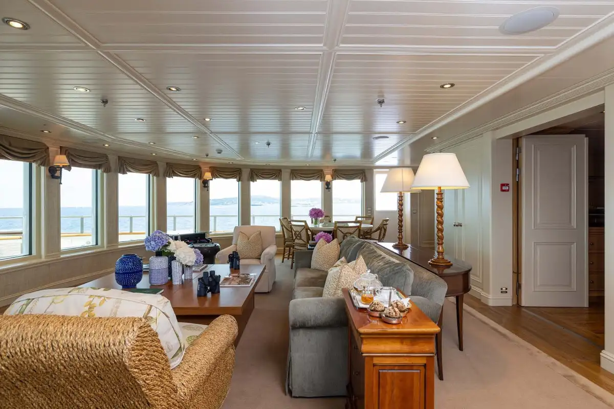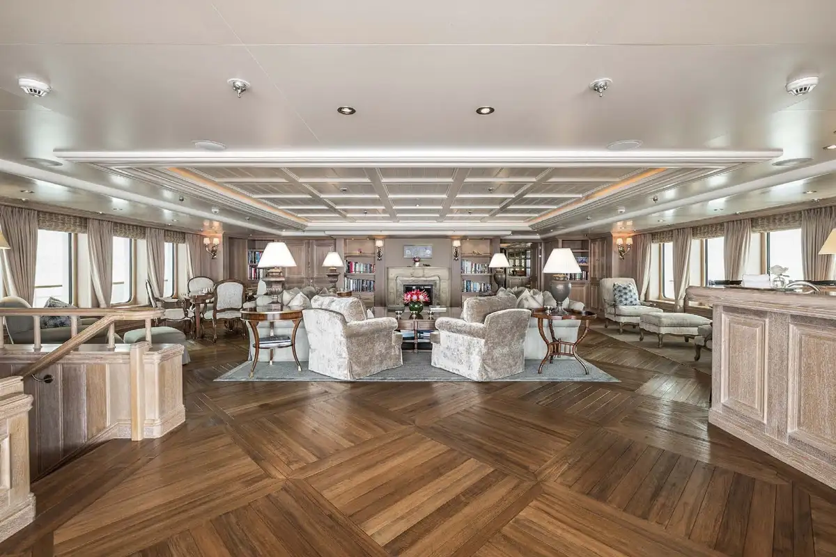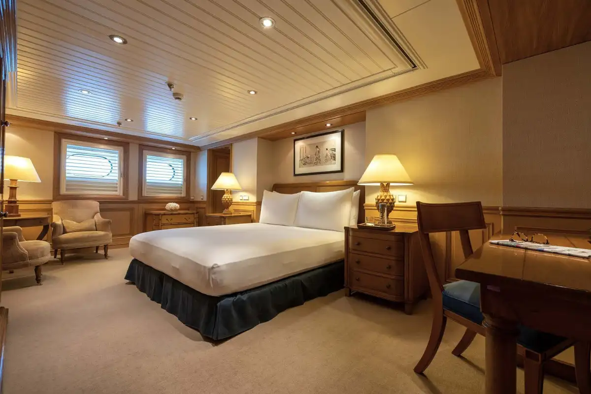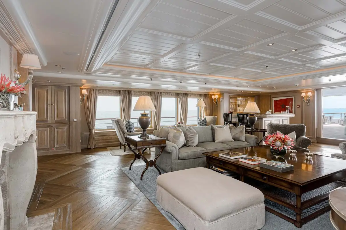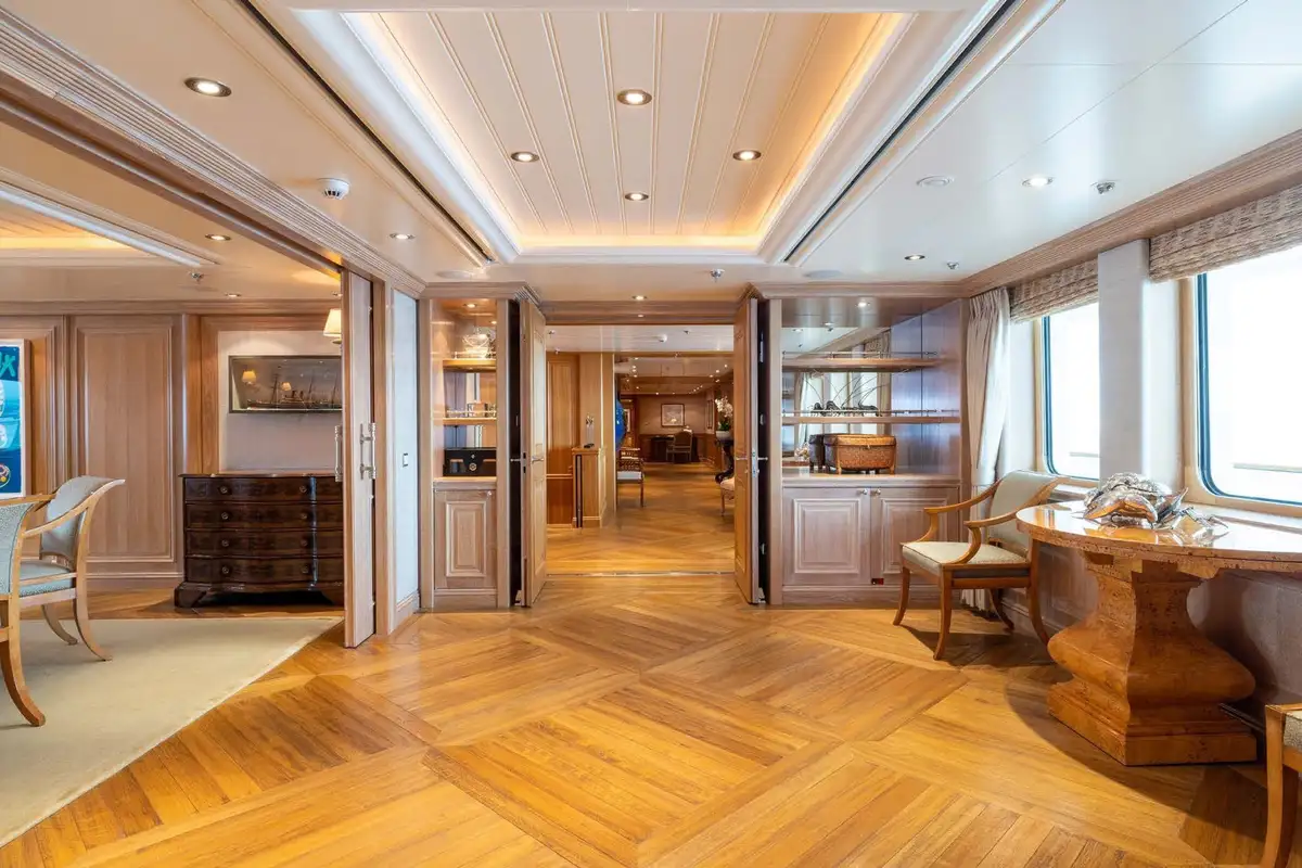 The aft deck leads directly into the yacht’s vast saloon, then onto the formal dining area. These spaces, with the classic charm of wood panelling and wooden floors and a neutral colour scheme, were designed by Terence Disdale. Another wonderful space to unwind is the upper deck lounge. It features a grand piano and music centre and you can relax here either before or after dinner at the al fresco formal dining area on the upper aft deck.