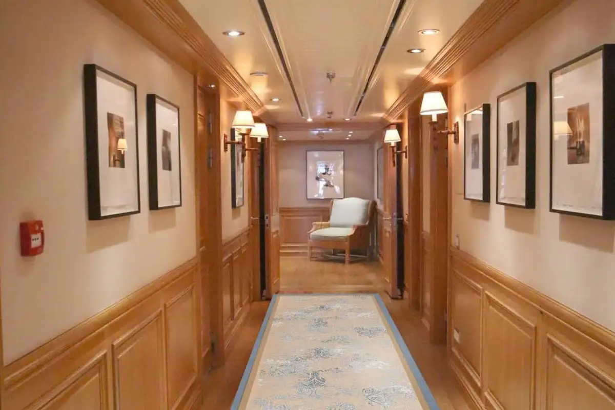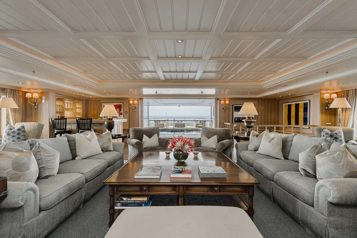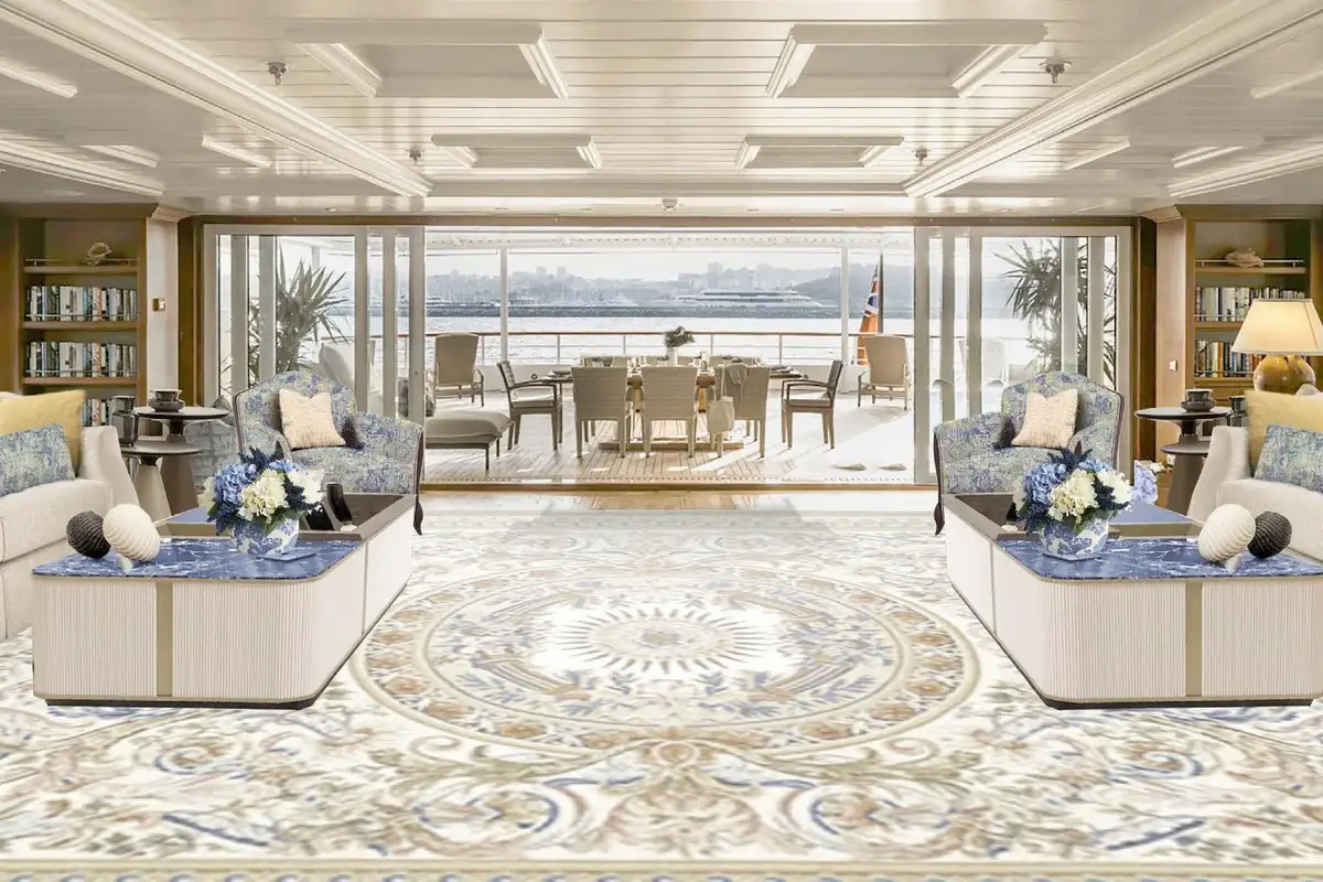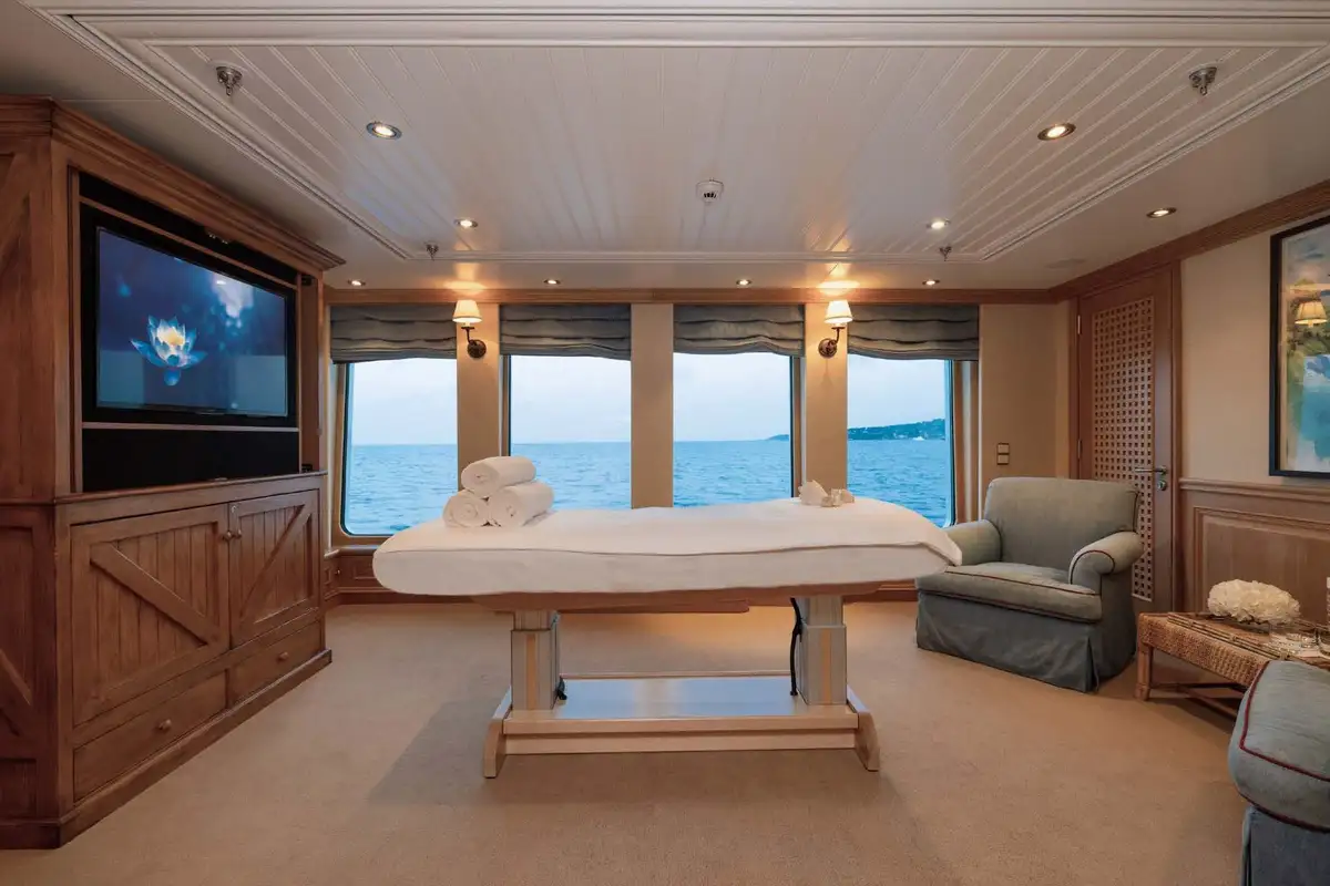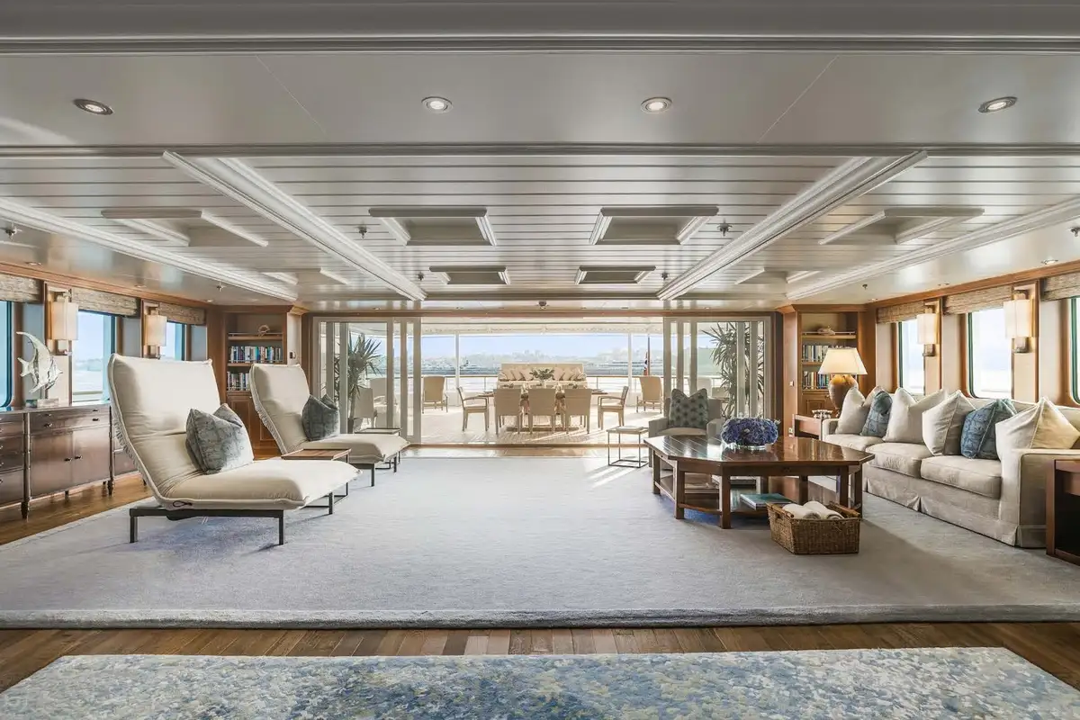 The aft deck leads directly into the yacht’s vast saloon, then onto the formal dining area. These spaces, with the classic charm of wood panelling and wooden floors and a neutral colour scheme, were designed by Terence Disdale. Another wonderful space to unwind is the upper deck lounge. It features a grand piano and music centre and you can relax here either before or after dinner at the al fresco formal dining area on the upper aft deck.