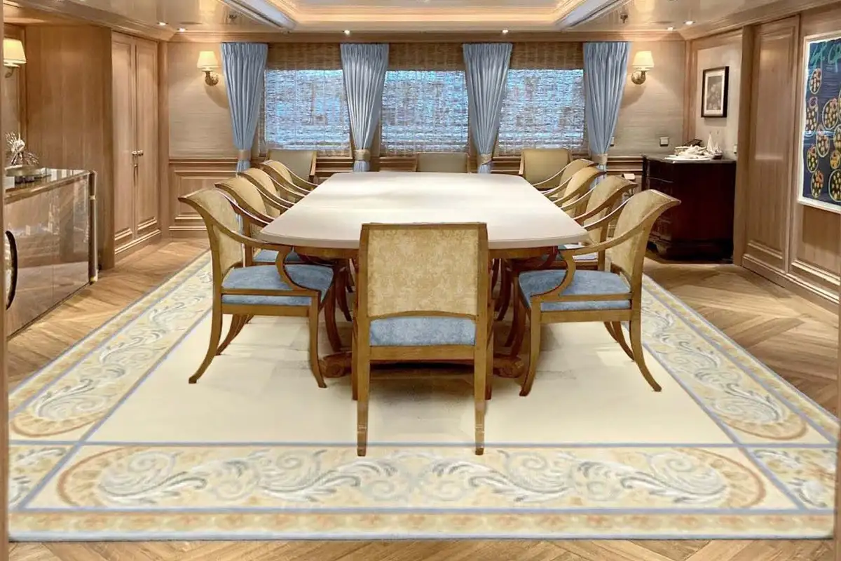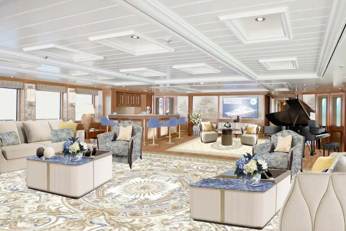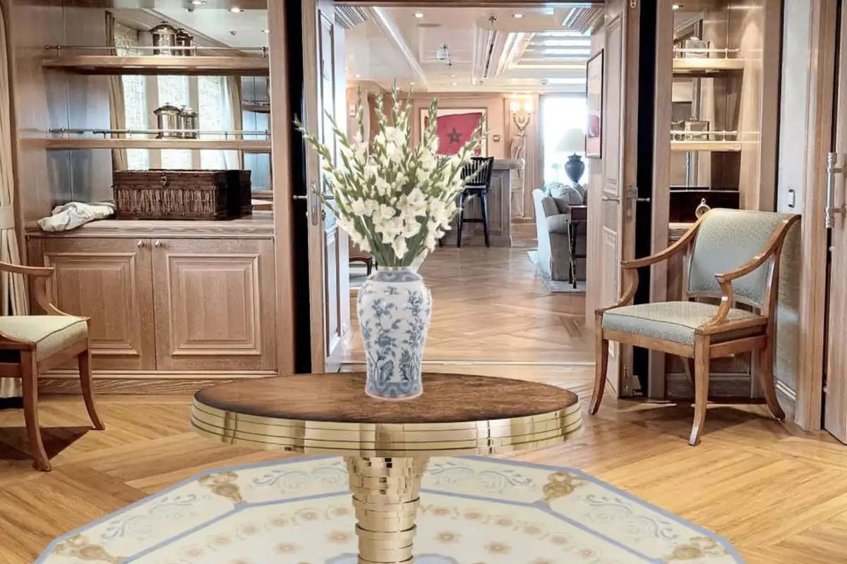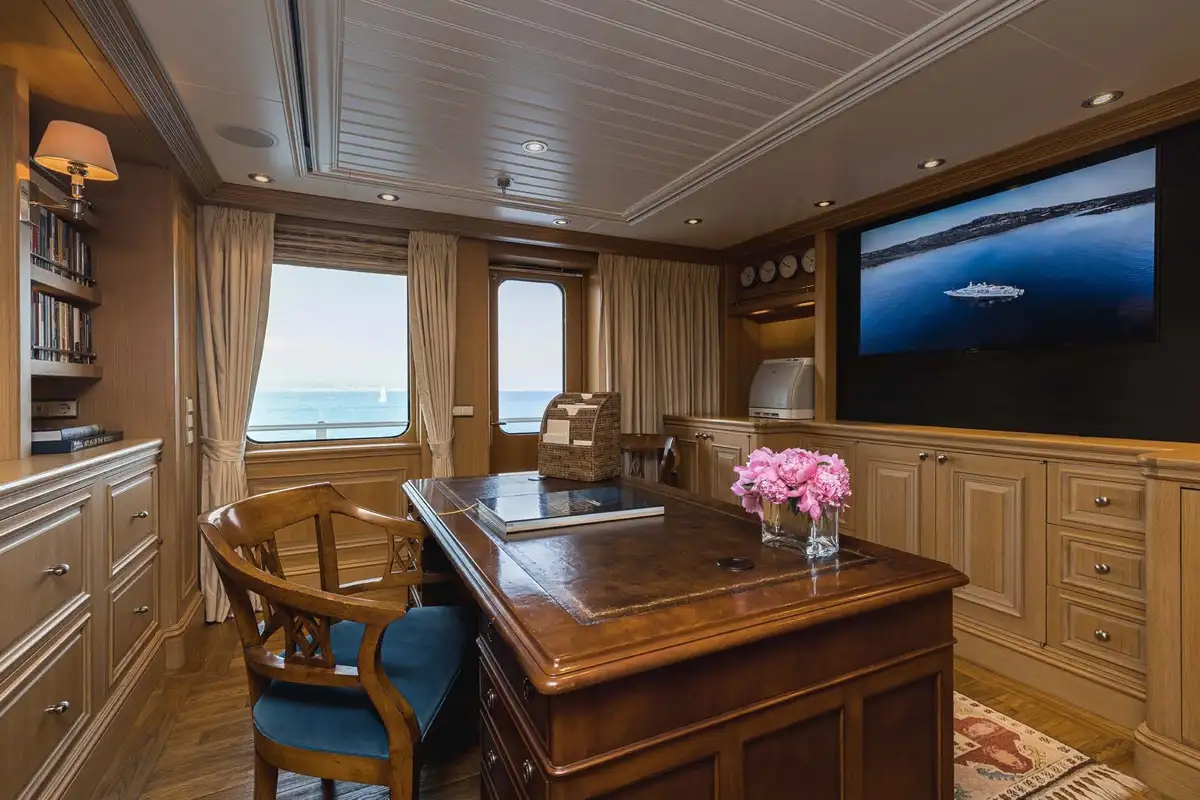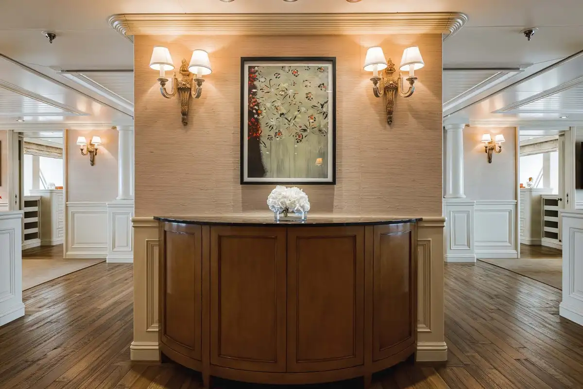 The aft deck leads directly into the yacht’s vast saloon, then onto the formal dining area. These spaces, with the classic charm of wood panelling and wooden floors and a neutral colour scheme, were designed by Terence Disdale. Another wonderful space to unwind is the upper deck lounge. It features a grand piano and music centre and you can relax here either before or after dinner at the al fresco formal dining area on the upper aft deck.