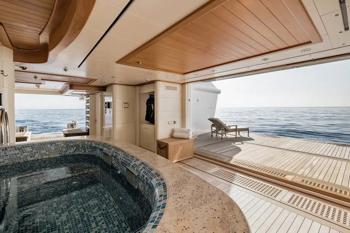 When not enjoying time with your family in the suite you have the rest of the yacht or yachts to enjoy – TATOOSH has a 13.1m (43ft) racing yacht ready to launch from her boat deck. Perhaps you, your family and guests would like to enjoy a film in the yacht’s cinema or a swim in her 5.5x3.7m (18x12ft) swimming pool. You’ll always find plenty onboard to fill your time. One of the outstanding areas on TATOOSH is her main aft deck poolside area. Here you’ll find many areas to relax, in the al fresco lounge area or the al fresco dining area. When the pool isn’t in use, the bottom of the pool raises to create a dancefloor.