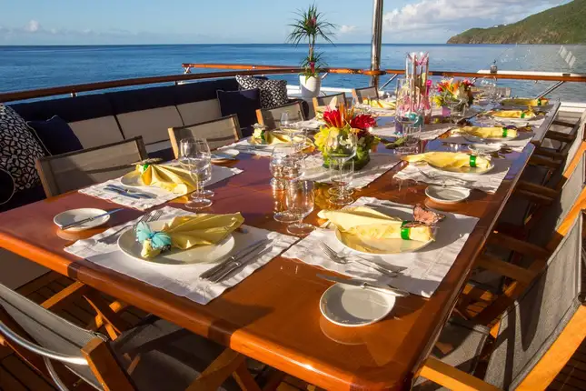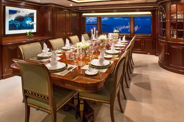 Wake up in your magnificent mahogany-panelled master suite on the main deck and take your time in the marble en suite with full-sized bath before dressing for breakfast. These luxe materials and traditional decor set the tone for the rest of the yacht. Breakfast is served al fresco on the main deck aft where you begin to feel the serenity of your surroundings work their magic. As the rest of your party join you the executive chef gives you the menu of fresh produce and exotic flavours to start your day.