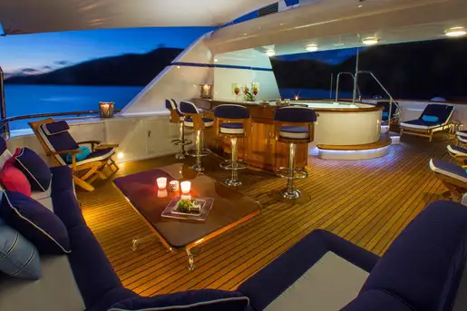 Stylish living aboard comes with all the mod-cons and state of the art entertainment system. The light-filled main saloon extends into the dining room, which can be enclosed for more intimate dinners. While the upper deck hosts the sky lounge with a full-sized bar that opens onto a vast aft deck. At the very top is the sun deck with an outside bar and lounge - plus jacuzzi and plenty of sunbathing space - and a view to remember.