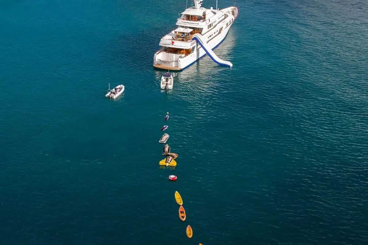 The day promises so much… the 5m (16.4ft) inflatable waterslide is in position from the top deck to the sea - who will be the first to take the plunge? TELEOST has a huge swim platform astern, with an outside shower to rinse off. On the sun deck the jacuzzi awaits those who like to enjoy their water less adrenalin-filled and more zen. This deck is the yacht’s dedicated relaxation zone with an outdoor sound system, bar and BBQ to fire up later to prep a little lunch.