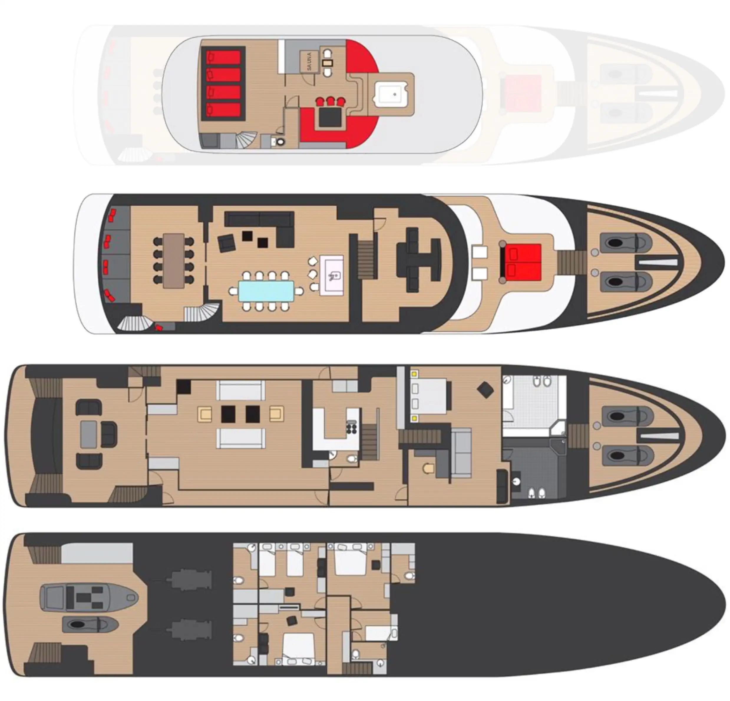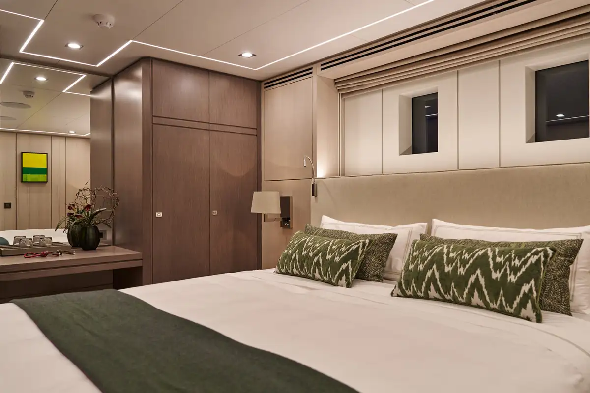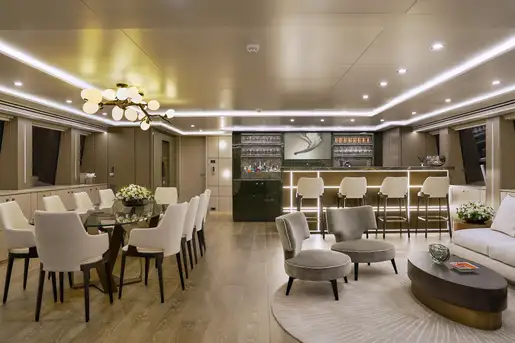 Accommodating 10 guests across five luxurious cabins, THANUJA’s 38sqm main deck master suite is a highlight, featuring a private lounge, bar and coffee station, library wall, dedicated dressing room, and a spacious bathroom with walk-in shower and separate toilet. Four further guest cabins are located on the lower deck – two VIPs, one double, and one twin – all en suite.