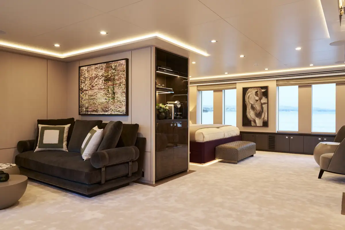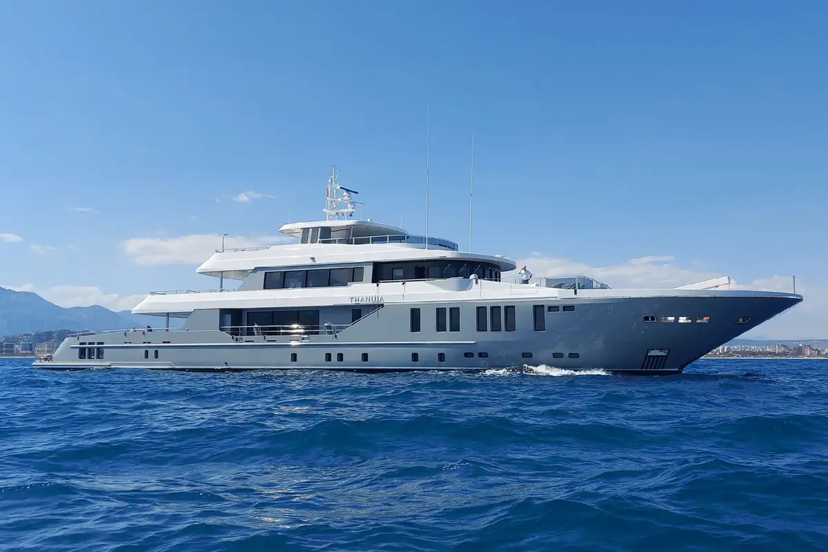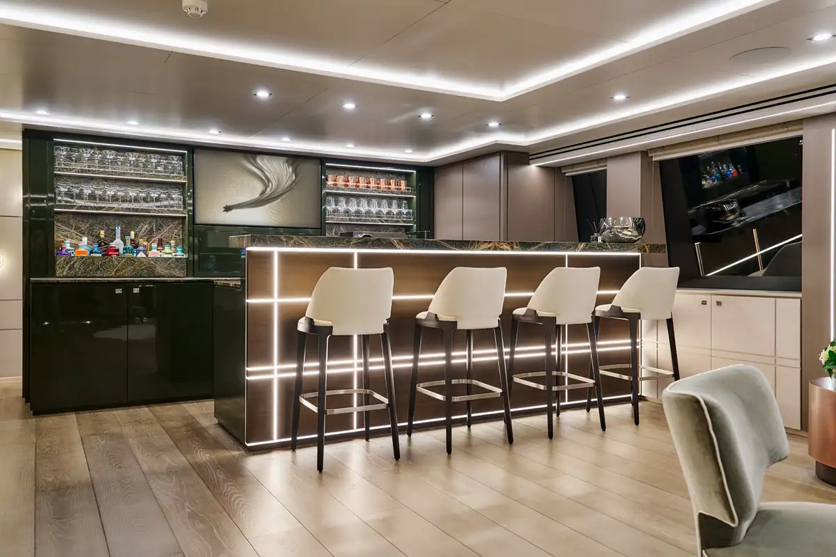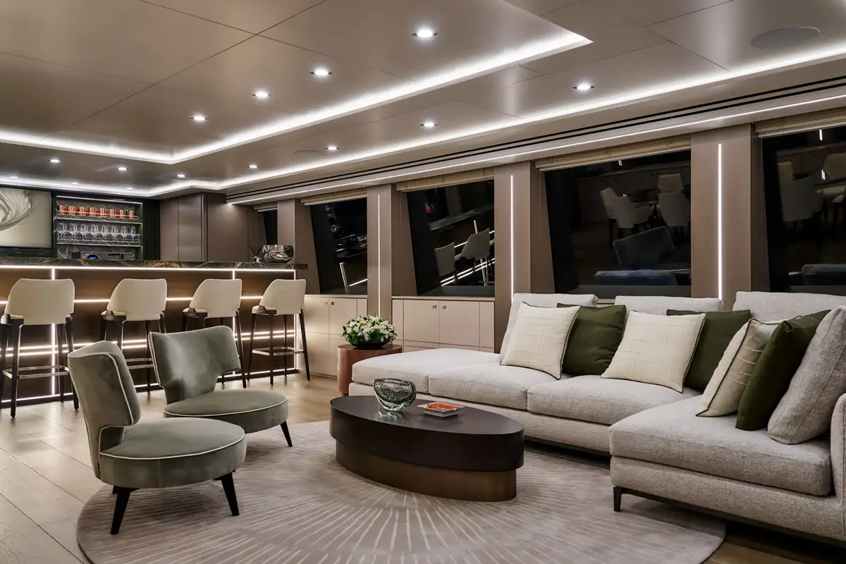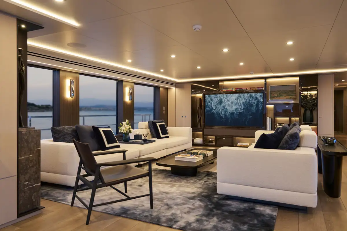 Delivered in 2024 following a two-year rebuild, THANUJA was stripped back, extended by eight metres, and completely reimagined inside and out. Clean lines and tactile materials define the interior – deep mahogany, shell marble, and bronze sculptures set a refined tone, complemented by light oak floors, soft grey carpets, and natural light from expansive windows. The main deck lounge is bright and inviting, while the upper deck lounge offers a relaxed yet sophisticated space with a bar, dining for 10, and curated artwork throughout.