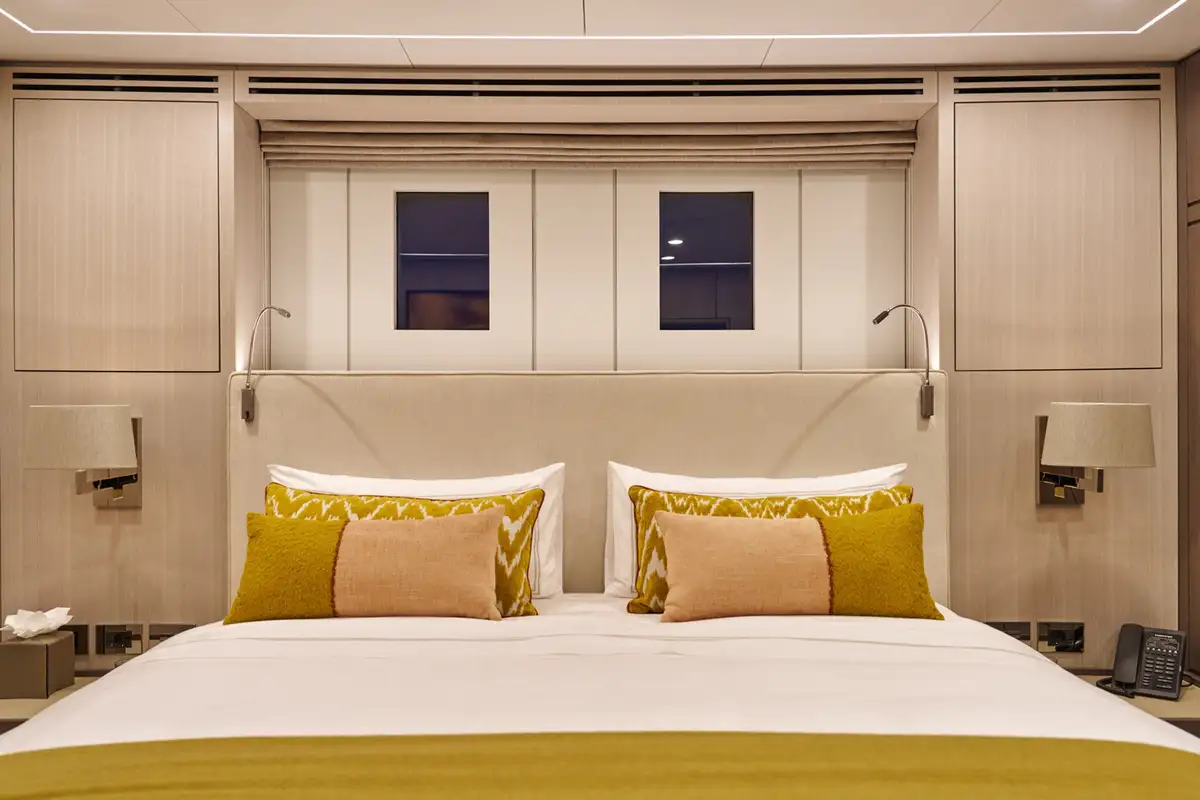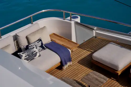 The main deck aft is perfect for relaxed mornings, with a large U-shaped sofa shaded by the upper deck. Above, a spacious dining table and built-in sofa at the stern offer the perfect setting for al fresco celebrations or peaceful nightcaps. Side decks lead to the foredeck, where a large sun pad and stylish lounge set the stage for bronzing by day or sunset soirées under the stars.
