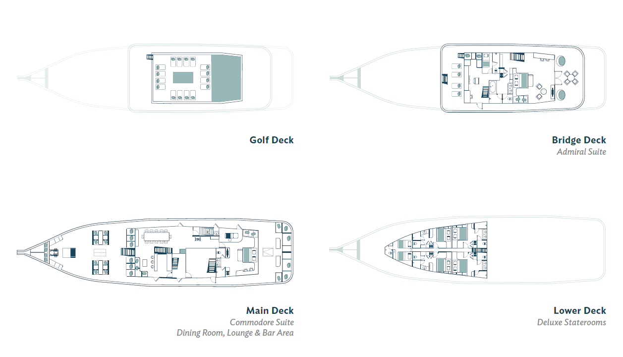 The master suite is a spectacular full-beam cabin that occupies most of the upper deck, with 270-degree panoramic views and its own private outside terrace. There are five other double cabins including a VIP suite and one twin-bed cabin, all furnished to five-star standard in contemporary-classic Indonesian style. Each cabin has its own lounge area and a private en suite bathroom with a jet shower.