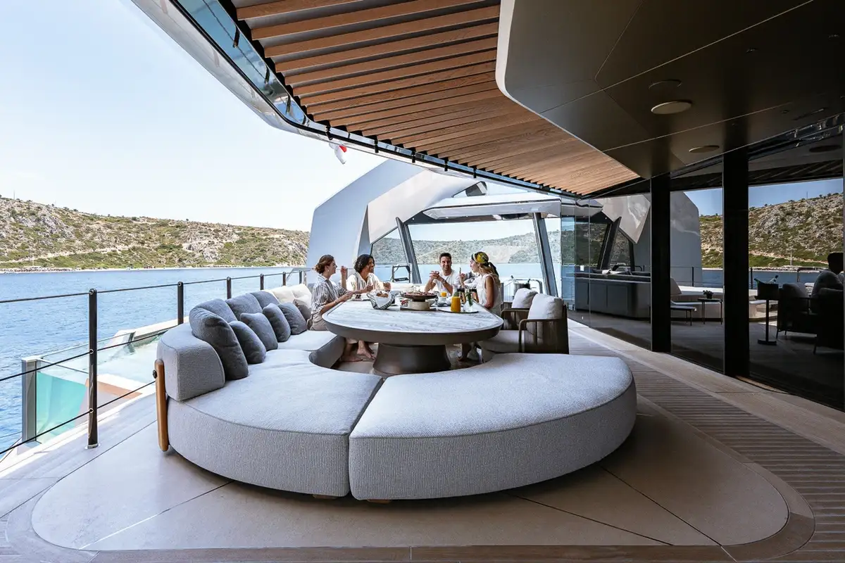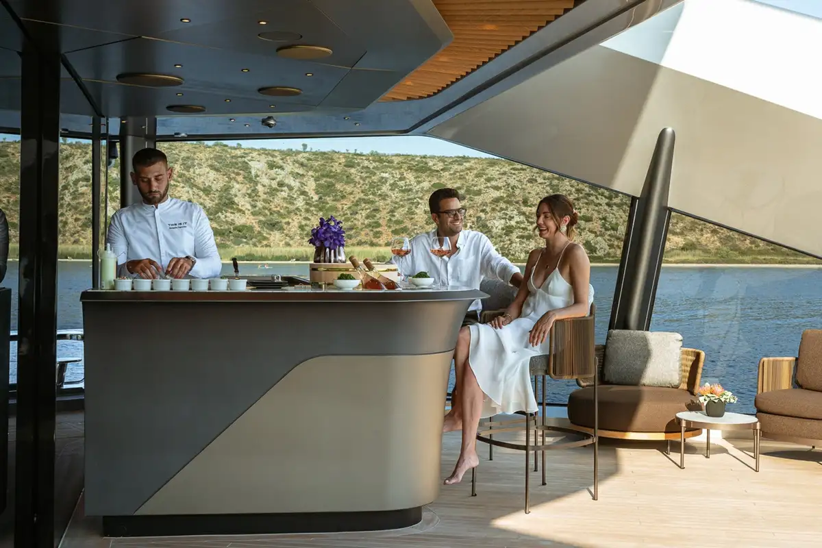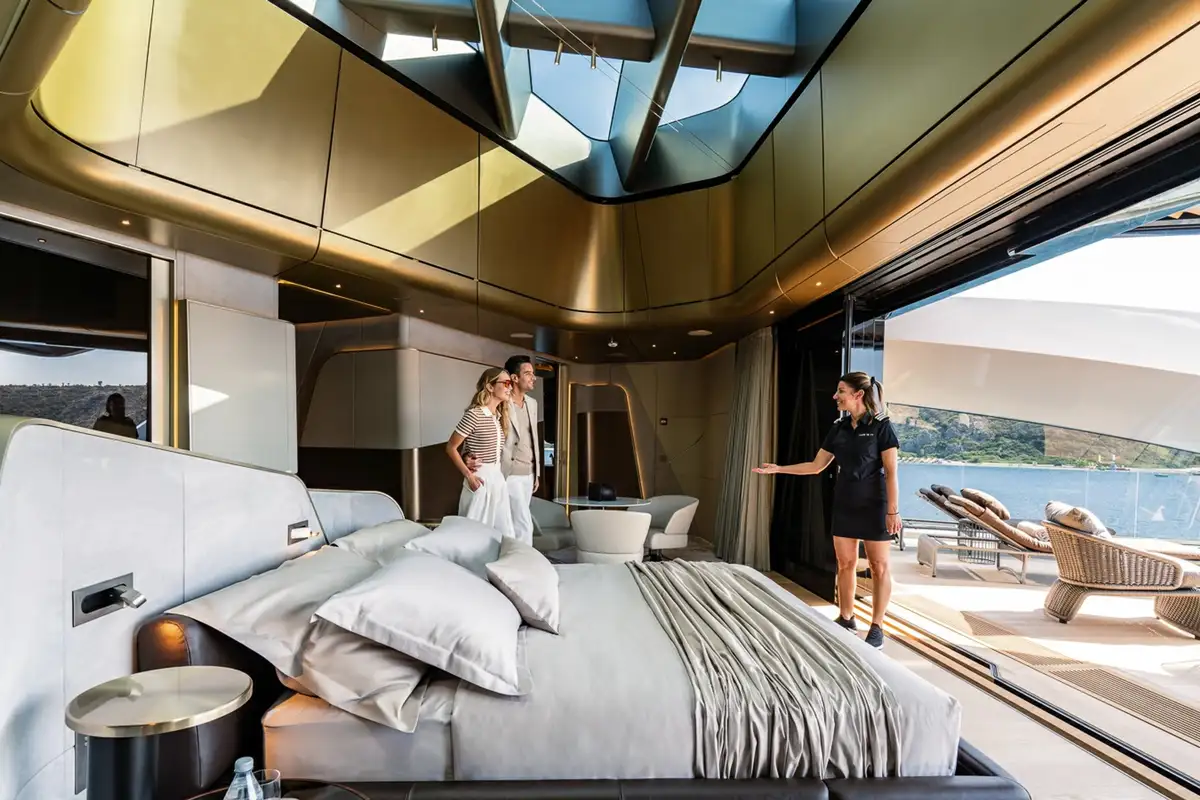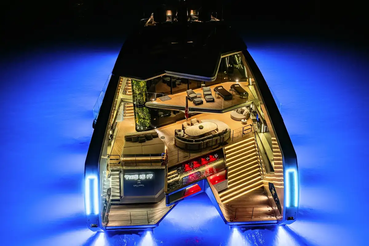 Accommodating up to 12 guests in five cabins, THIS IS IT ensures ultimate privacy and comfort. The master suite has panoramic views and a private terrace, while the guest cabins have all modern amenities. The yacht has state-of-the-art technology, including a fully integrated sound system and advanced entertainment options.