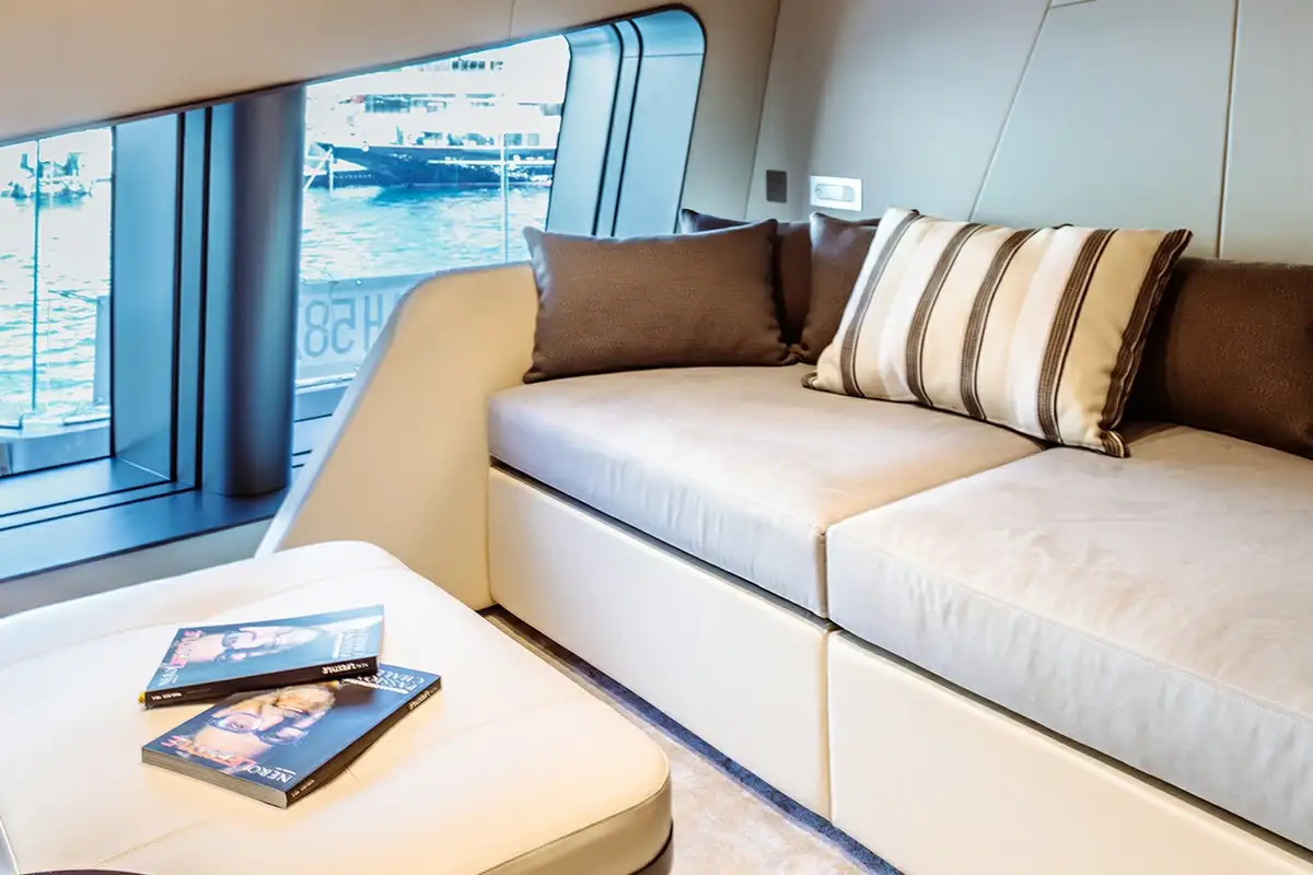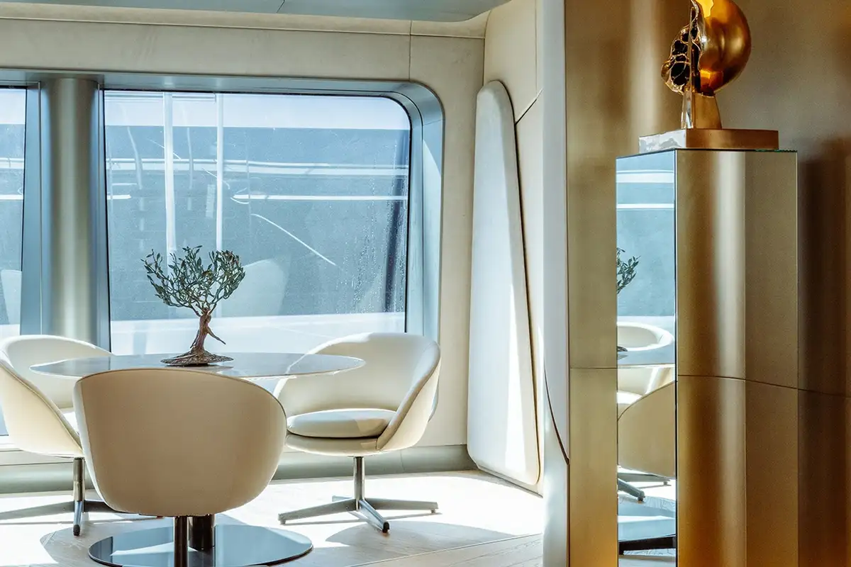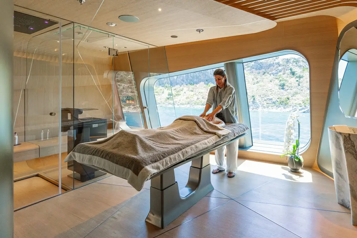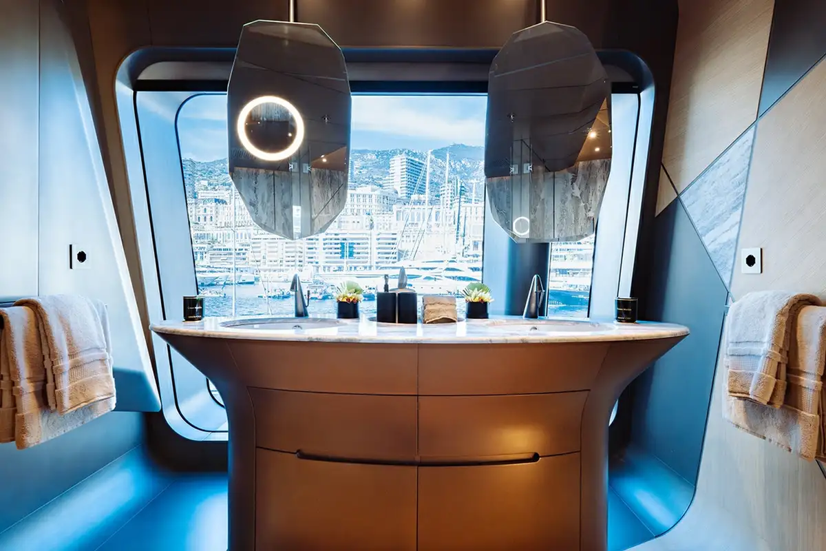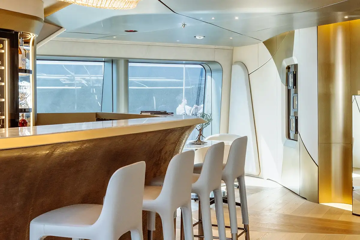 Designed by the renowned Italian Sea Group, the yacht is as stunning inside and out. The hydrodynamic design, inspired by marine creatures, sets her apart from conventional yachts, while her ultra-modern aesthetic challenges traditional norms in yacht design. Inside, the yacht’s minimalist elegance is complemented by luxe materials such as leather, Alcantara, oak, teak, and accents of gold, creating an atmosphere of refined luxury. Every detail has been carefully considered to optimise the guests’ experience.
