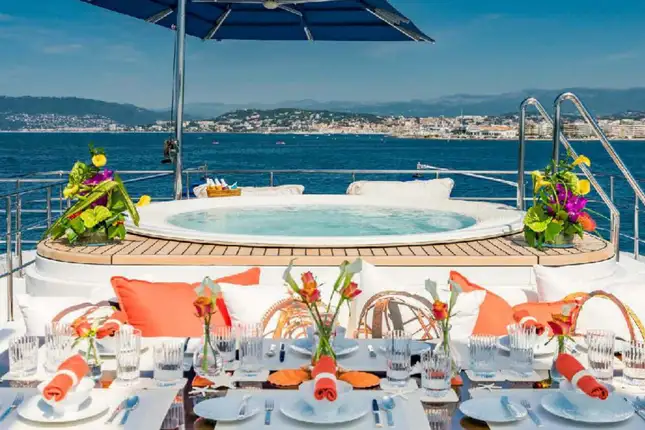 TIMBUKTU boasts an expansive sun deck that accommodates a full bar, upholstered seats and plenty of sun pads that surround a jacuzzi, which is located on aft and enjoys exceptional, uninterrupted views.
