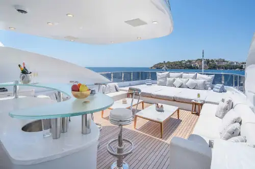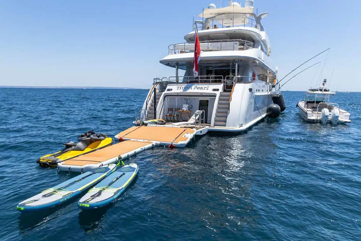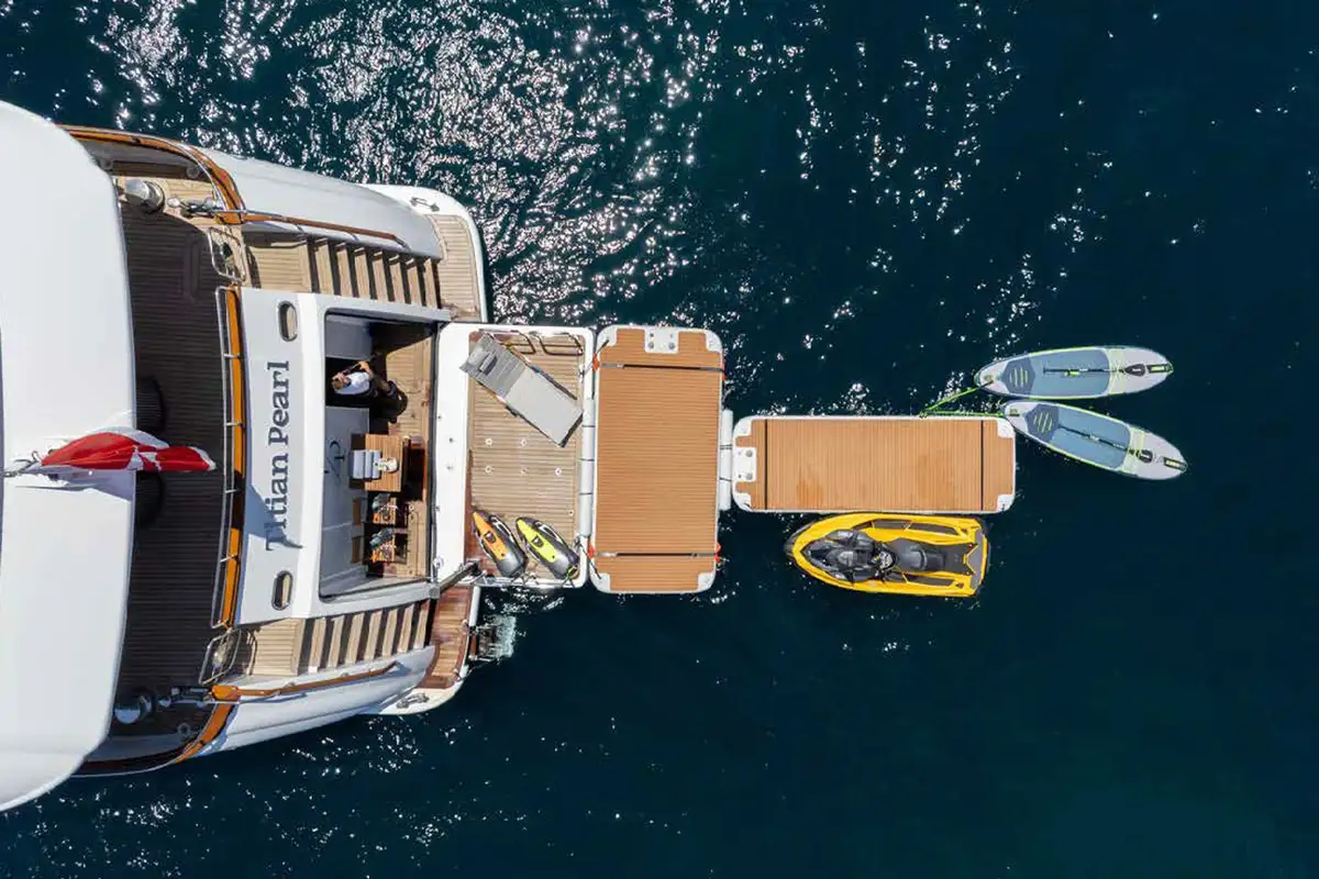 When it comes to activities, TITIAN PEARL is well-equipped to serve all your watersports needs. A brand new Axopar chase tender is perfect for taking the children waterskiing, going for a sunset island cruise, or taking you and your guests into port for some local delicacies. A beach club at sea level awaits for those needing a place to relax after all the watersports fun, with entry in and out of the water made easy with a wide step ladder and a generous swim platform.