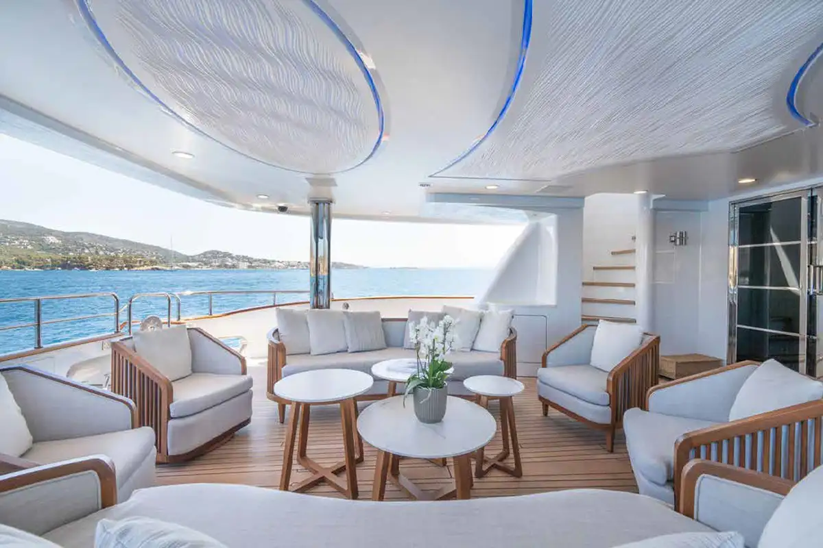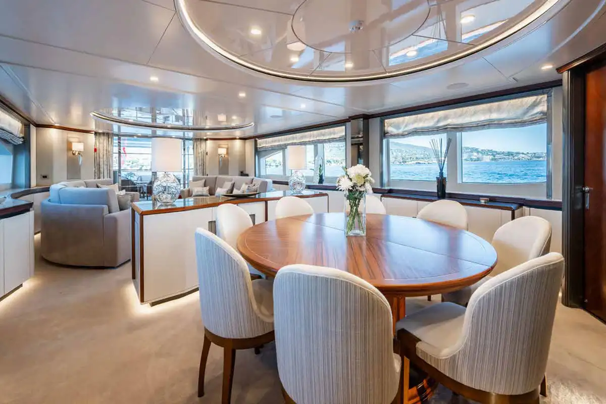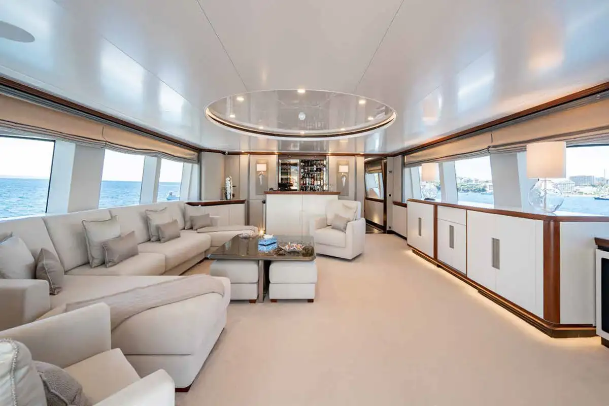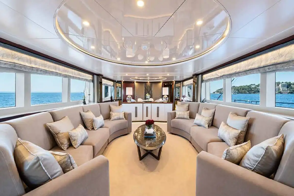 The interior of the yacht is based on a theme of contrasts. The different fabrics blend together through the constant exchange between antique and modern, marked geometry and flowing fabrics, dark colours and light shades. The main deck lounge and sky lounge are convivial areas with excellent entertainment systems, including a cinema screen for movie nights.