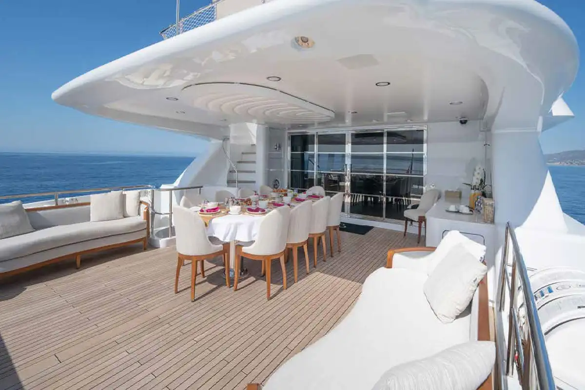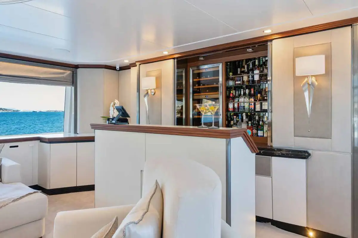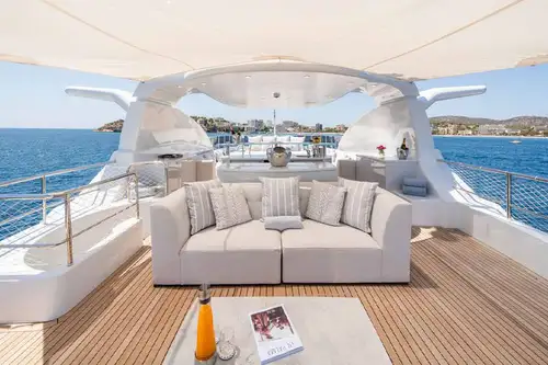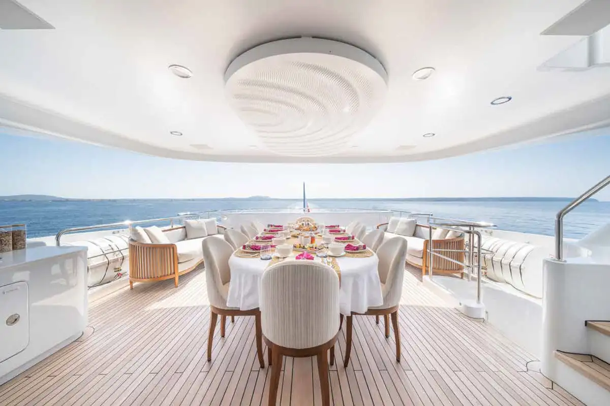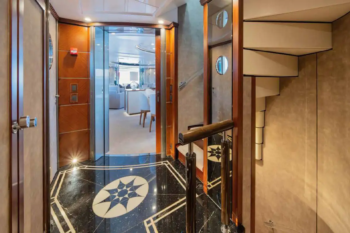 The interior of the yacht is based on a theme of contrasts. The different fabrics blend together through the constant exchange between antique and modern, marked geometry and flowing fabrics, dark colours and light shades. The main deck lounge and sky lounge are convivial areas with excellent entertainment systems, including a cinema screen for movie nights.
