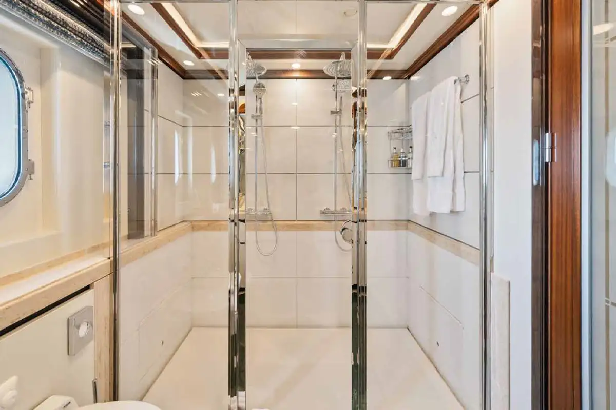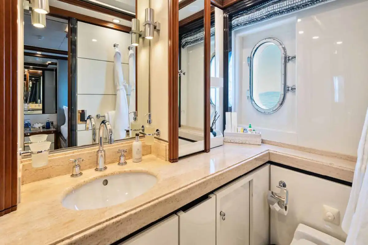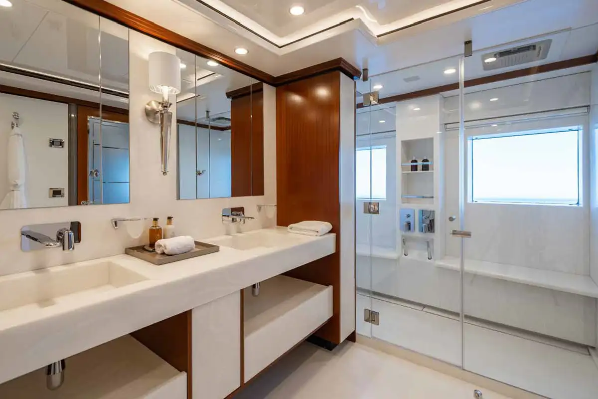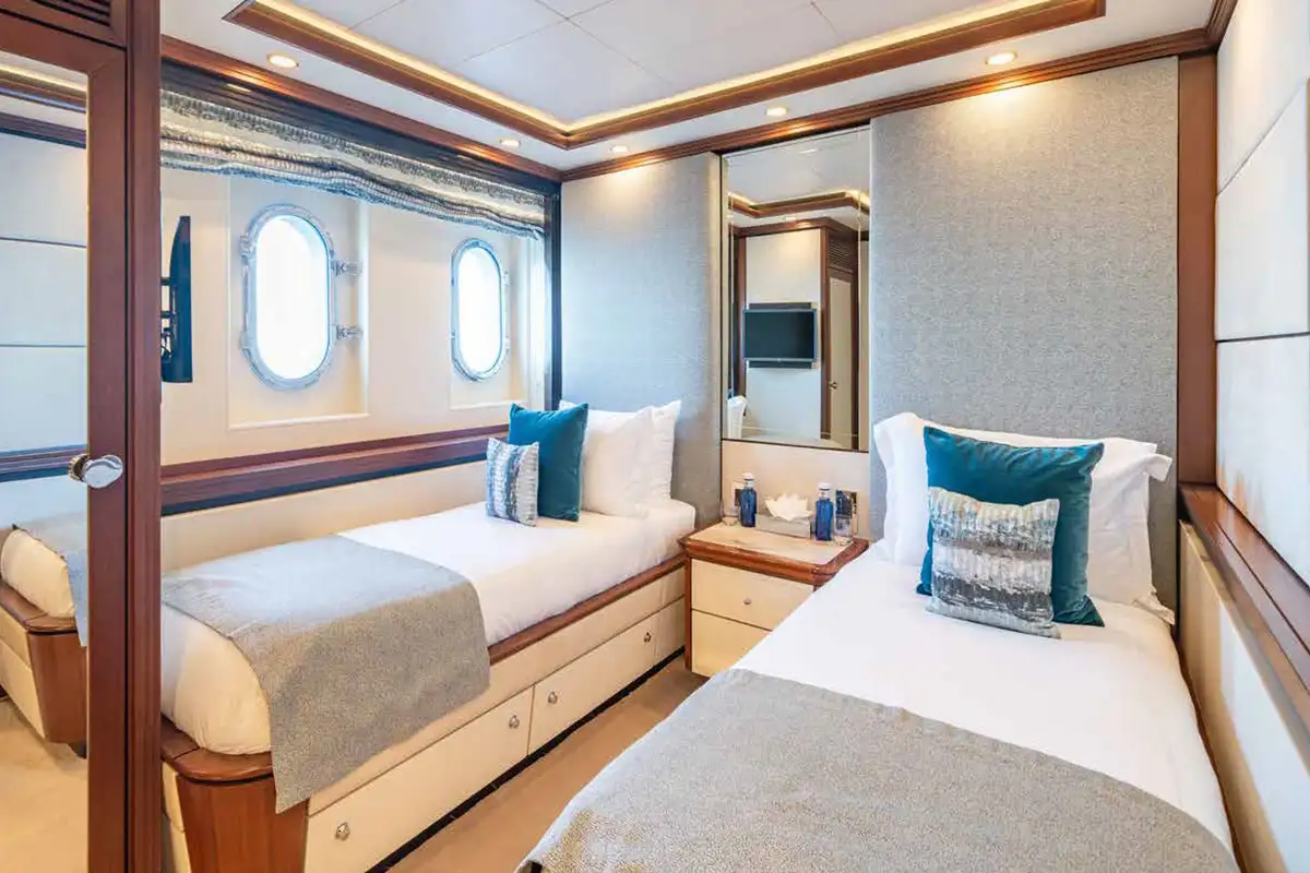 The full-beam master cabin, complete with a private office, en suite and walk-in wardrobe, offers pristine comfort and style. The cabin is bathed in natural light from both sides, allowing you to enjoy the morning sunrise as you get ready for another thrilling day on board. In addition, there are two further full beam VIP cabins on the lower deck, with two twin cabins in between that are perfect for children.