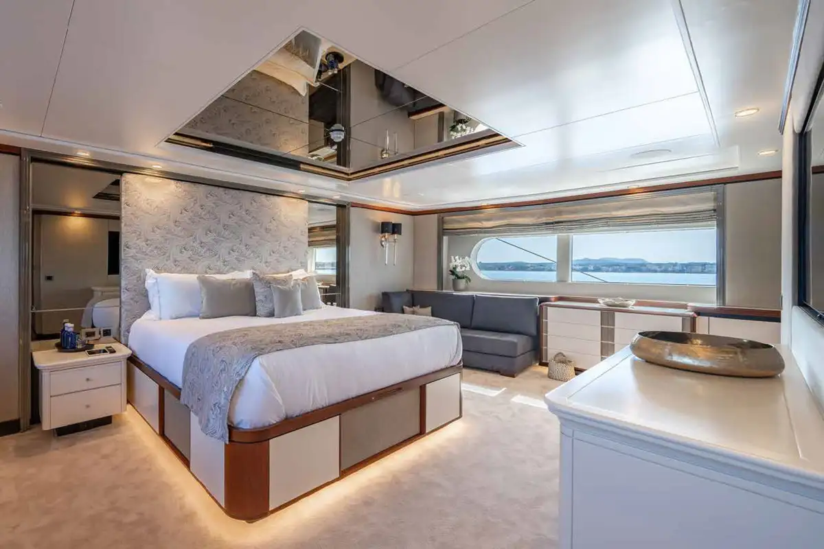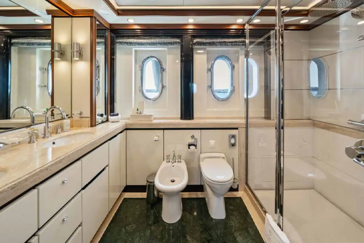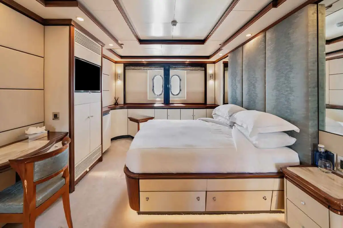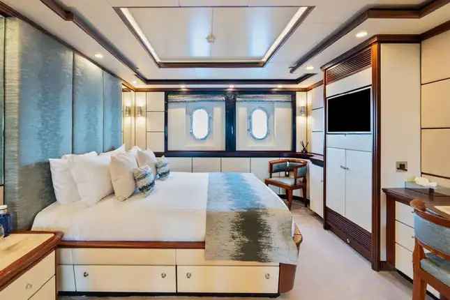 The full-beam master cabin, complete with a private office, en suite and walk-in wardrobe, offers pristine comfort and style. The cabin is bathed in natural light from both sides, allowing you to enjoy the morning sunrise as you get ready for another thrilling day on board. In addition, there are two further full beam VIP cabins on the lower deck, with two twin cabins in between that are perfect for children.