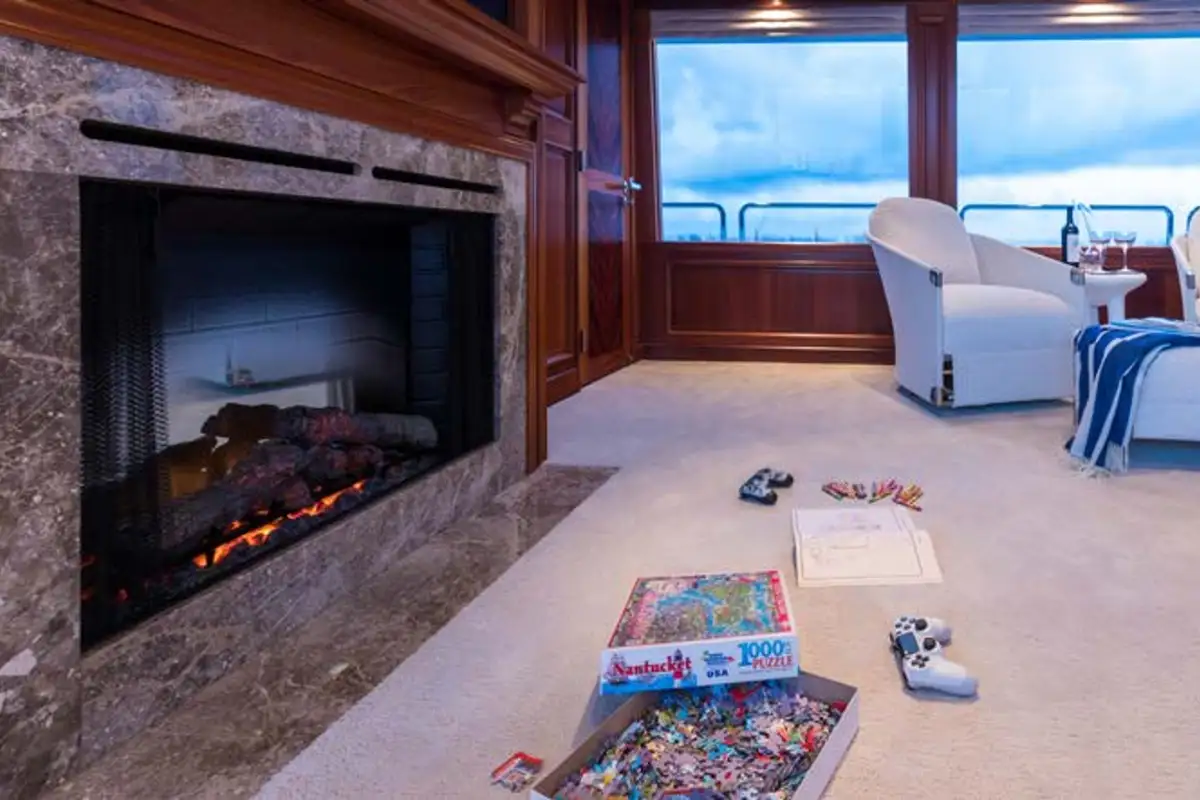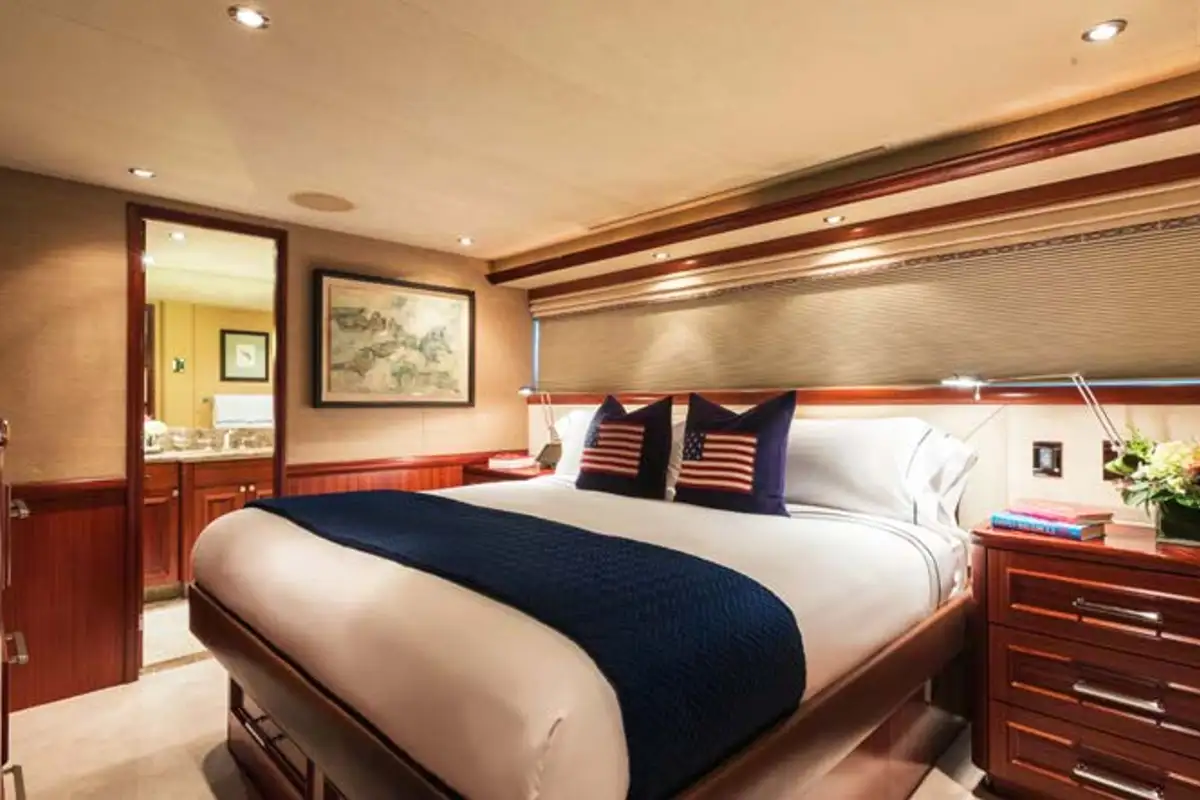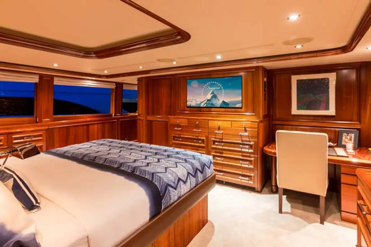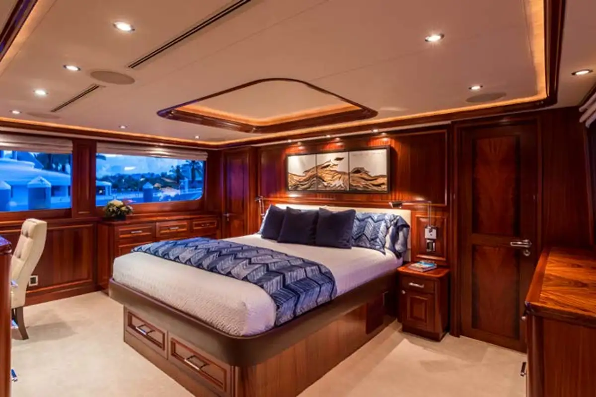 The Master suite is located forward on the main deck. It boasts a king bed, en suite bathroom, his and hers dressing rooms and office.