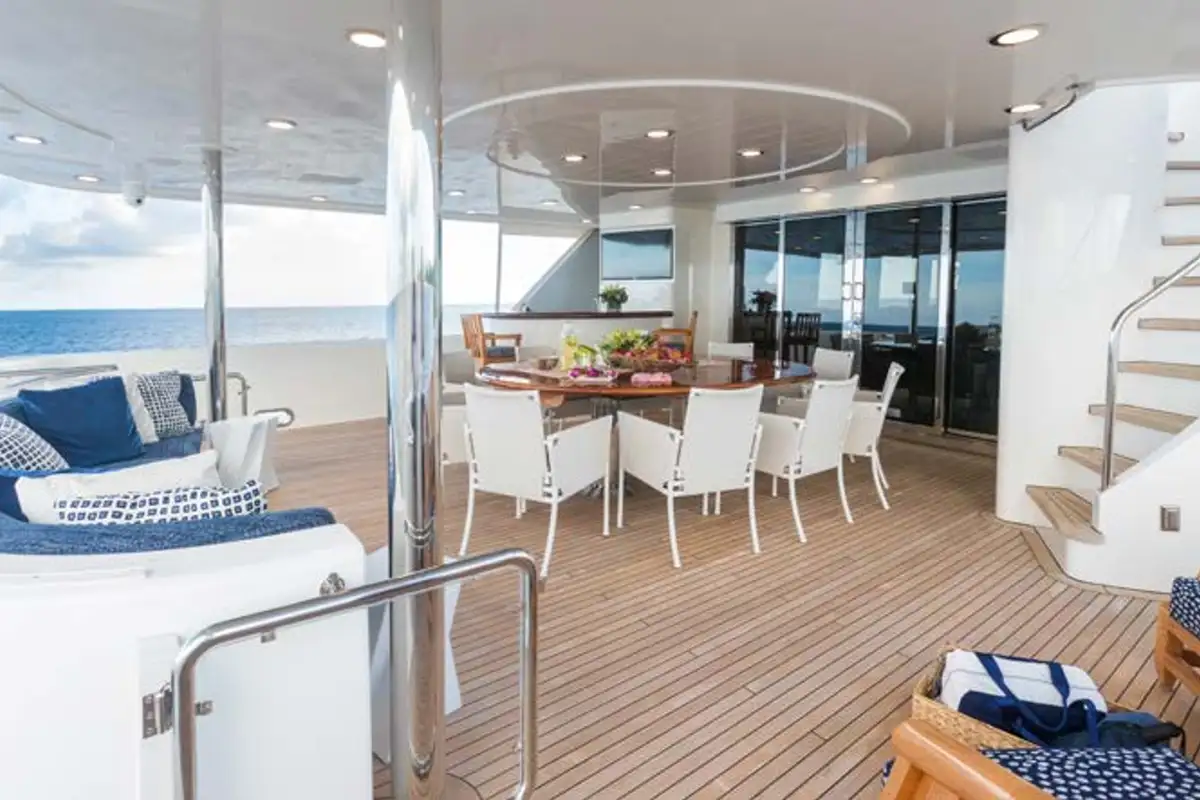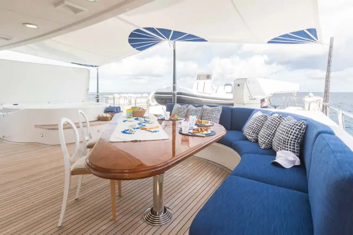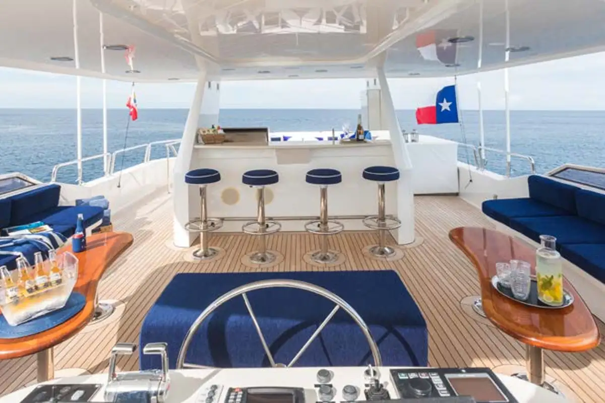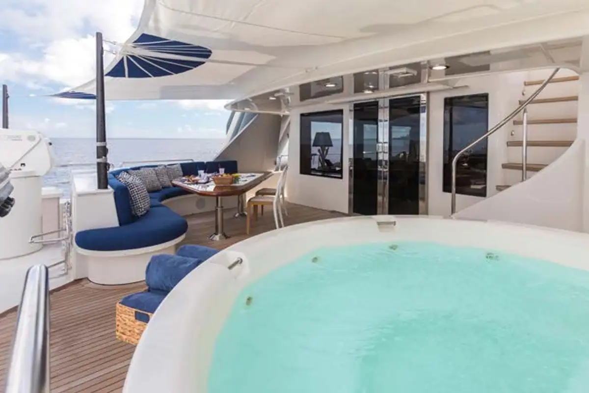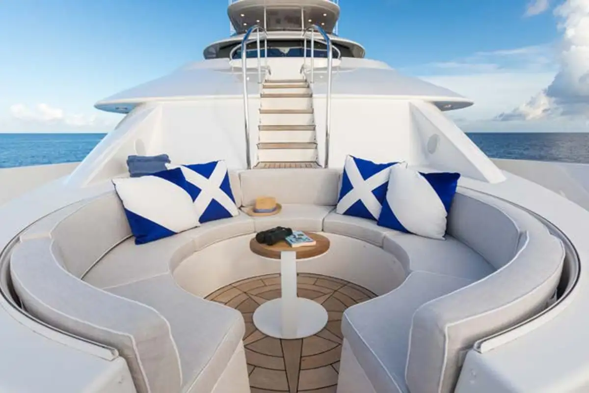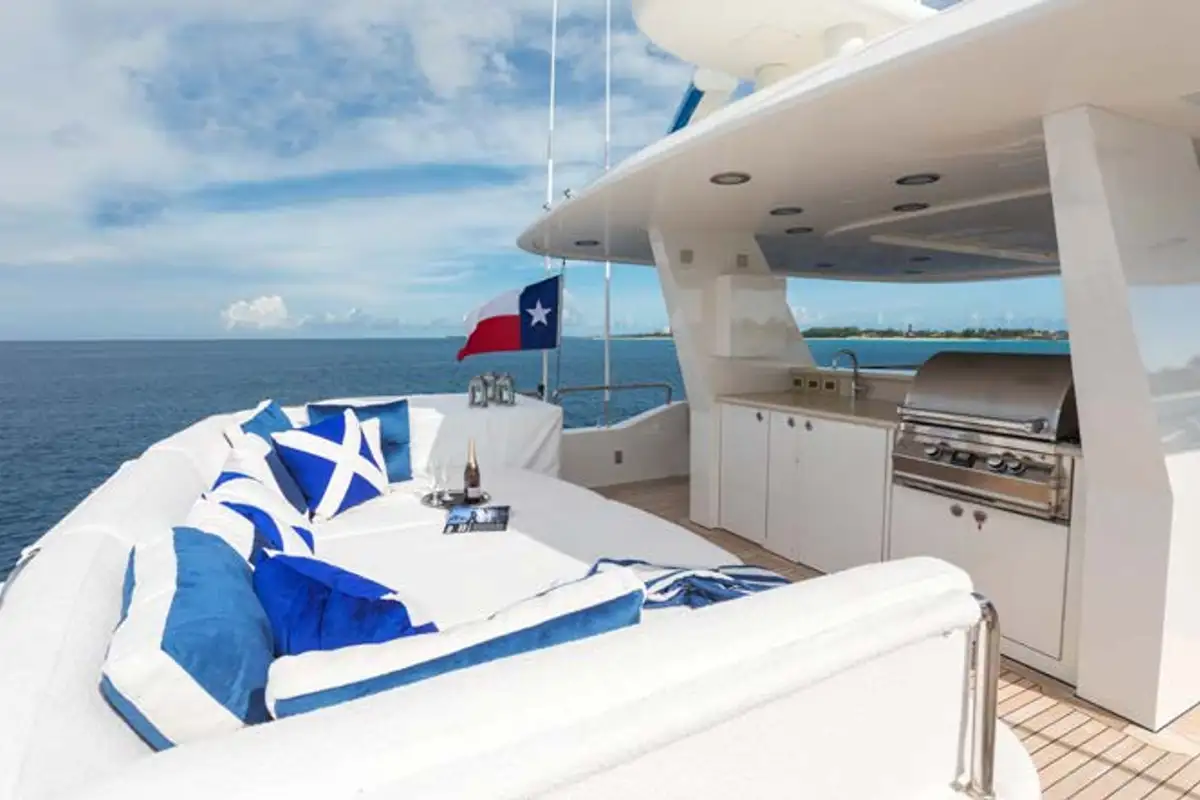 The flybridge deck features more sun pads, a BBQ grill, and two umbrellas adding optional shaded areas, providing an optimum spot for relaxation. Additionally, the bow offers a sunken private seating area.