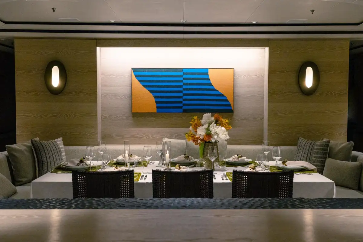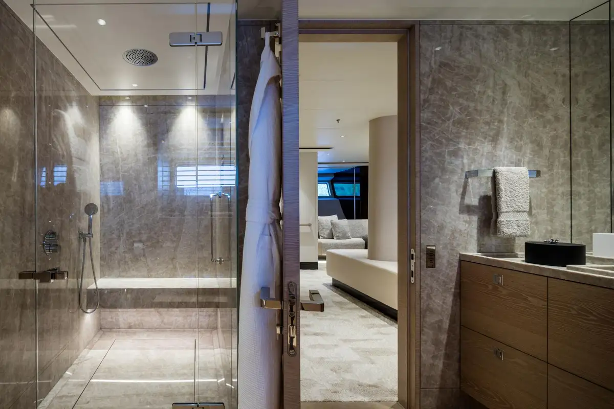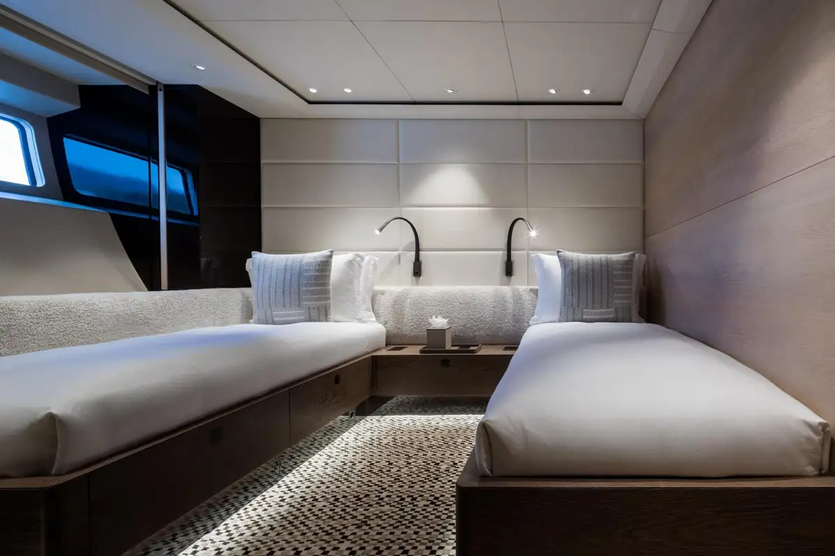 Step inside and you’re suddenly cocooned in contemporary luxury, yet still connected to the seascape outside with commanding views all round. With two separate saloons forward and aft, you’re sure to find a spot that suits your mood. As evening draws in you can dine outdoors in the elegant aft cockpit or gather around the table in the observation lounge. You won’t miss the sunset, whichever you choose.