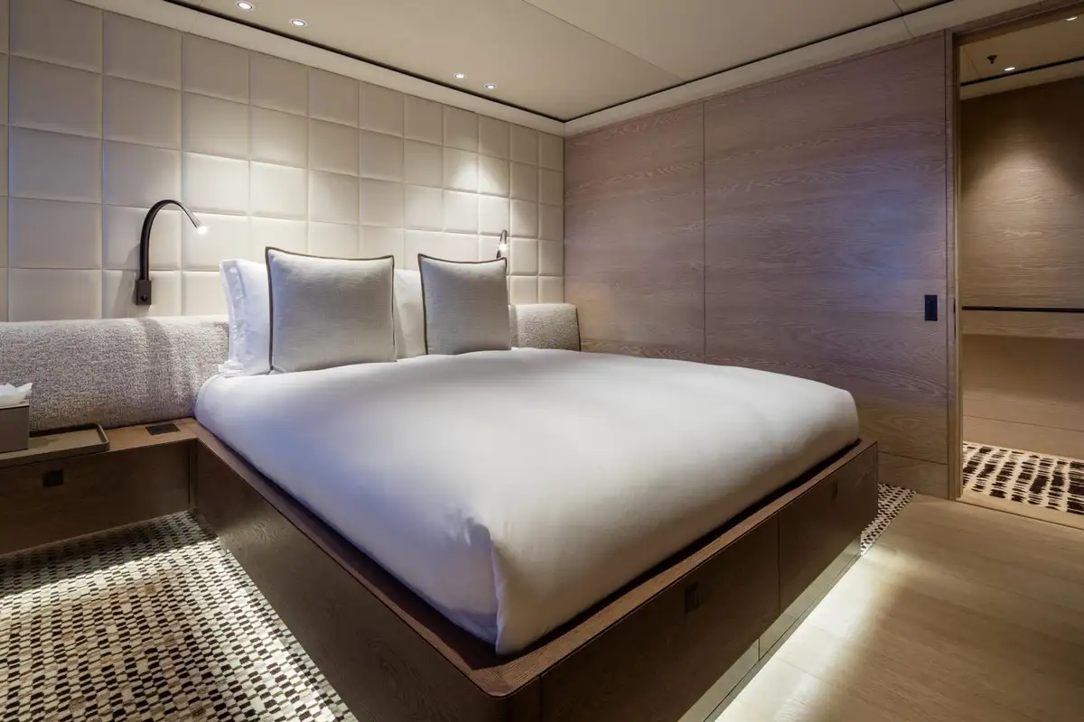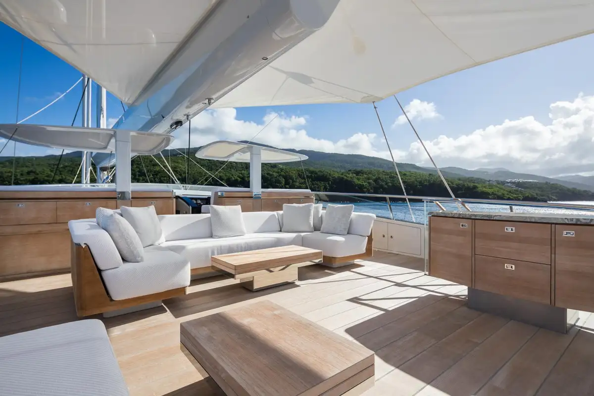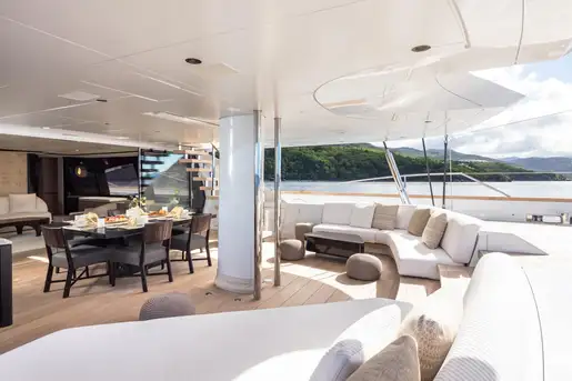 The flybridge is a spacious, stylish lounge with sumptuous sofas and coffee tables which converts into an elegant open-air dining space with a BBQ grill. After lunch you can slide onto a sunpad up here, relax in the cool shade of the main cockpit, enjoy the intimacy of the aft cockpit, or stroll down the elegant steps of the stern platform and slip into the sea. She comes fully loaded with small craft and toys: from Laser sailing dinghies and two powerful tenders to SeaBobs, paddleboards, wakeboards and more.