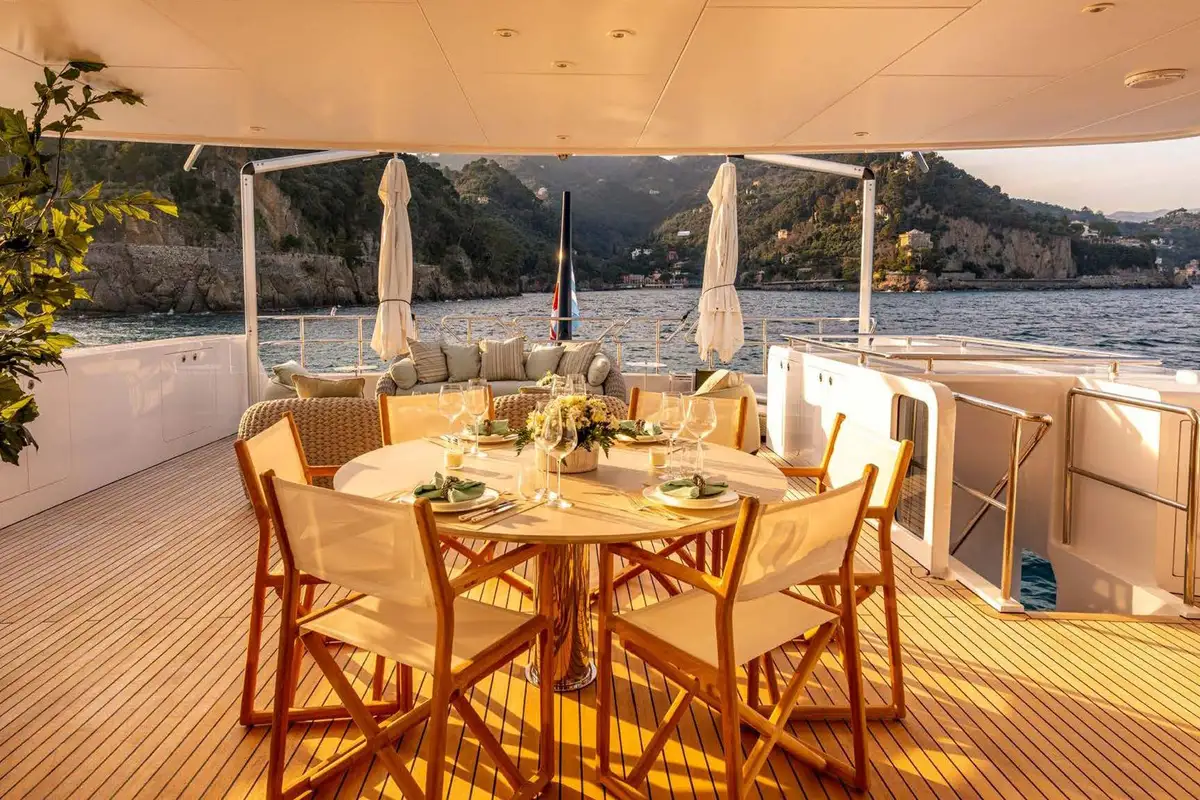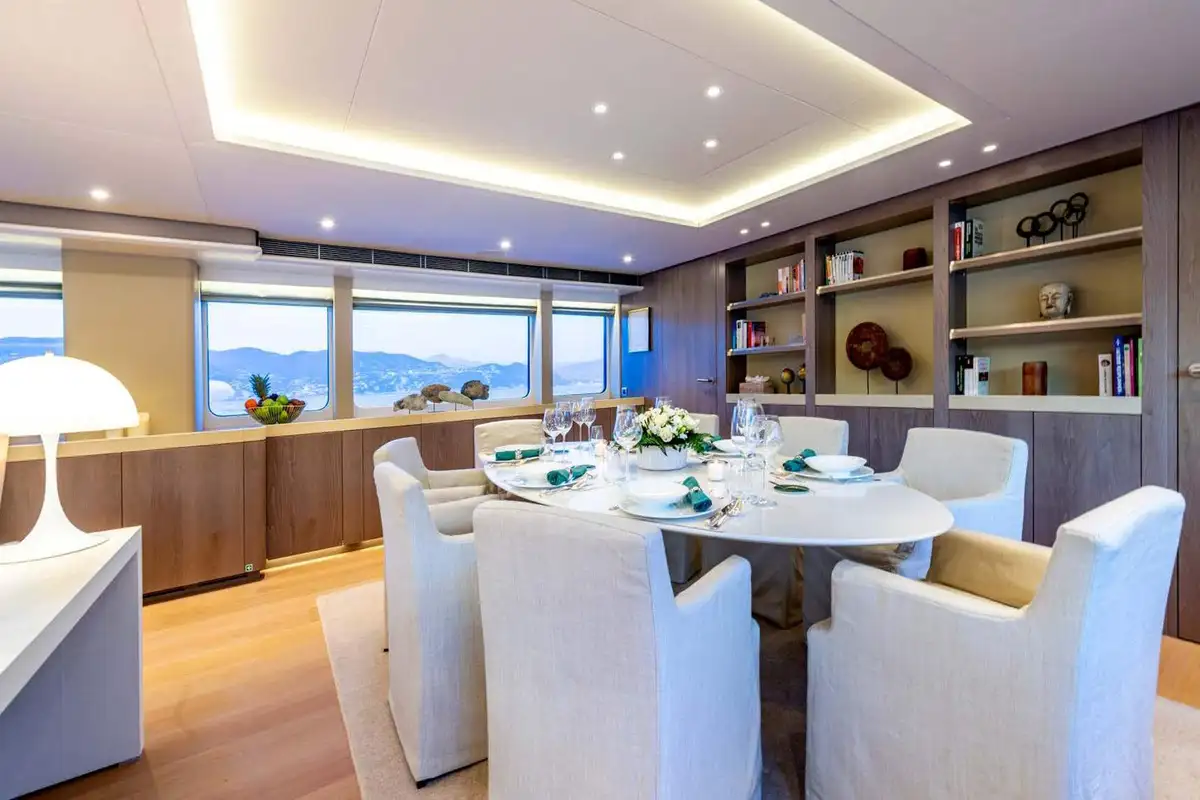 With accommodation for up to 10 guests in five beautifully appointed cabins, which includes a sumptuous full-beam master suite, three doubles, and a versatile twin. Her contemporary interiors are bright and welcoming, enhanced by large windows that draw in natural light, while her deck areas provide multiple options for al fresco dining, entertaining, or simply soaking in the scenery.