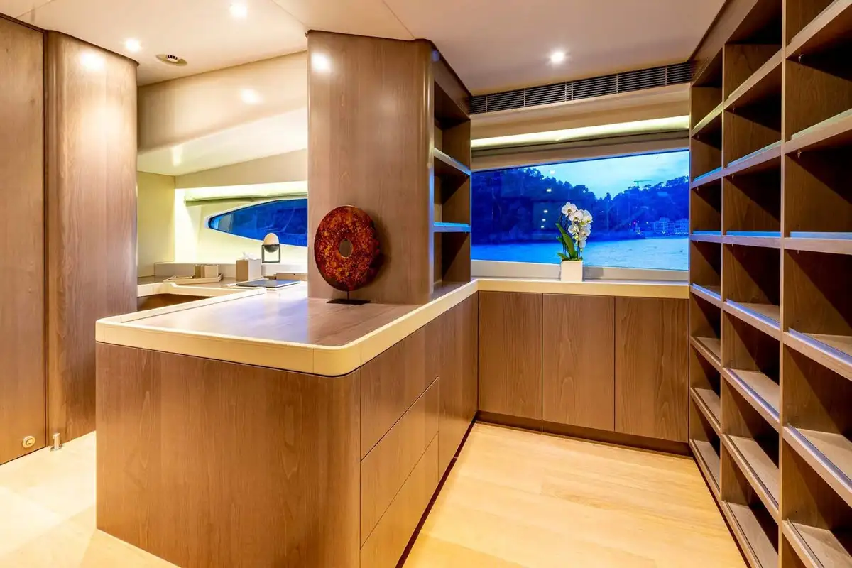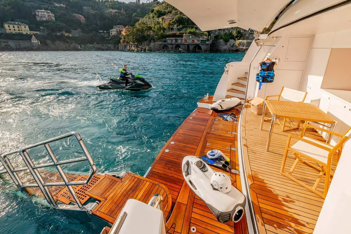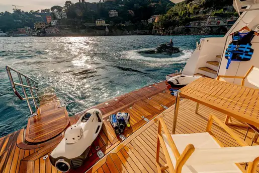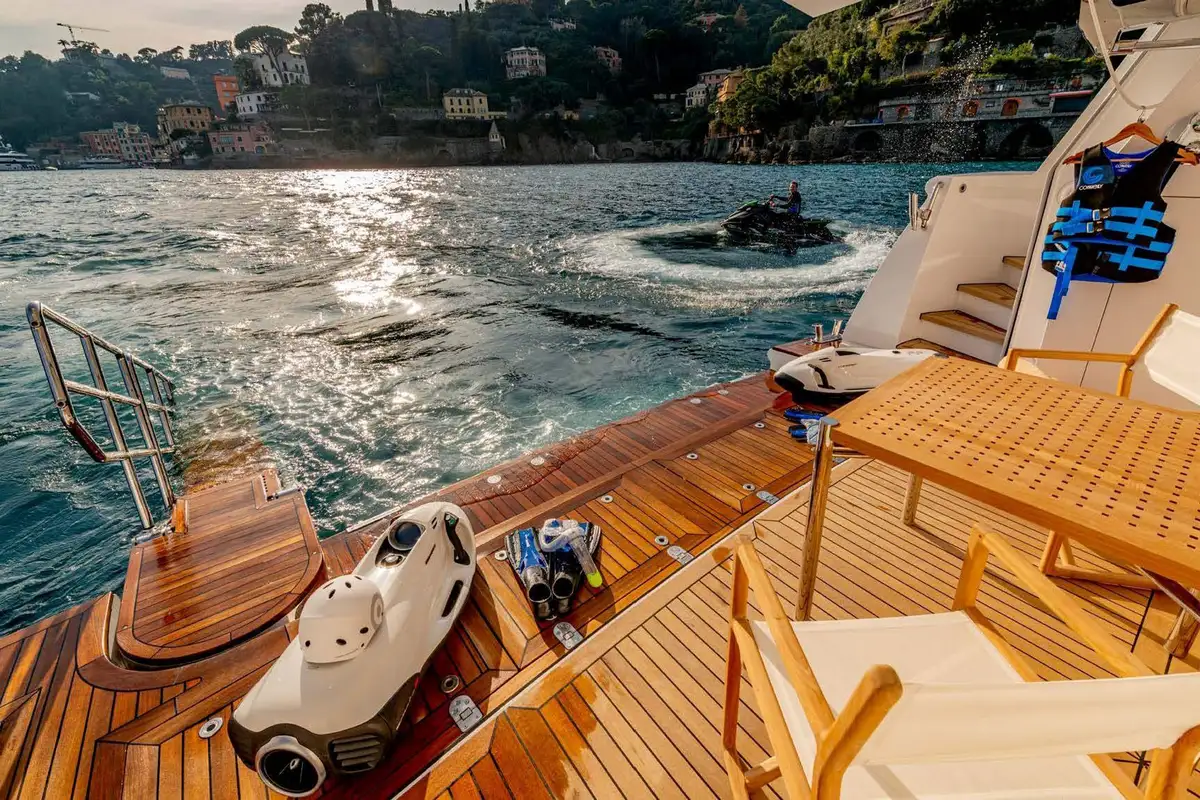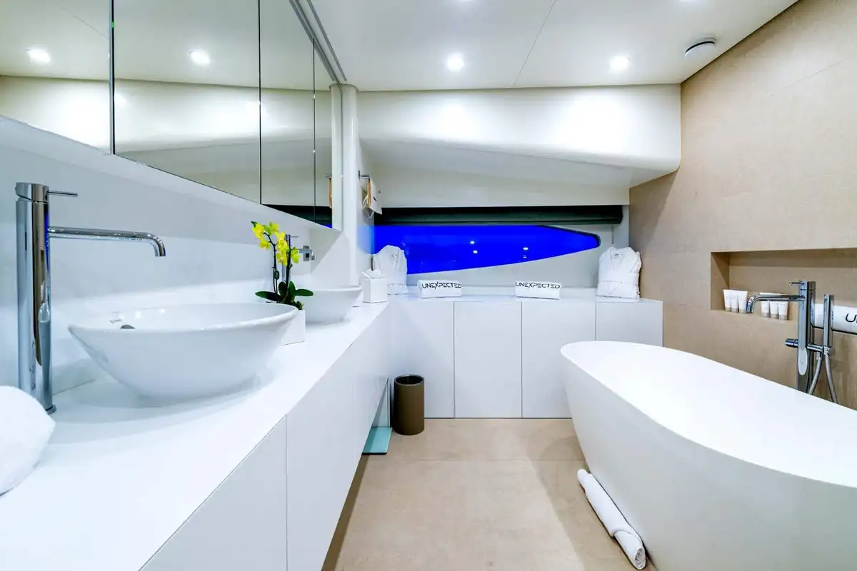 For those who love to stay active, UNEXPECTED is equipped with a well-stocked gym and an impressive arsenal of water toys. Thrill-seekers can make the most of two jetskis, a 6m inflatable water slide, SeaBobs, an eFoil, kitesurfing and windsurfing gear, wakeboards, kayaks, and paddleboards. For more relaxed days, explore the coastline from her Capelli Tempest tender or enjoy snorkelling and fishing straight from the stern platform.
