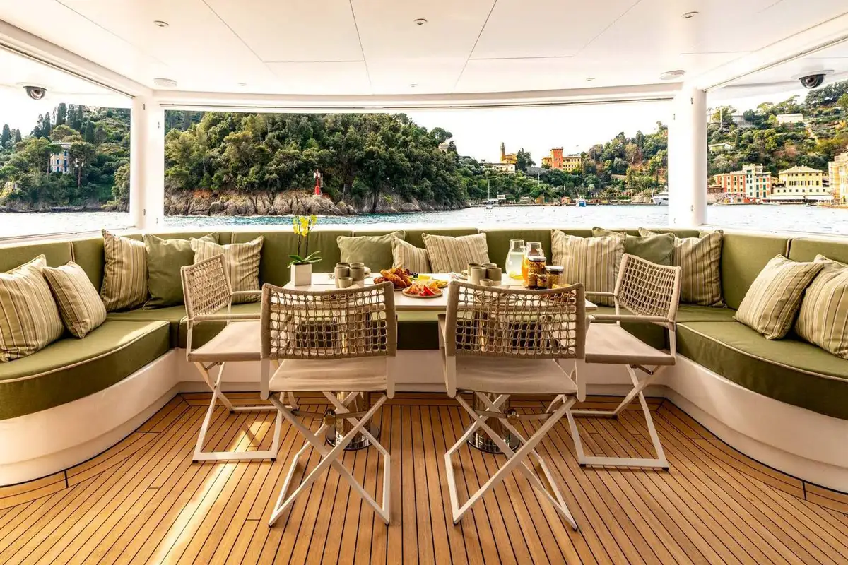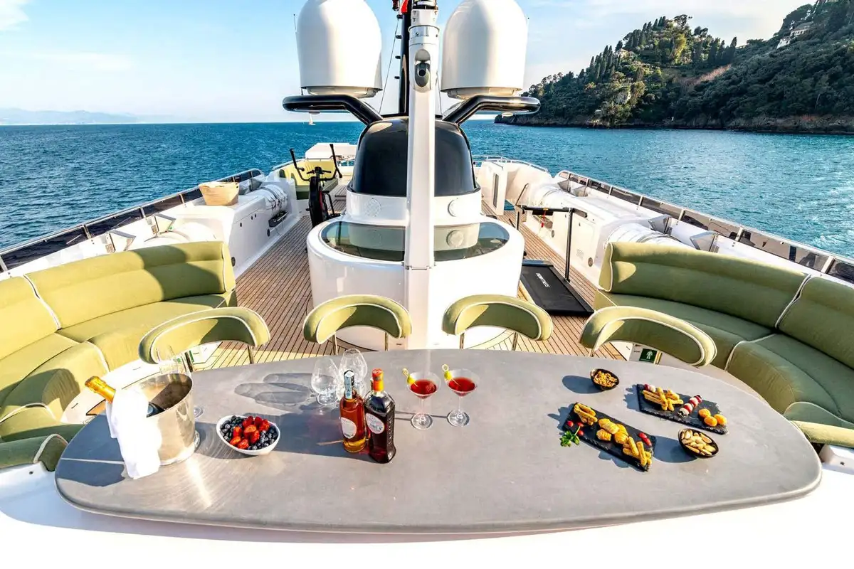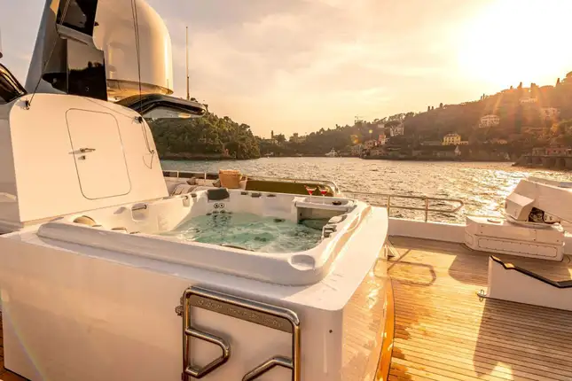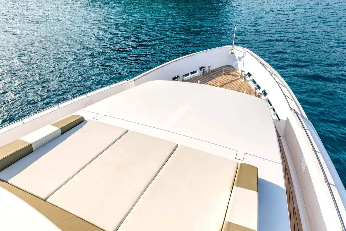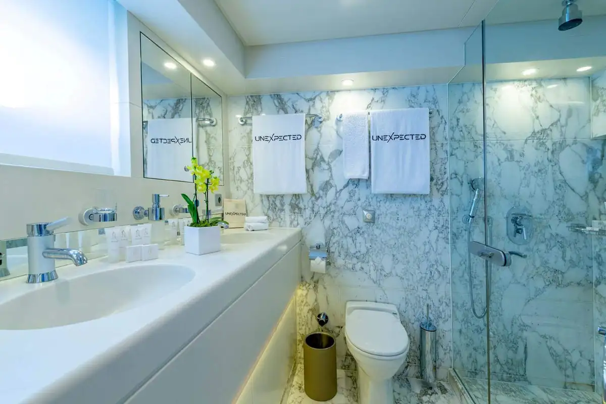 The yacht’s tri-deck configuration offers ample outdoor living. The main and bridge decks each feature shaded dining spaces for up to eight guests, while the sundeck is the ultimate spot for sunbathing or unwinding in the Jacuzzi. Whether you’re enjoying a quiet morning coffee with panoramic views or hosting a lively evening under the stars, UNEXPECTED sets the scene perfectly.