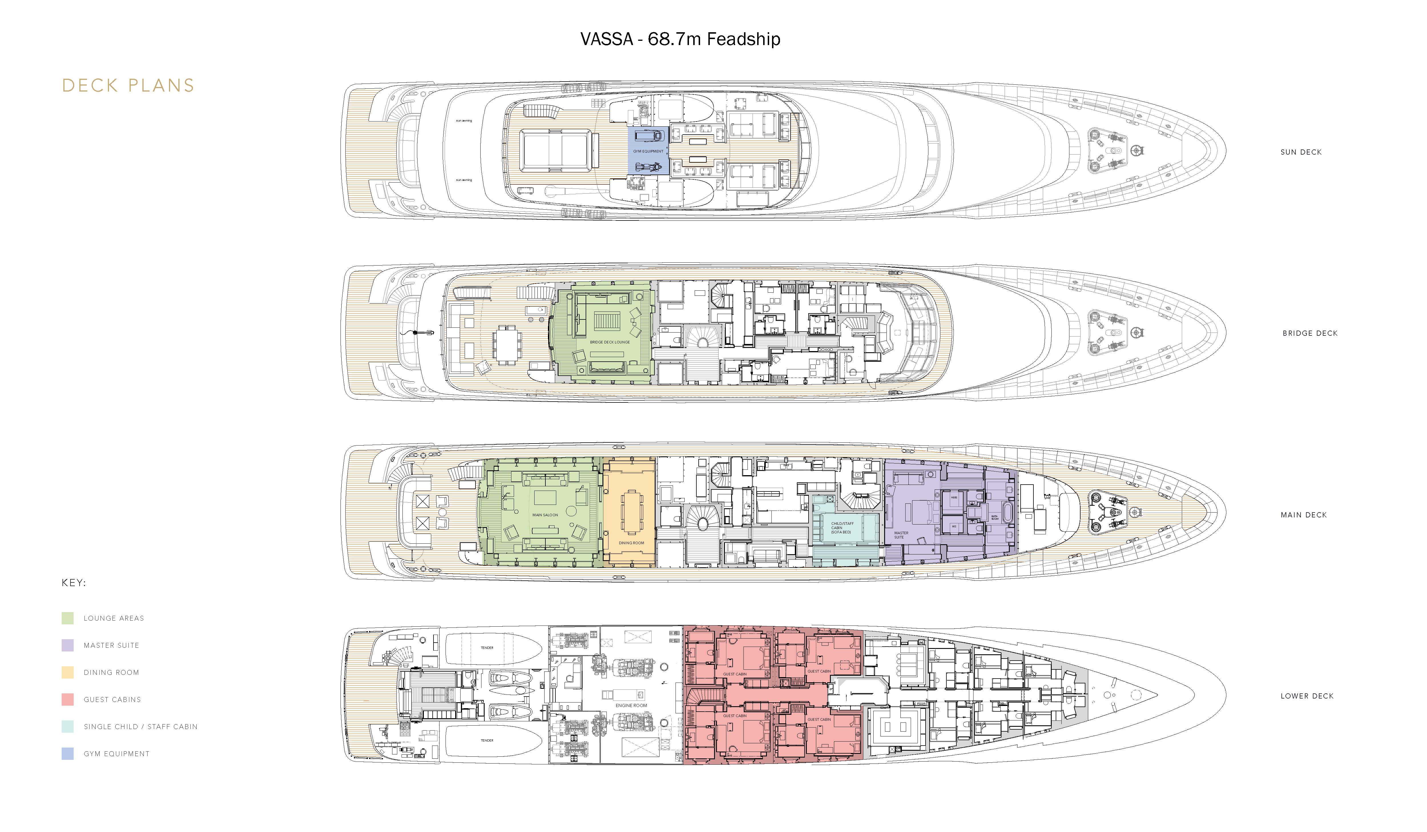 VASSA accommodates 12 guests in six well-appointed cabins. The main deck master suite is a serene retreat with sweeping views, a private office, dressing room, and en suite. An additional single cabin aft of the master can be used for a single child or staff. On the lower deck, two doubles and two twins are thoughtfully arranged to offer privacy and comfort for every guest.