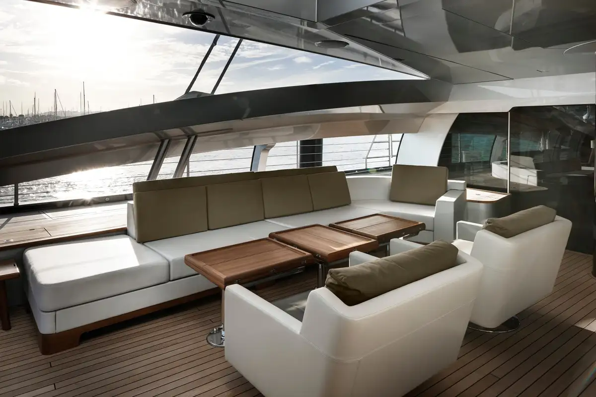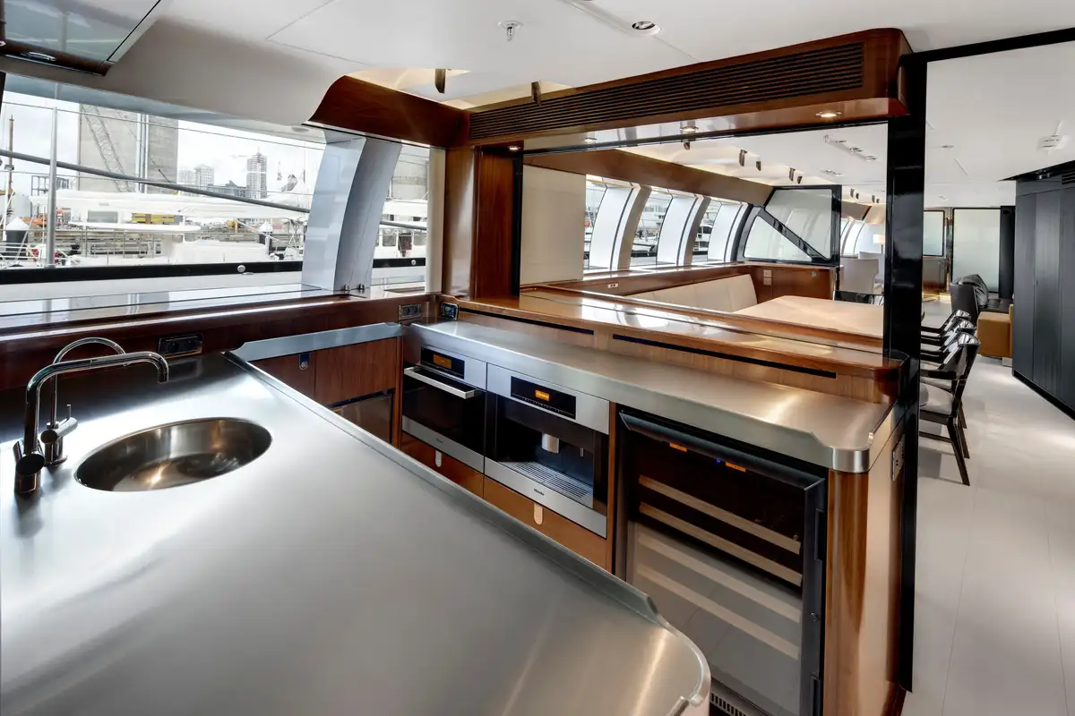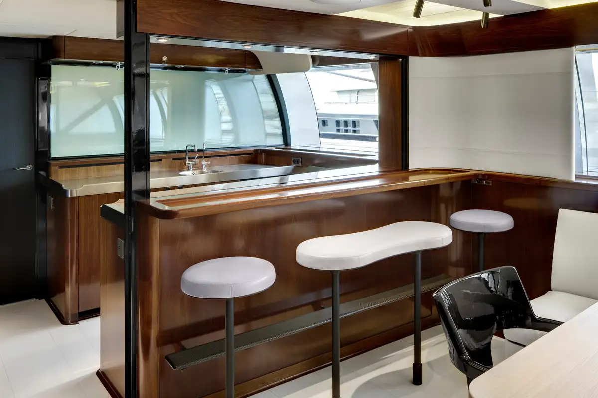 On the flybridge you'll find a lounge area with raised sunpads aft, a BBQ and a fully equipped bar and two folding biminis for shade. There are lounge areas either side and more open air dining on the main deck aft where shuttered vents on the roof deliver sun or shade as you wish and side windows glide down to open or close the space depending on the weather. There's even a projector and screen for movies under the stars.