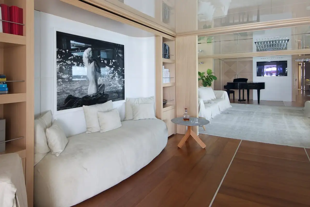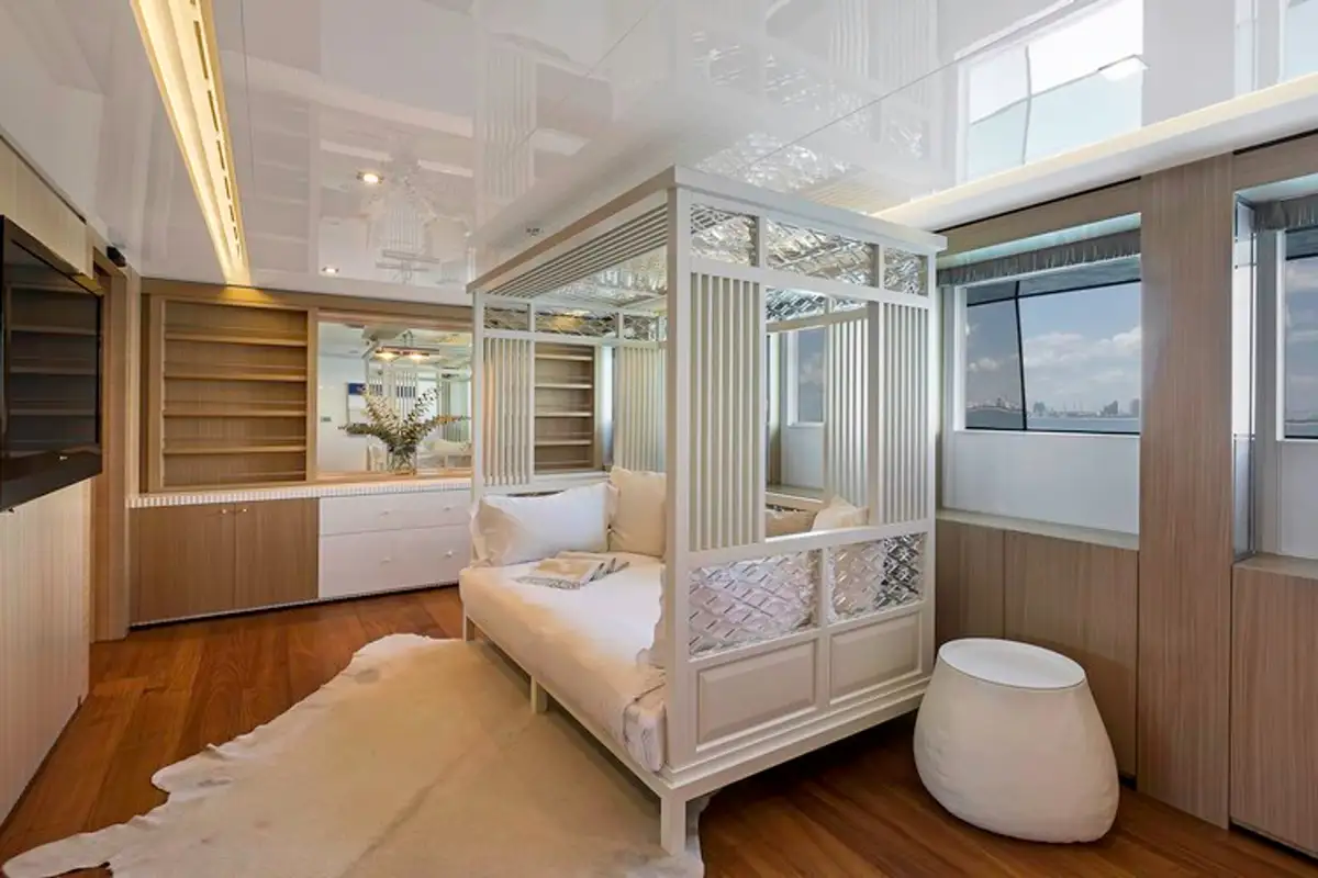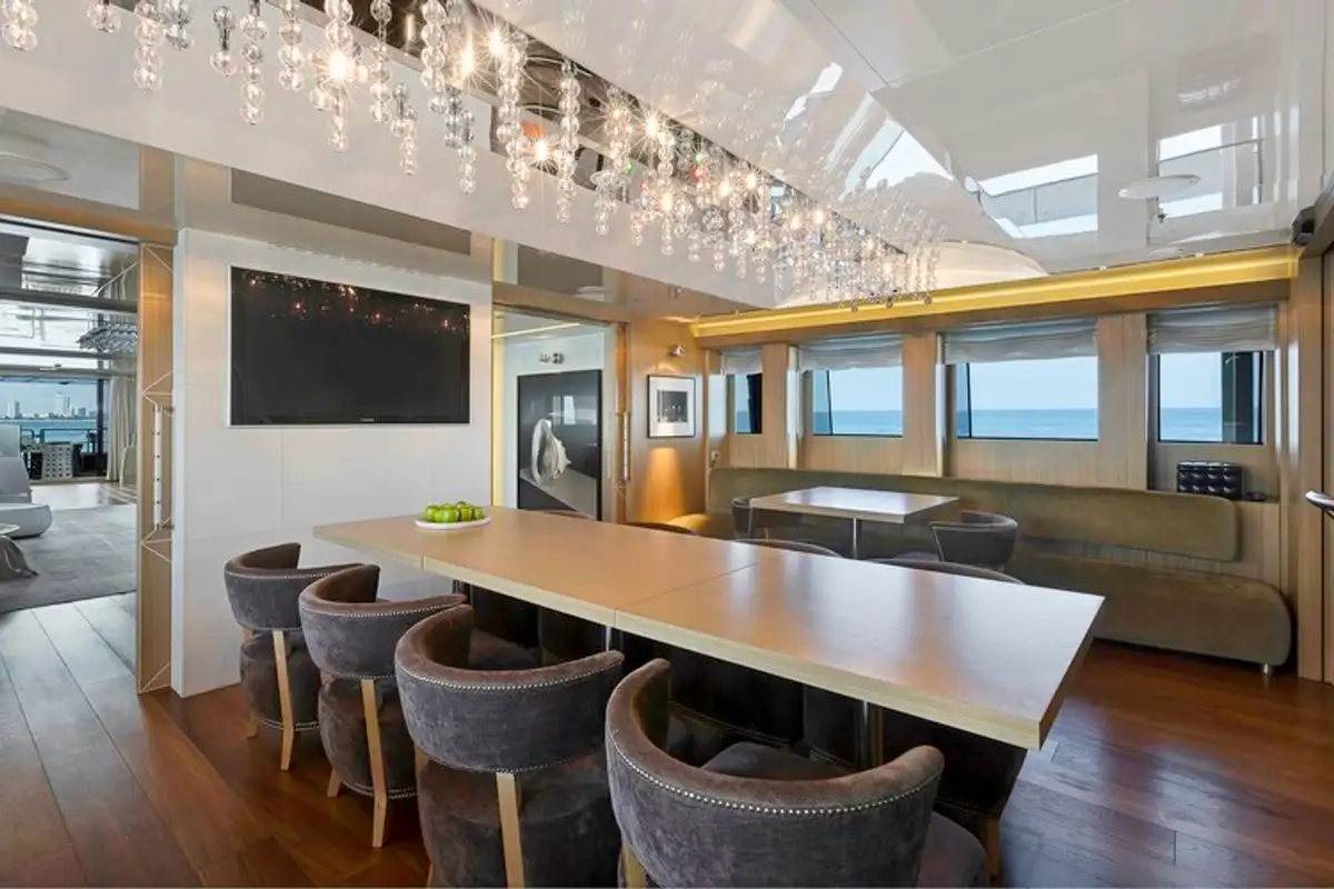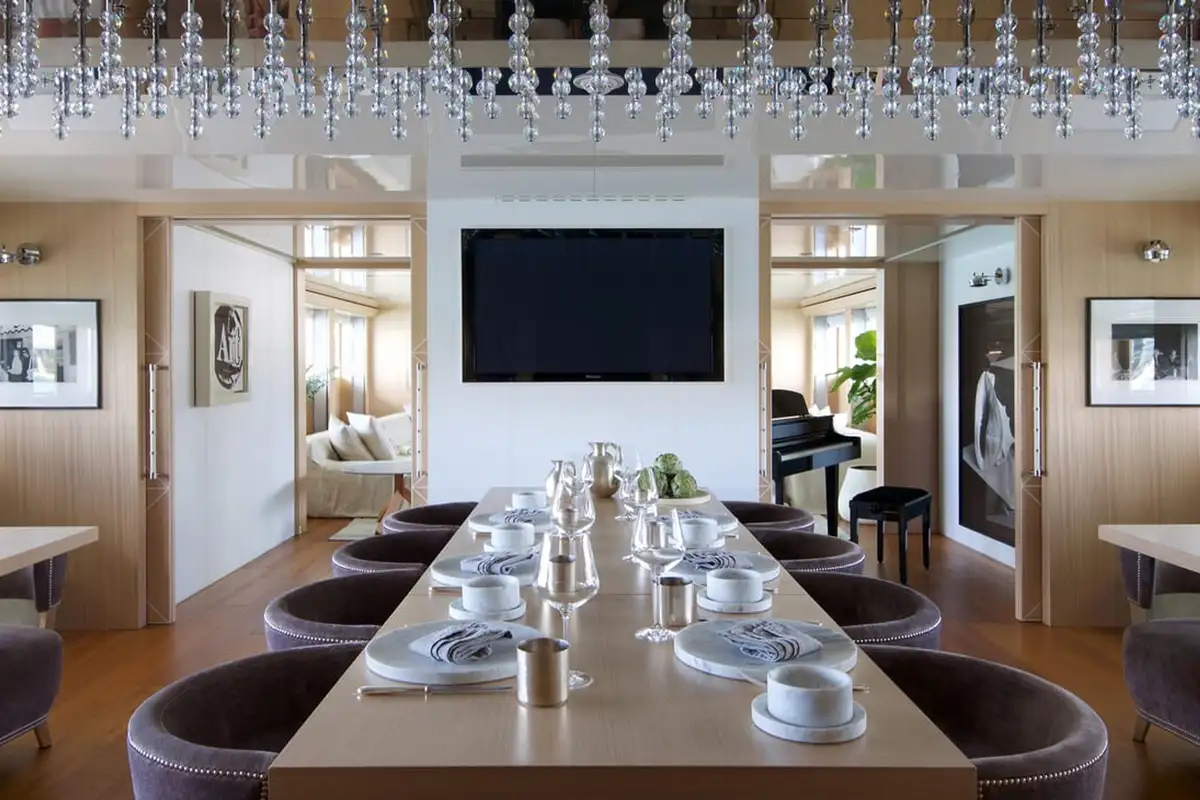 At the end of an action-packed day it’s time to dress for dinner. Your master suite has an extra-large walk in wardrobe and dressing room – on a charter this glamorous you can expect nothing less. Dinner is served in the main saloon, the table set beneath an exquisite droplet chandelier.