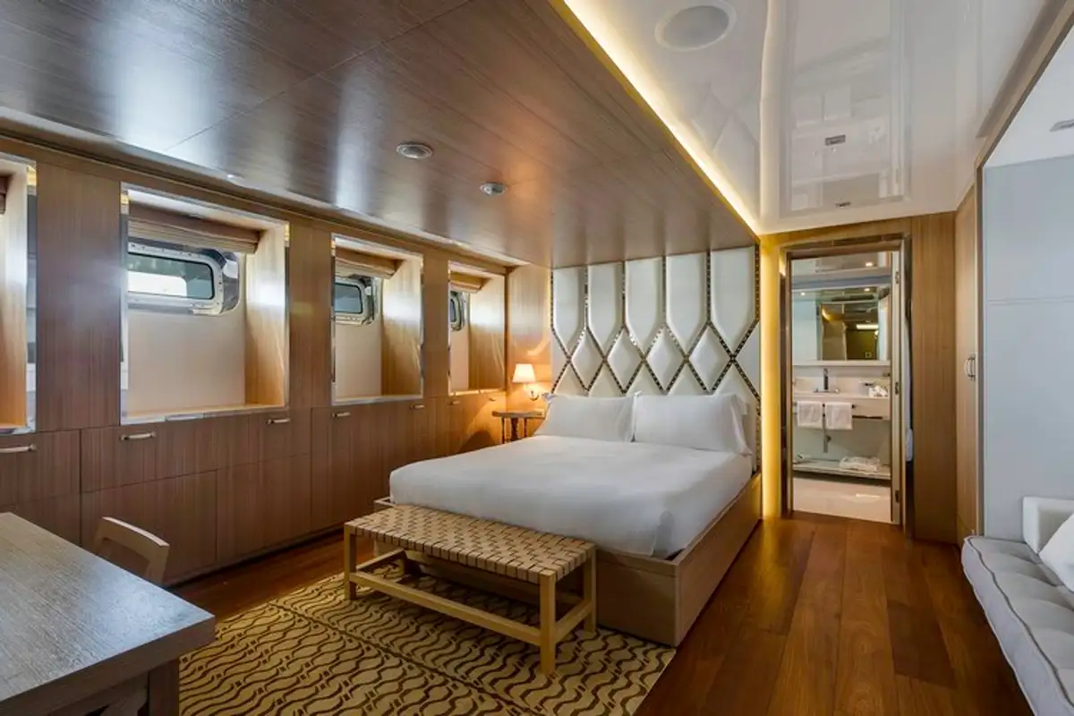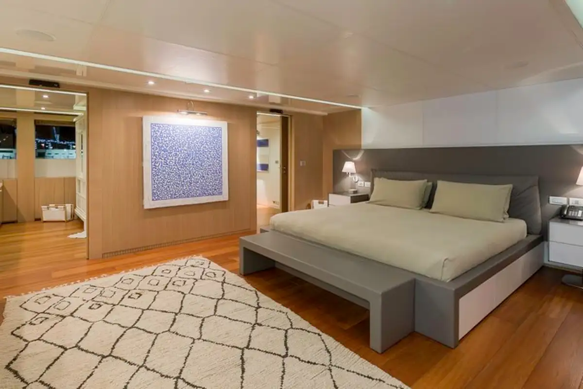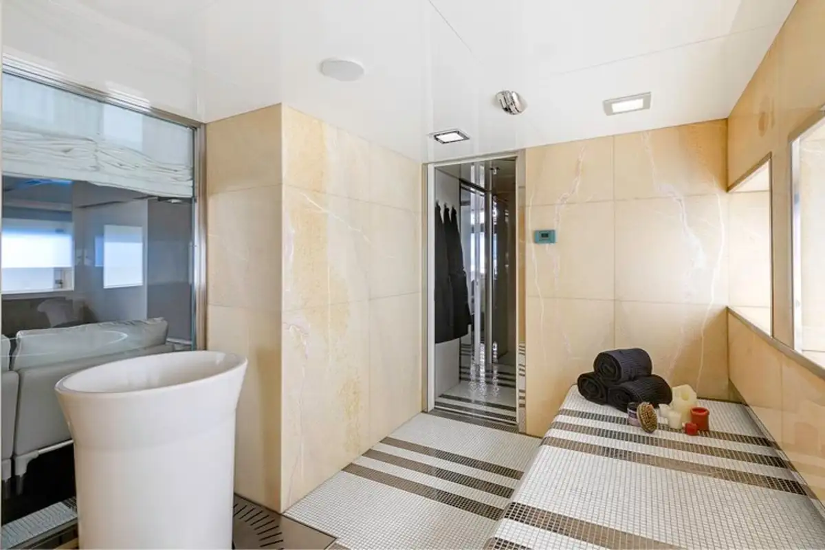 Wake up in your chic master suite on the main deck, with views out across the anchorage. The minimalist design and simple palette in your room is reflected throughout the yacht. The cool greys and clean lines create a soothing space. The suite also gives you a private lounge and bar, perfect for a little tete-a-tete later.