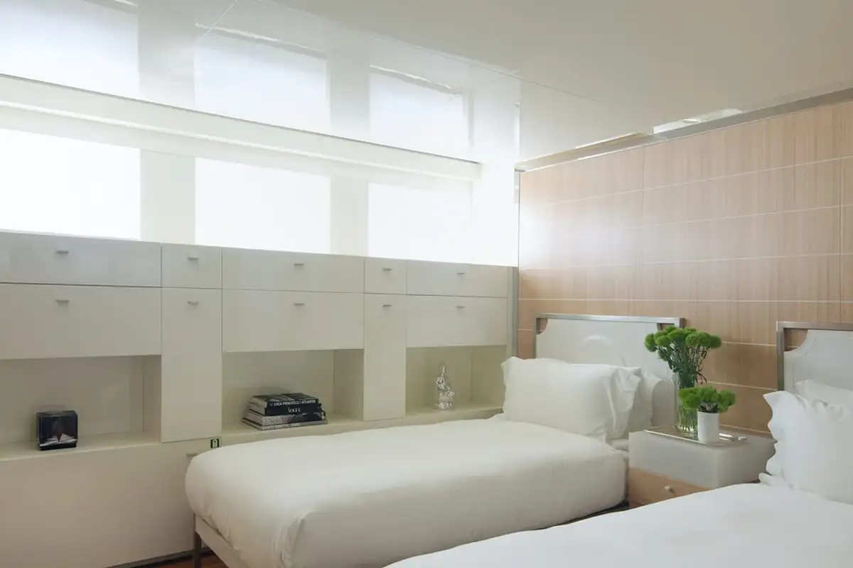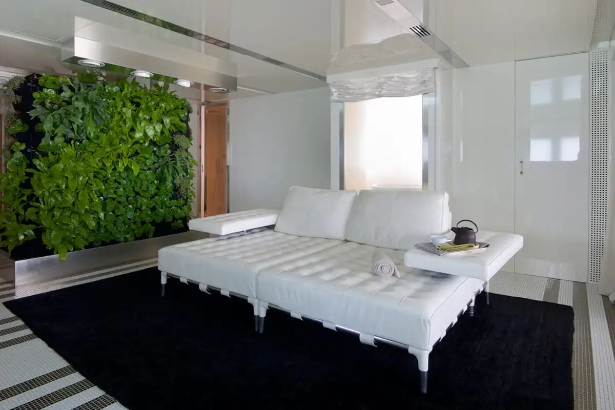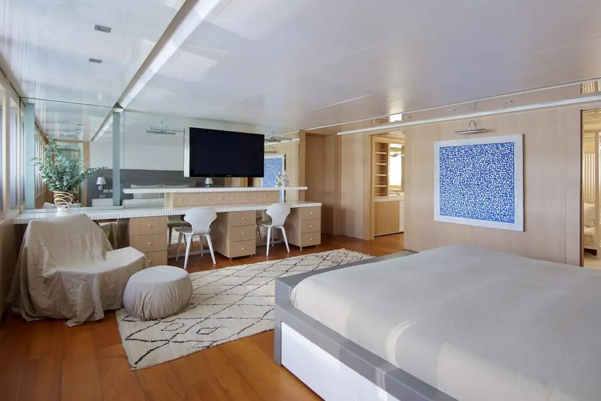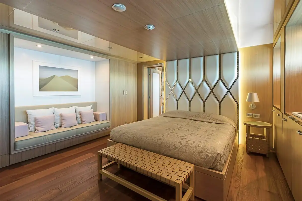 Wake up in your chic master suite on the main deck, with views out across the anchorage. The minimalist design and simple palette in your room is reflected throughout the yacht. The cool greys and clean lines create a soothing space. The suite also gives you a private lounge and bar, perfect for a little tete-a-tete later.
