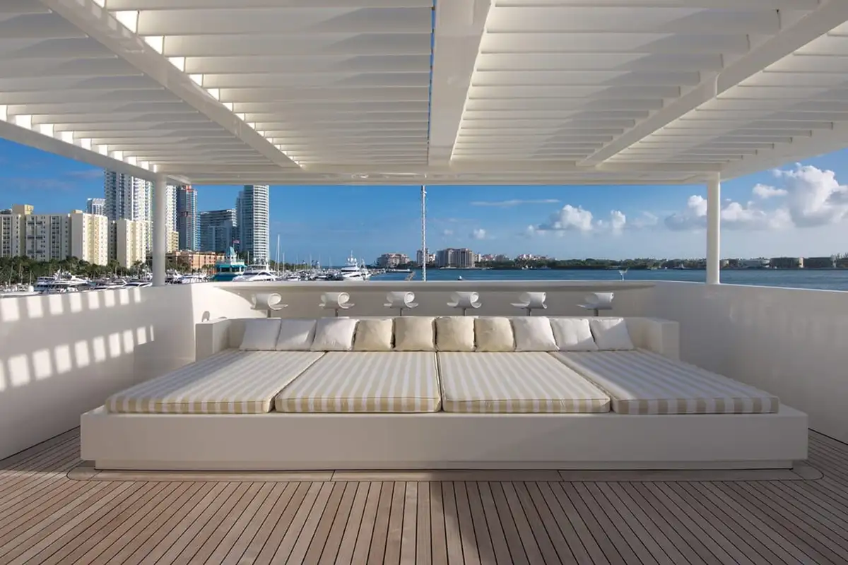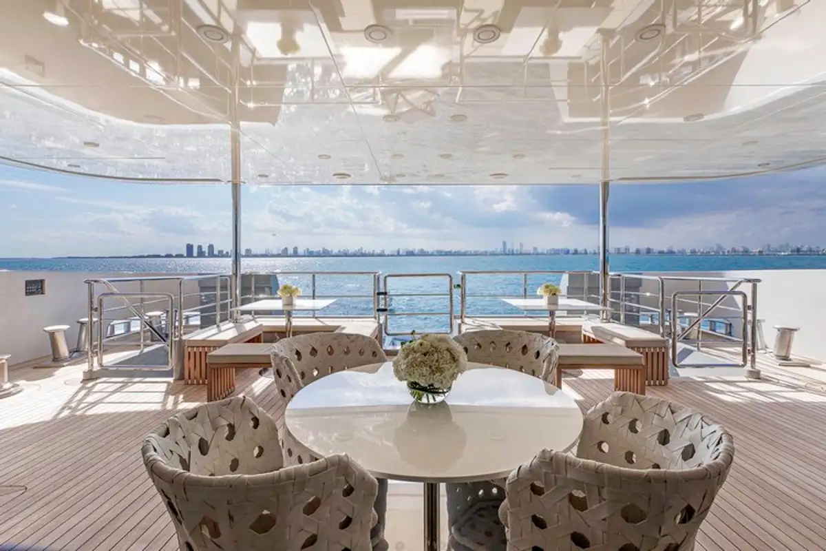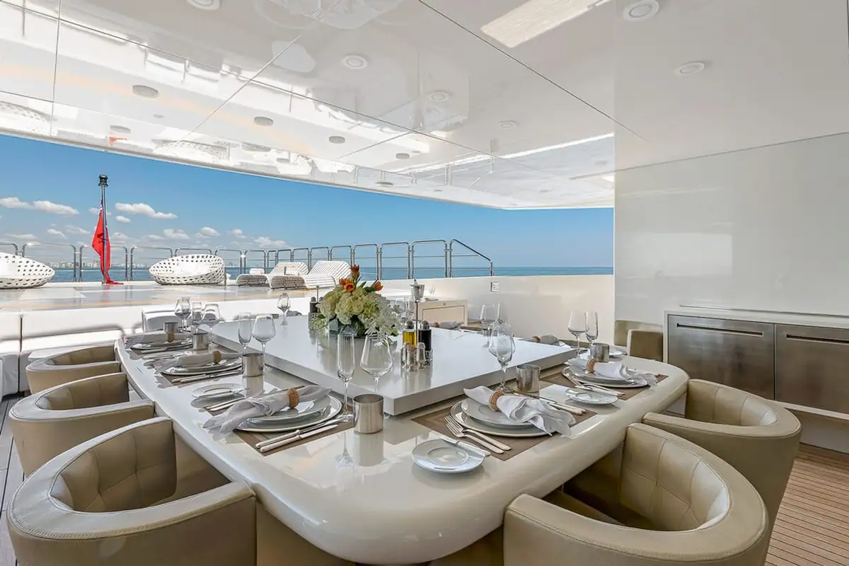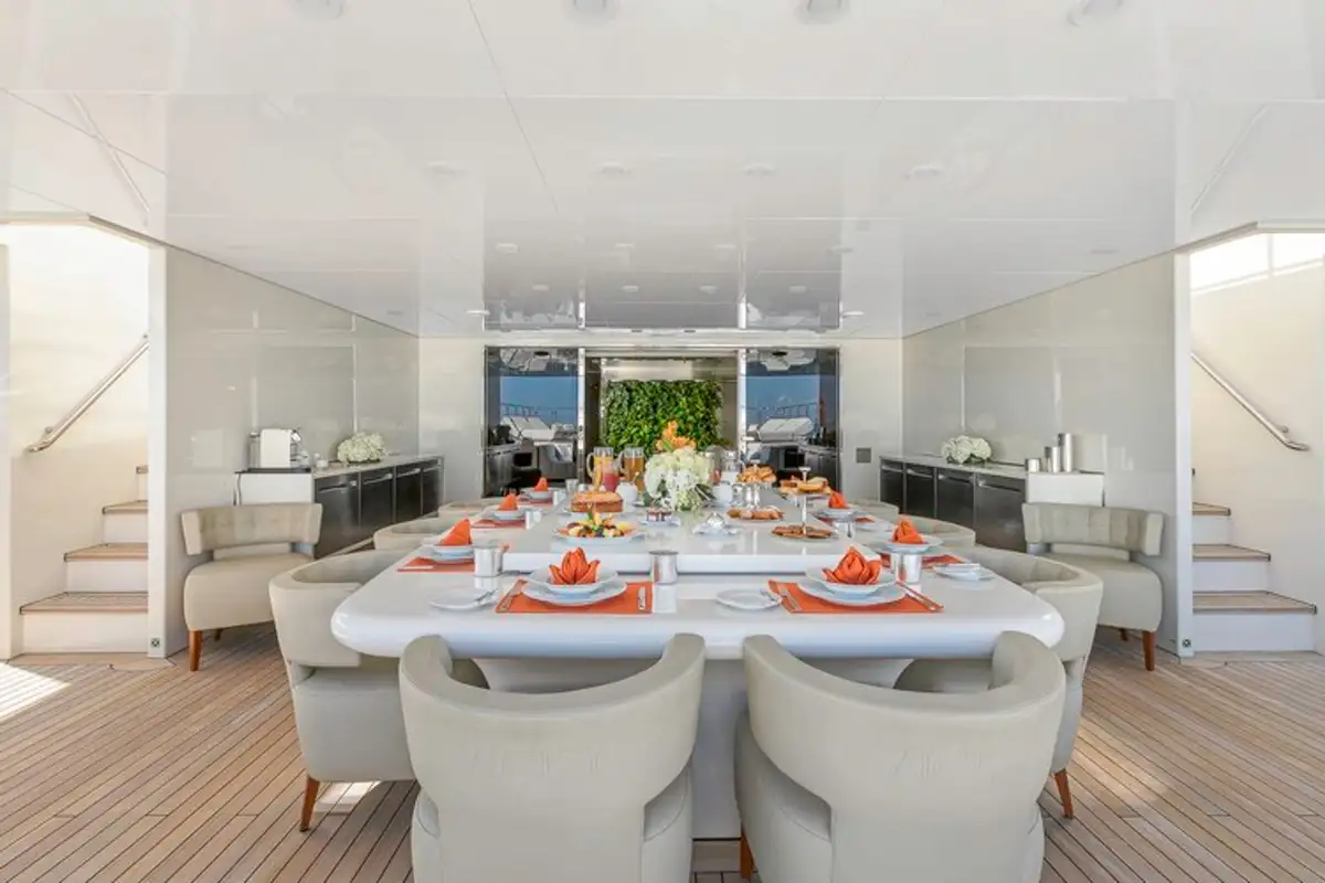 After a refreshing swim from the swim platform astern, an al fresco breakfast awaits on the bridge deck aft, with freshly juiced fruits and delicate pastries - or something heartier if your guests fancy. The yacht’s professional chef will cater to everyone’s tastes.