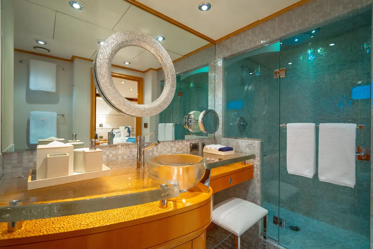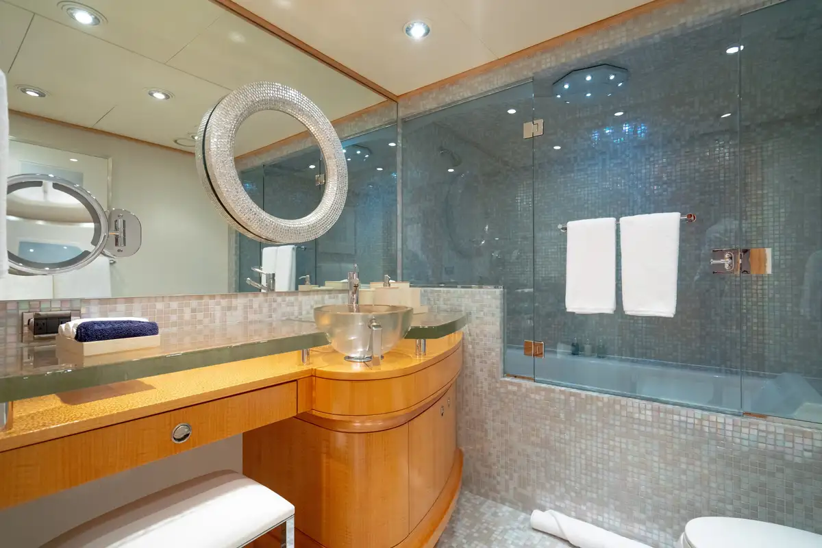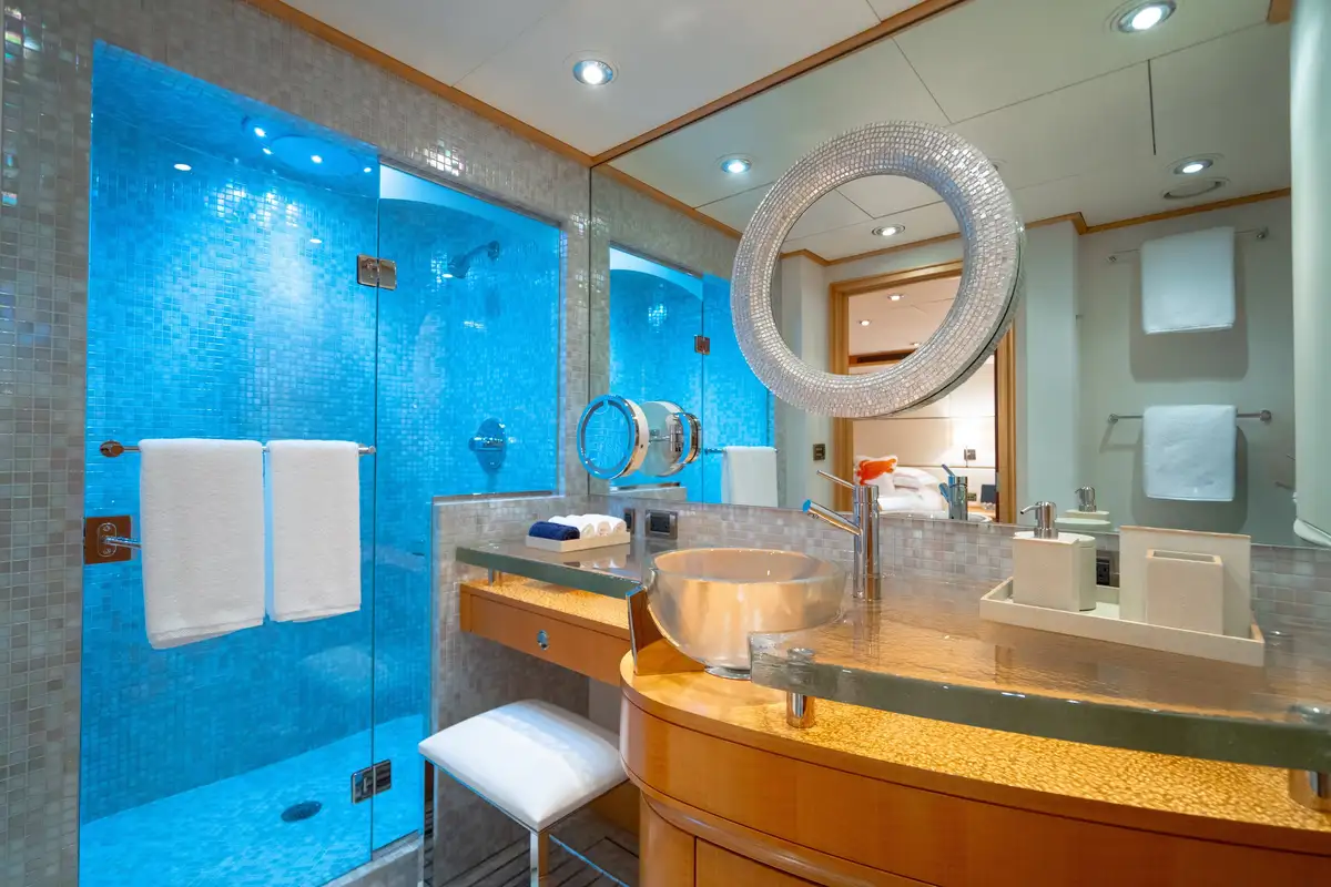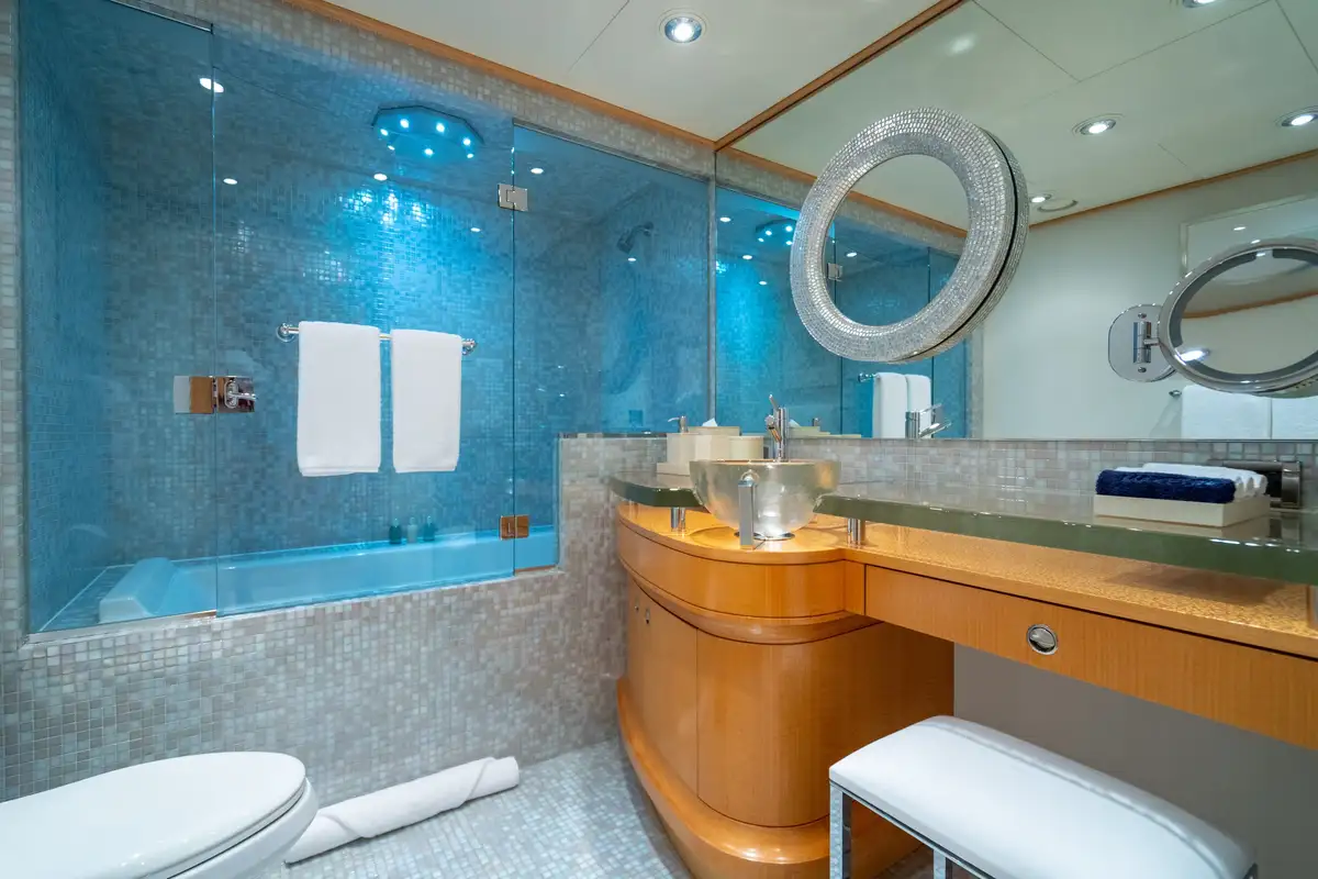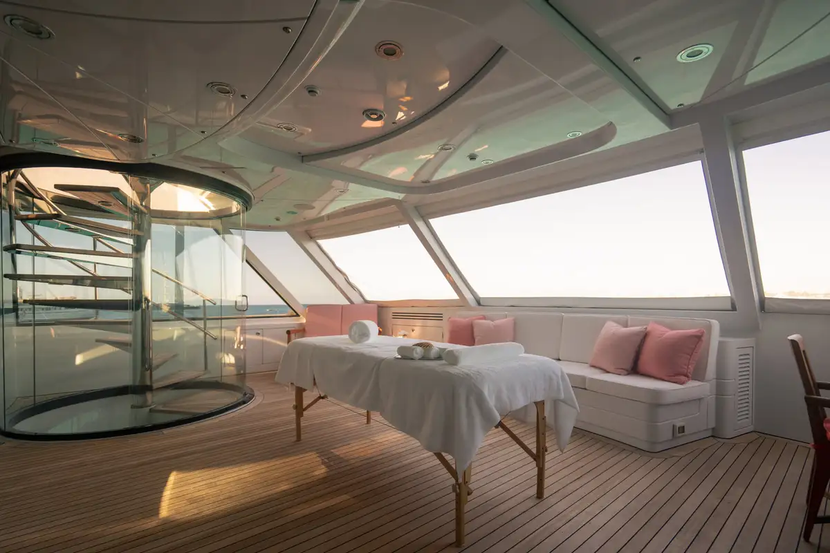 Relaxed and ready for a peaceful night’s sleep, retreat to one of the seven luxurious cabins. Located on the bridge deck, the master suite includes a semi-private, full beam aft deck space with removable windows. A further two VIP cabins can be found on the main deck and benefit from large picture windows, while the lower deck has two doubles and two twins. All of the guest decks are connected by an elevator, adding to VICTORIA DEL MAR’s ample comforts.
