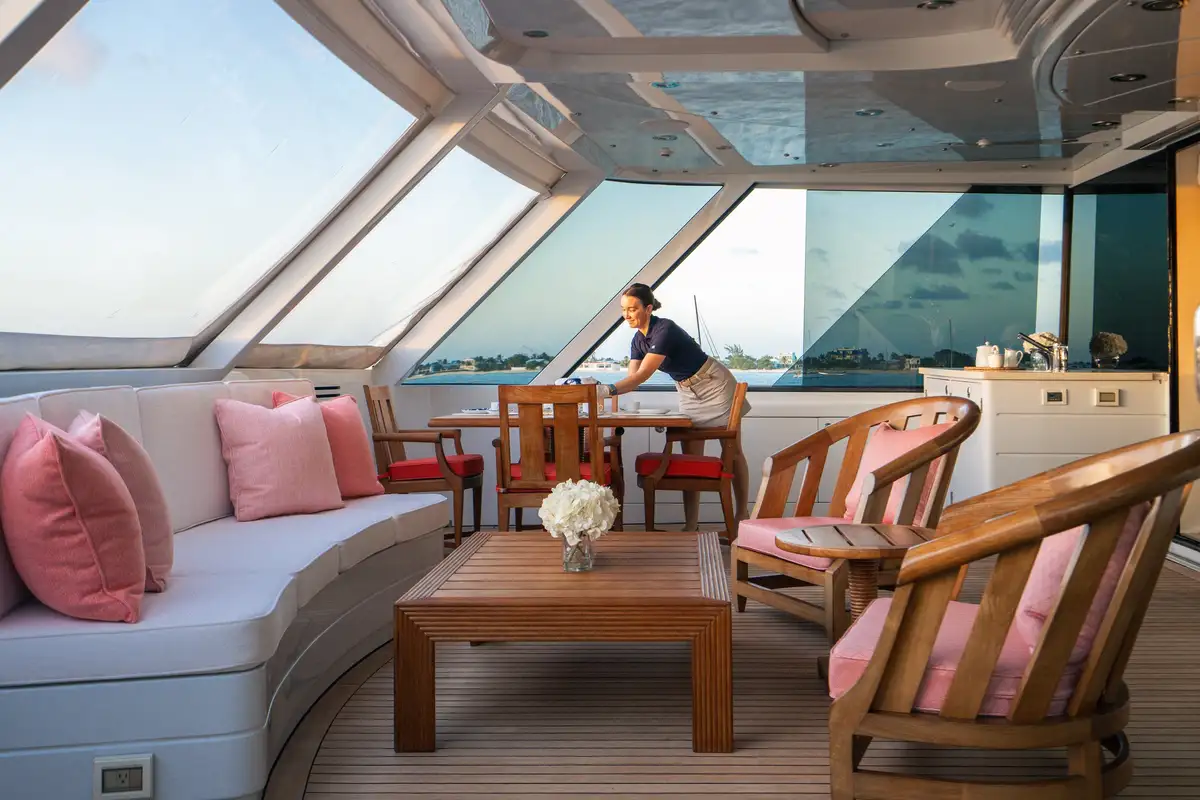 Back on board, the large table underneath the shade of the satcom arch on the sun deck is generally the most popular place to enjoy an al fresco lunch. With a jacuzzi and endless options for lounging both in the sun and in the shade, an afternoon of relaxation follows. Late afternoon, as the sun cools you could find yourself heading to the air conditioned gym or choosing a massage and pampering session instead. And as the sun sets, it’s time for cocktails and canapes, served on the main deck. After another remarkable feast, taken either al fresco or in the formal dining lounge, head to the sky lounge bar for an after dinner nightcap while the crew converts the sun deck for an outdoor movie night under the stars.