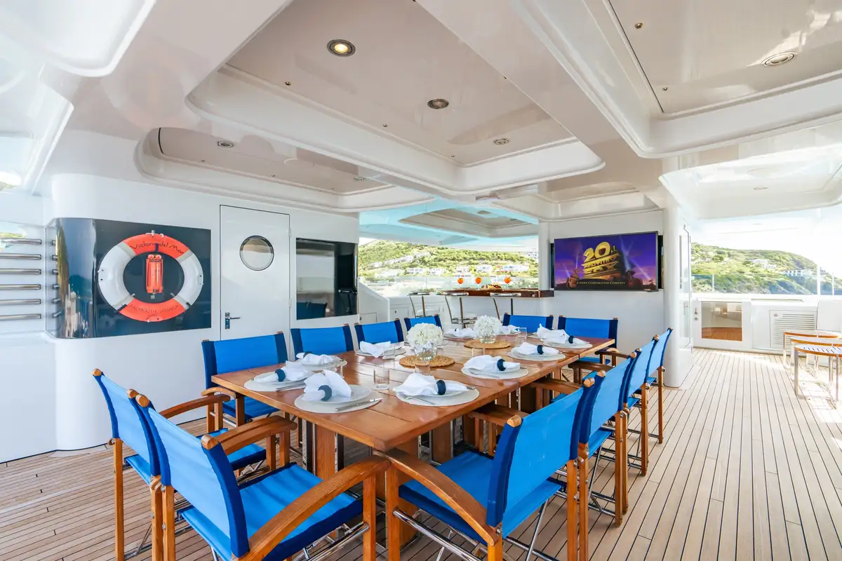 To start your day, make your way to breakfast on your private terrace on the bridge deck aft where a range of different tables allows invited guests to enjoy a more casual mood to the formal and larger group mealtimes. While you enjoy a leisurely start to your morning served by the interior crew, your professional and friendly deck crew will also be busy preparing for a morning of fun on the water. In addition to the requisite waverunners, SeaBobs, kitesurfing equipment and various towable toys, VICTORIA DEL MAR also has an inflatable climbing wall, jungle gym and an Island Hopper Water Bouncer, making her a firm favorite with families. For those looking to explore the surrounding coastline, perhaps taking in a few secluded coves, paddleboards and kayaks are also included in her toybox.