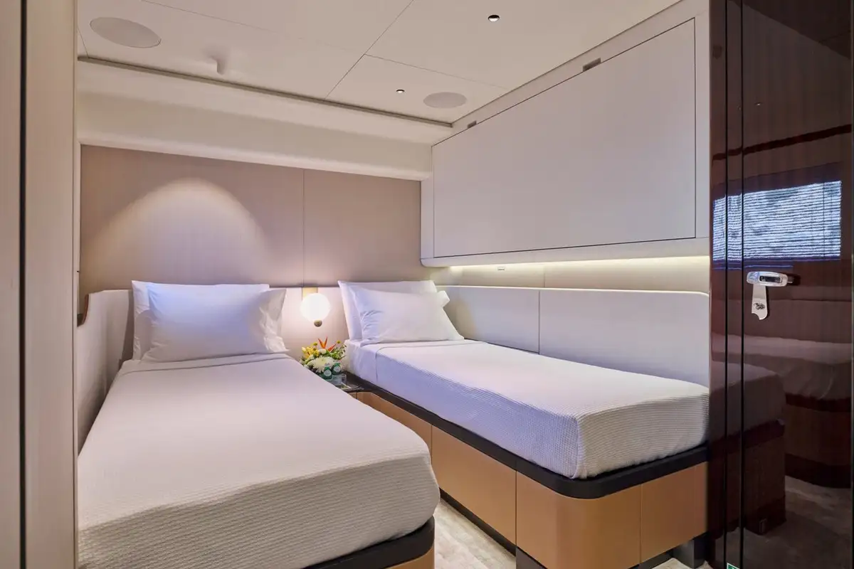 With a VIP on the upper deck, a double cabin, and three twin cabins - two of which are convertible into doubles - those on board have the flexibility to decide their arrangements to suit what's best for everyone.