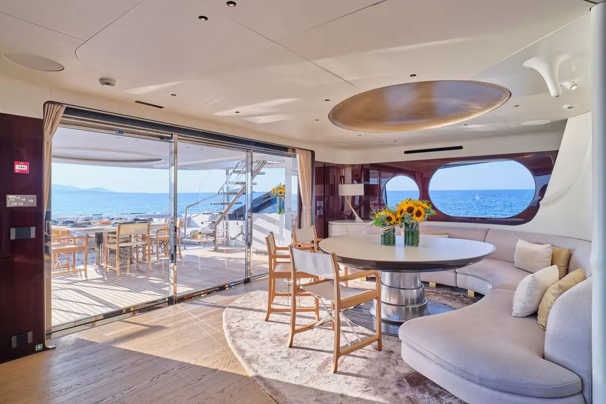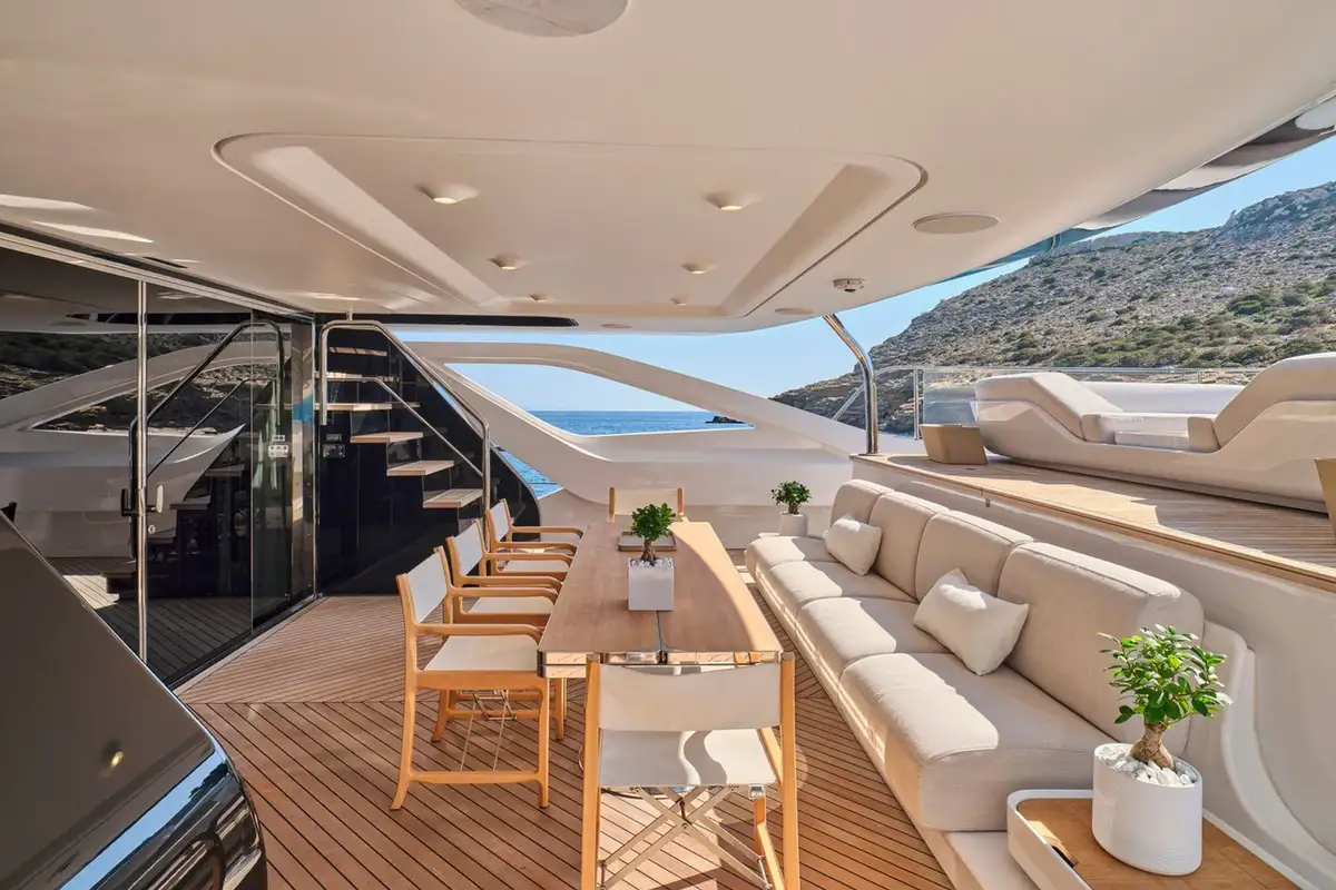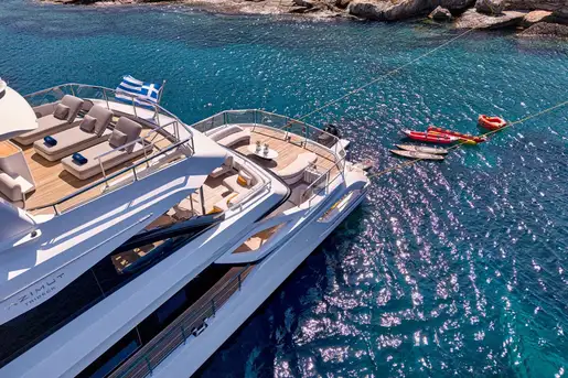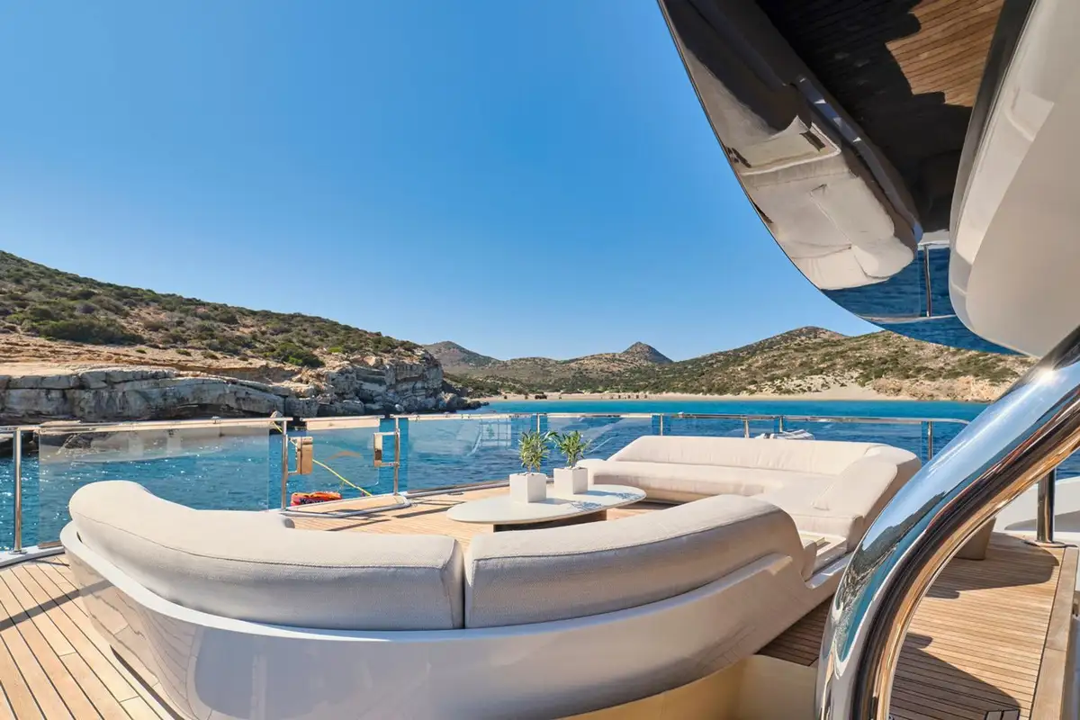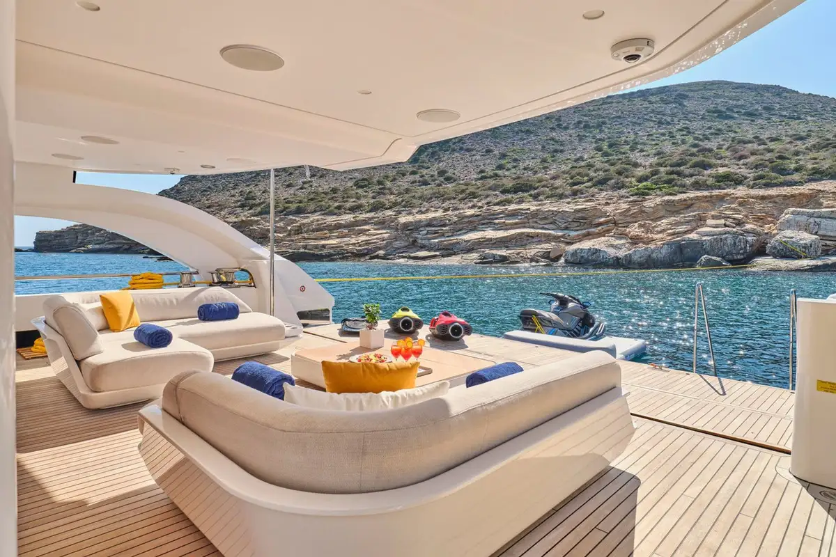Stepping down onto the main deck aft, you are greeted by plush seating and a large couch, ideal for private dining moments or watching the sunset from the back of the yacht. Heading further down, the beach club feels like a modern resort feature, complete with plush couches, a shower, and a wide swim ladder that you can climb down from into the water.