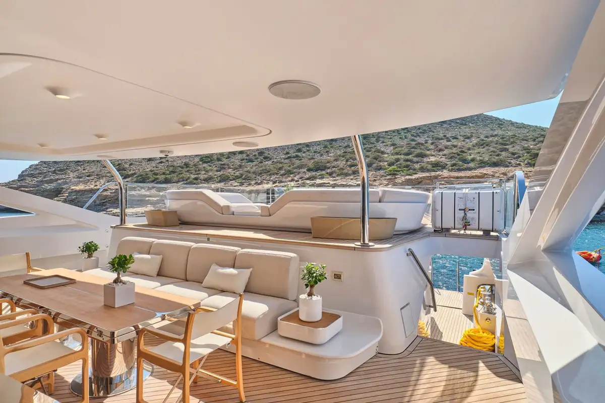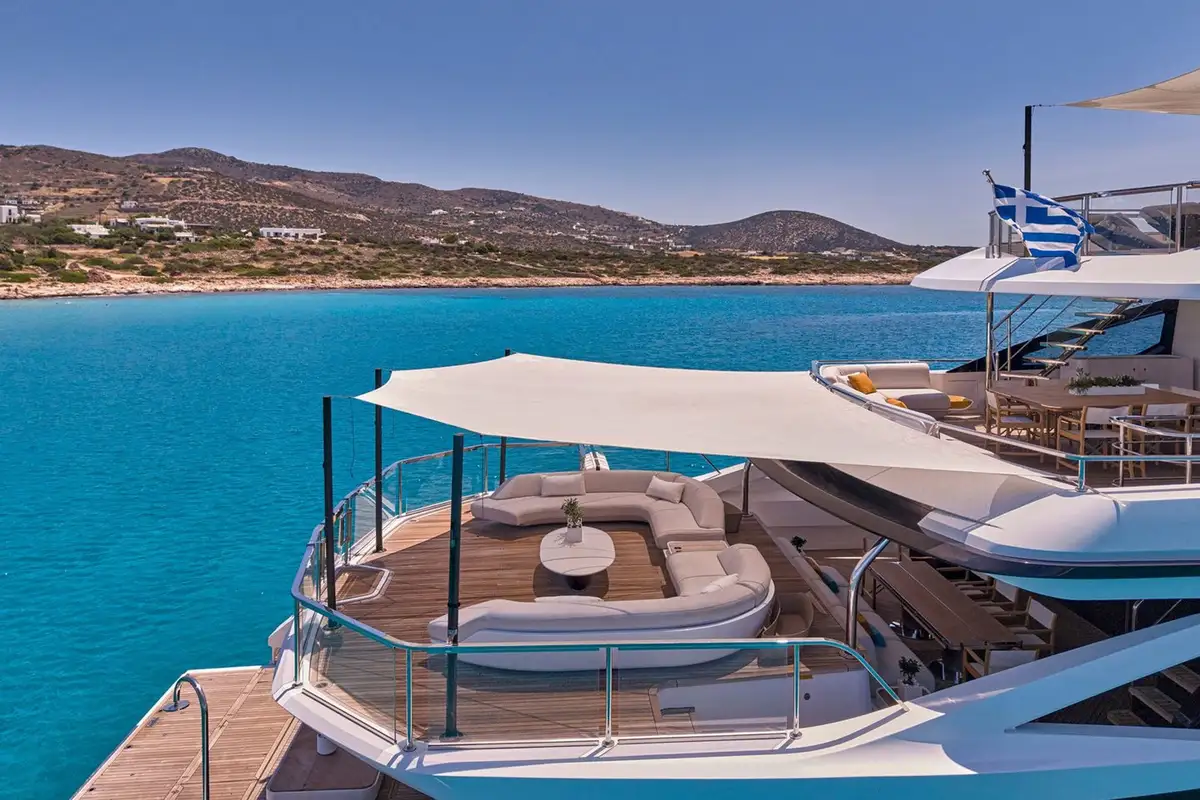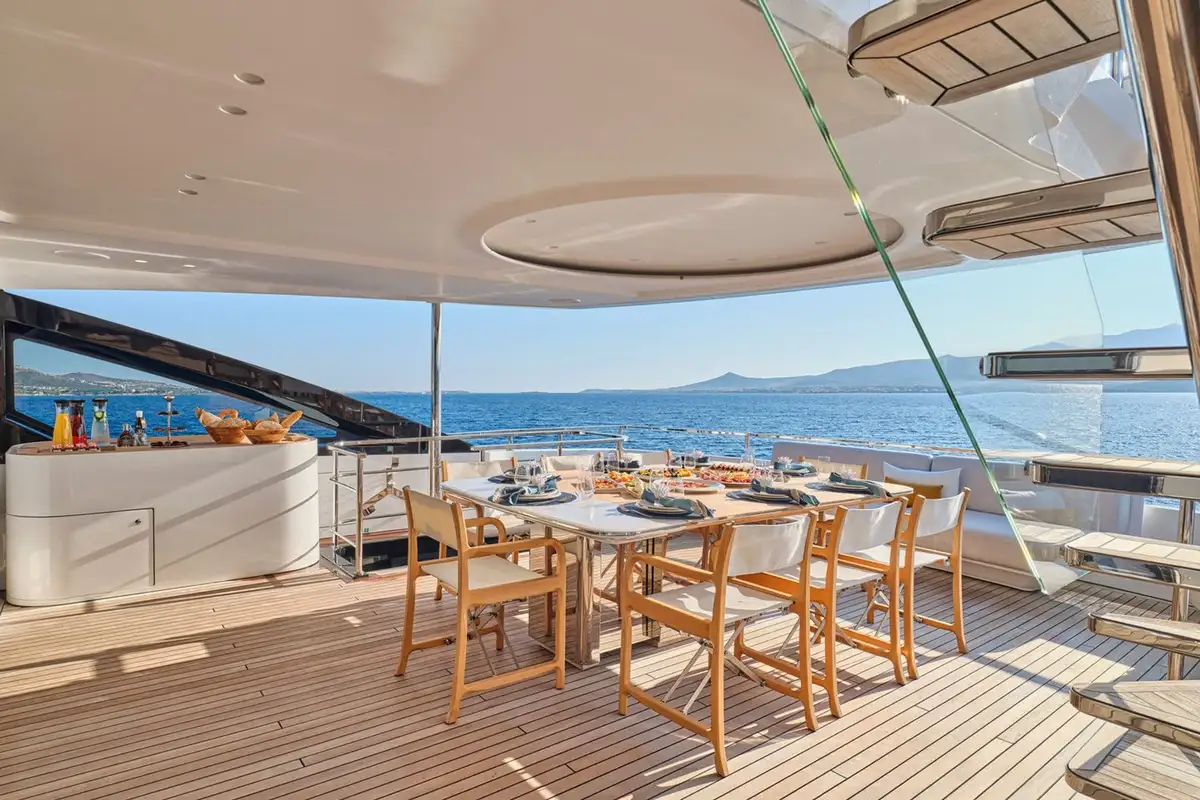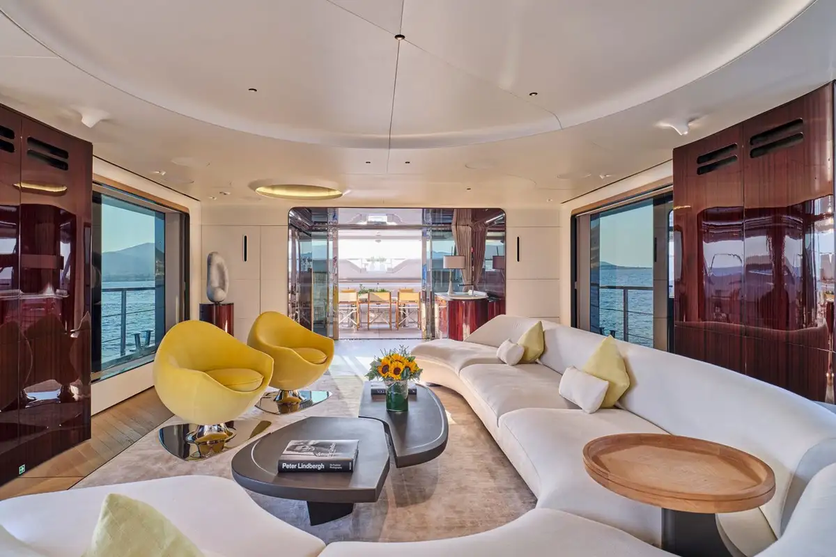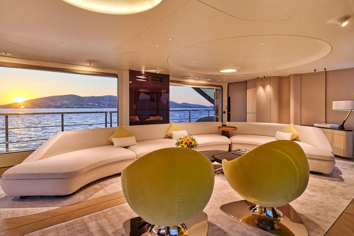 Stepping down onto the main deck aft, you are greeted by plush seating and a large couch, ideal for private dining moments or watching the sunset from the back of the yacht. Heading further down, the beach club feels like a modern resort feature, complete with plush couches, a shower, and a wide swim ladder that you can climb down from into the water.