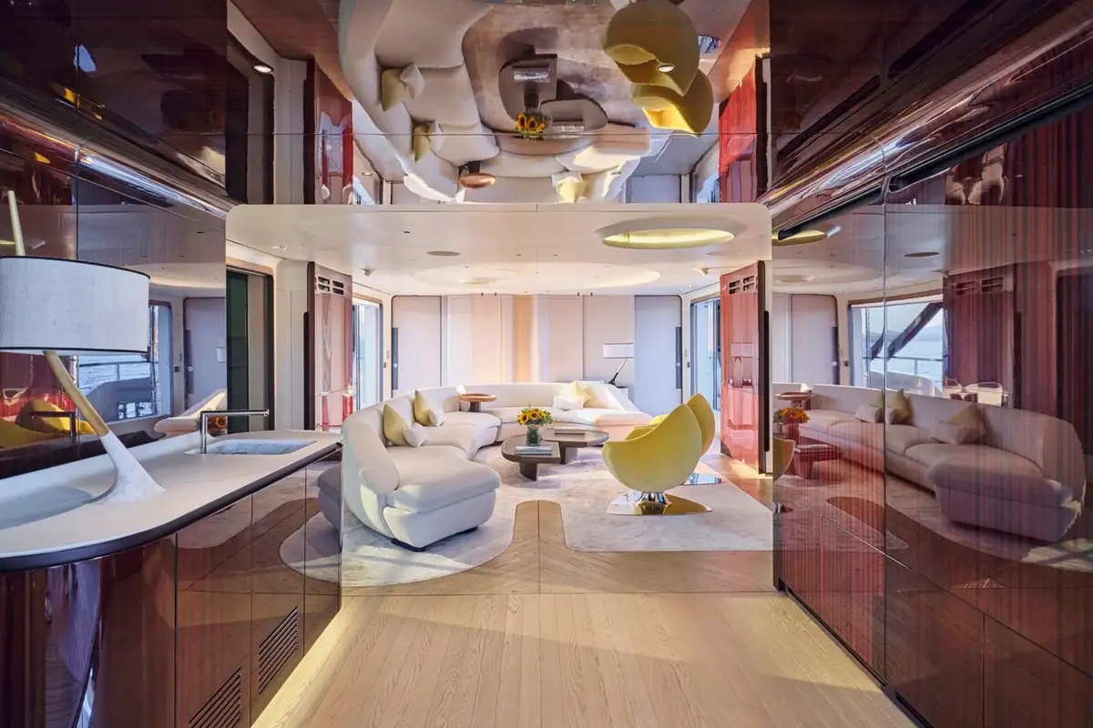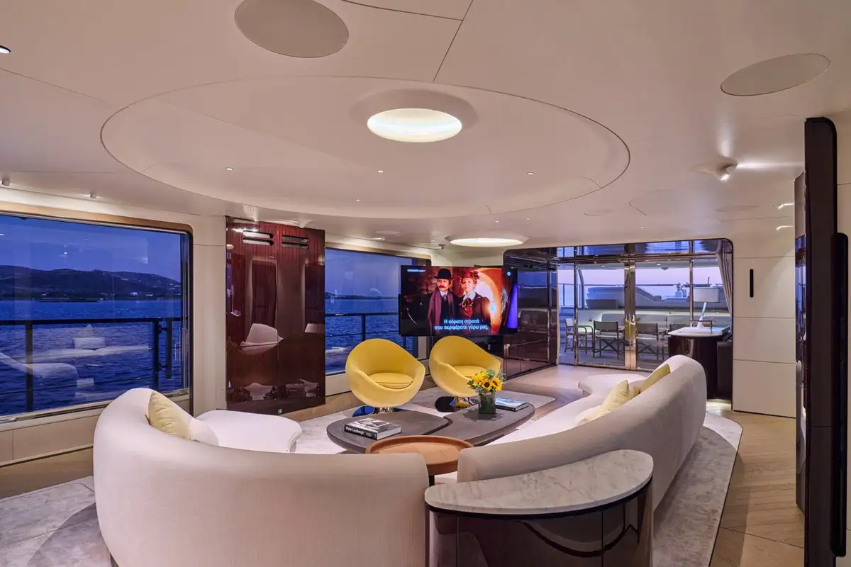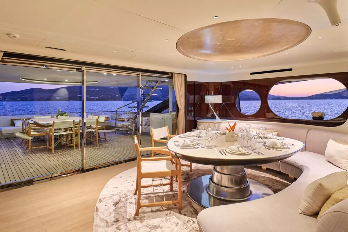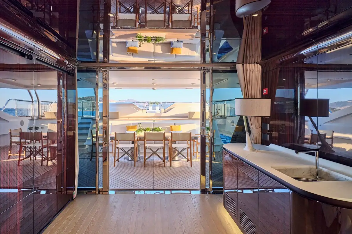 Stepping down onto the main deck aft, you are greeted by plush seating and a large couch, ideal for private dining moments or watching the sunset from the back of the yacht. Heading further down, the beach club feels like a modern resort feature, complete with plush couches, a shower, and a wide swim ladder that you can climb down from into the water.