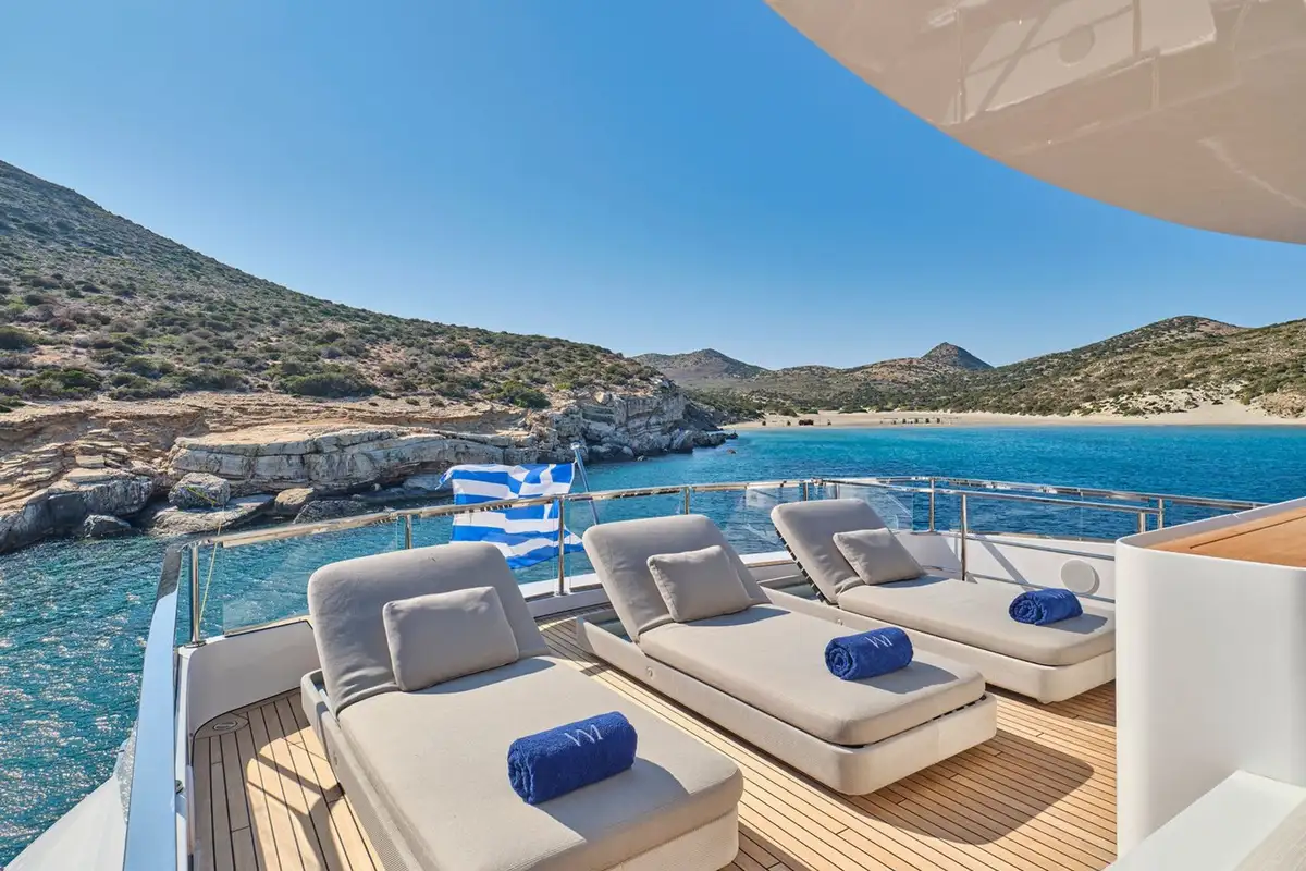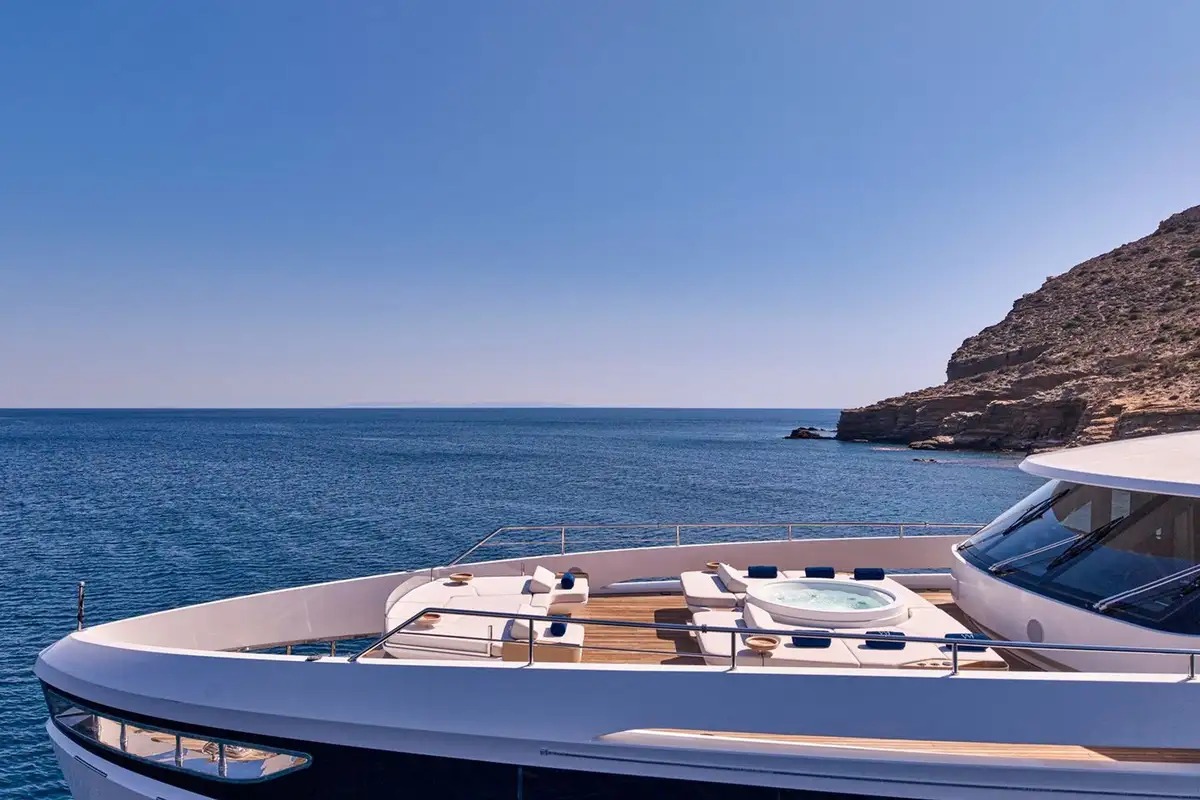 Launched in 2023, VOLO MARE blends speed, comfort and elegance all in one, with deck and interior spaces delightfully arranged so that one can truly get immersed in life at sea. With al fresco dining areas on each of the three decks, as well as sunloungers and seating with and without shade, and mostly importantly, a sunken jacuzzi on the foredeck, guests are spoilt for choice when it comes to sea views and relaxation.