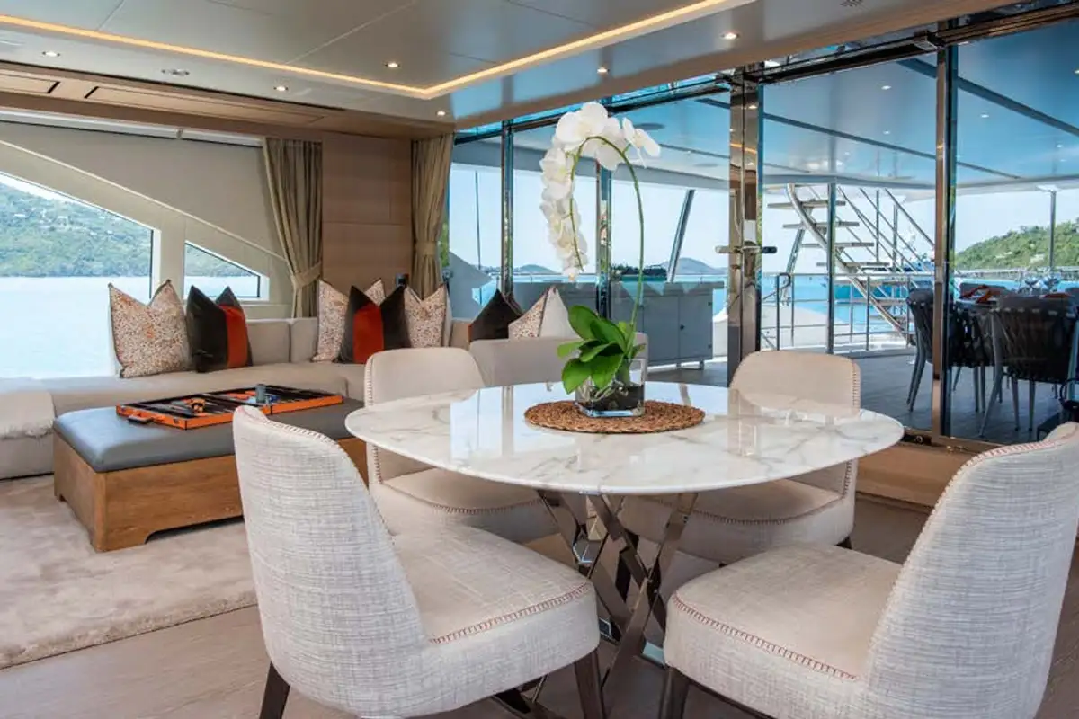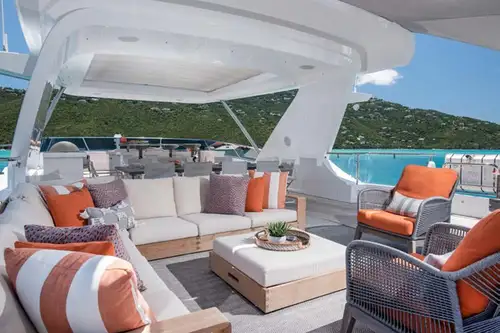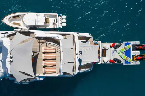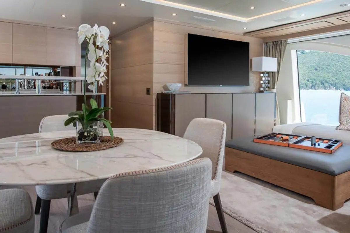 Then return to WABASH to enjoy the afternoon at a more leisurely pace. With its rooftop bar vibe, the sun deck is always a hive of activity on board; choose between its aft deck sunloungers, comfortable sofas and sit-up bar. The large foredeck with optional shade is a great place to spend a few hours, with its jacuzzi, seating and table for mid-afternoon snacks and an inviting, large sun pad for blissful relaxation. Alternatively, head back out to the water and enjoy a snorkelling or paddleboarding safari to a nearby cove. The sky lounge is ideal for an afternoon movie with fresh gourmet popcorn and drinks supplied by the crew.