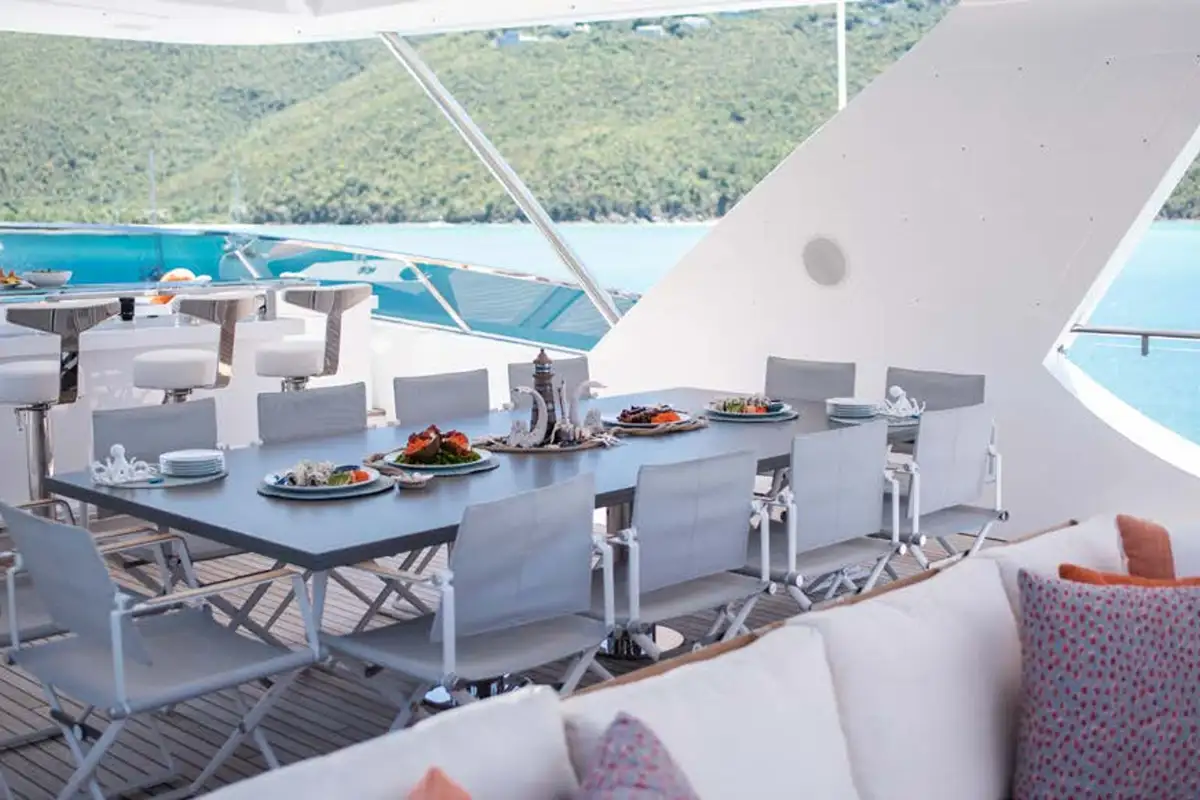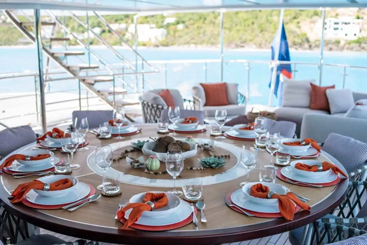 There is no better viewpoint for the sunset than the sun deck, where cocktails and canapés are served. Then enjoy an atmospheric al fresco dinner on the bridge deck aft or a more private gathering in the main lounge’s dining area. Another night you might opt for a themed party or sushi banquet on the sun deck. As the ultimate chameleon, the crew and layout of WABASH will continue to surprise you with the numerous options throughout your charter.