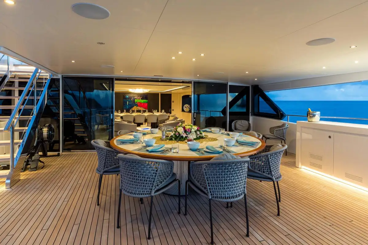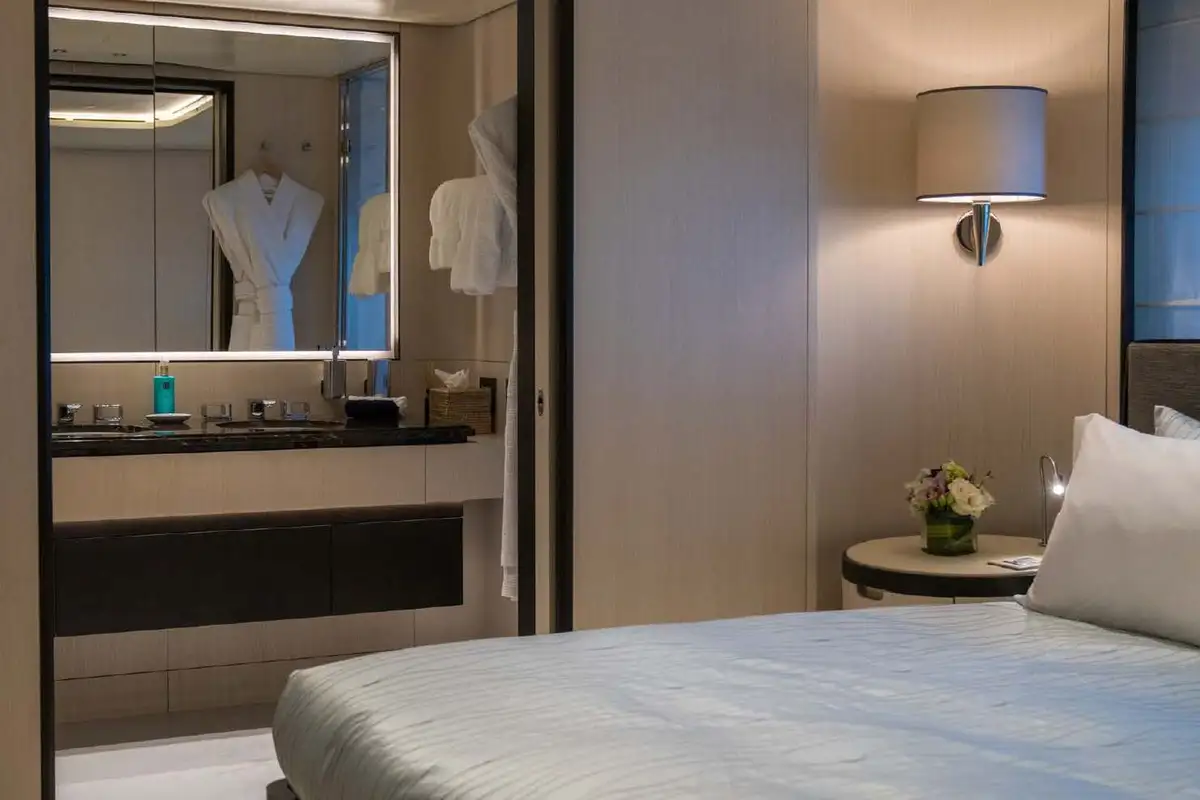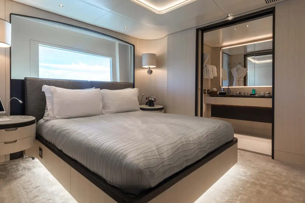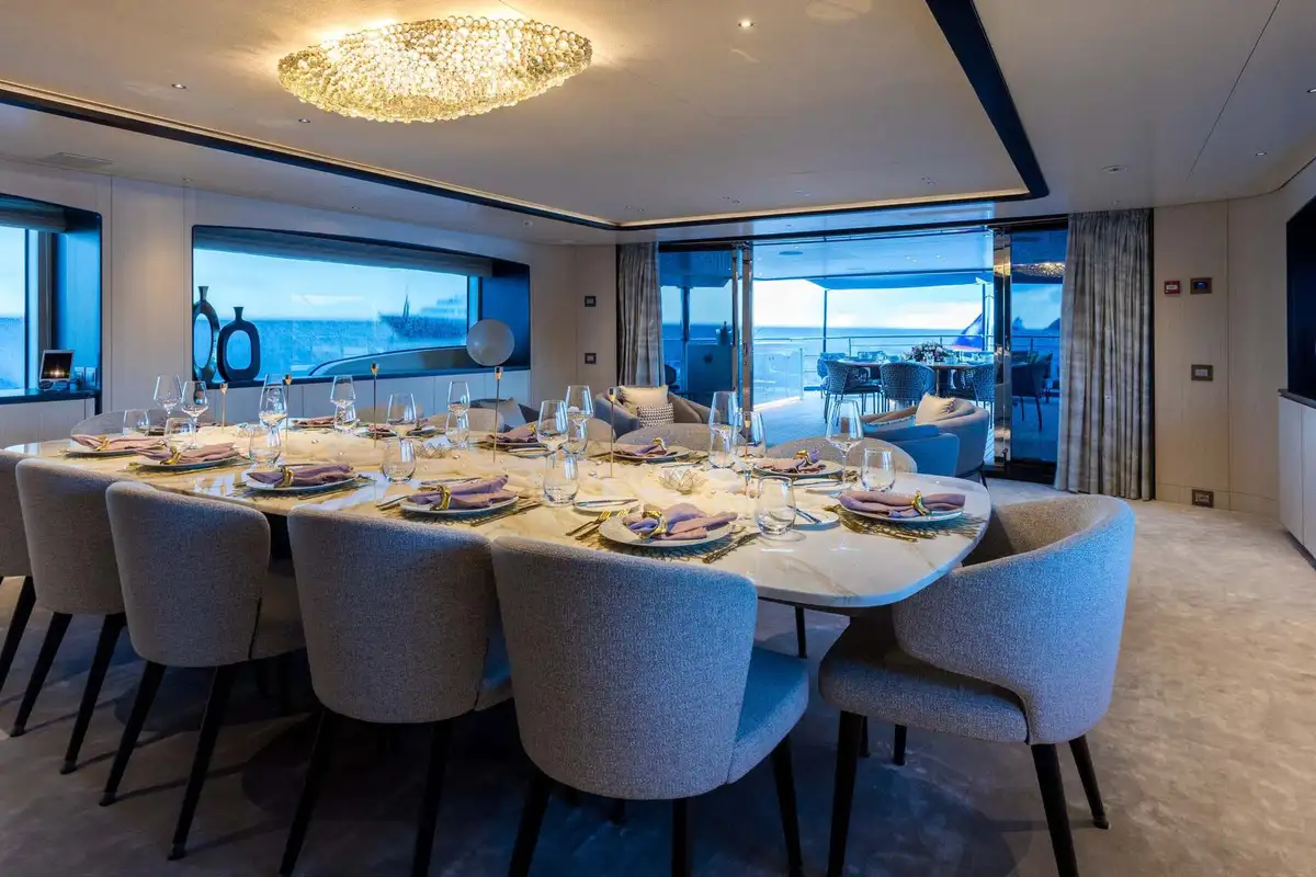 As part of the acclaimed Diamond 145 series, the yacht’s beautiful exterior was designed by Giorgio M. Cassetta. Distinguished by its refined superstructure, high hull sides, and contemporary flared bow, the sleek profile exudes understated elegance.