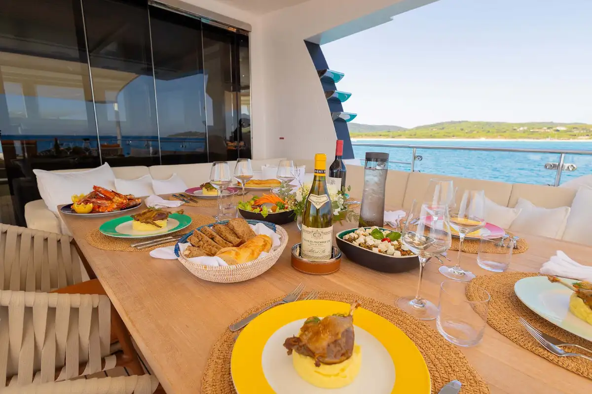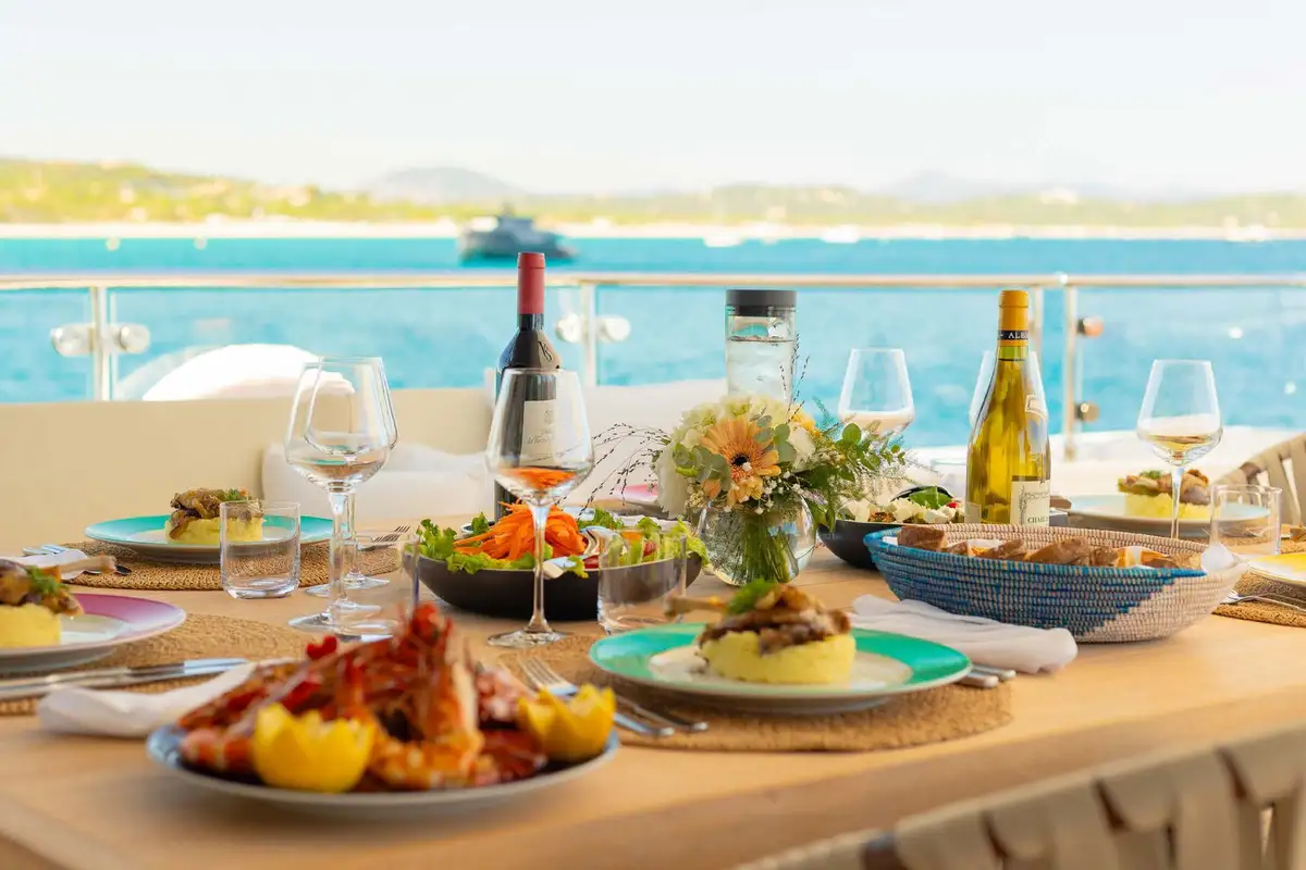 The exceptionally diverse cuisines of Sardinia, fresh coastal seafood from local waters to hearty meats and homemade pastas, reflect the island's rich history with influences from the Phoenicians to the Spanish, accompanied by spectacular views over Romazzino Bay.
