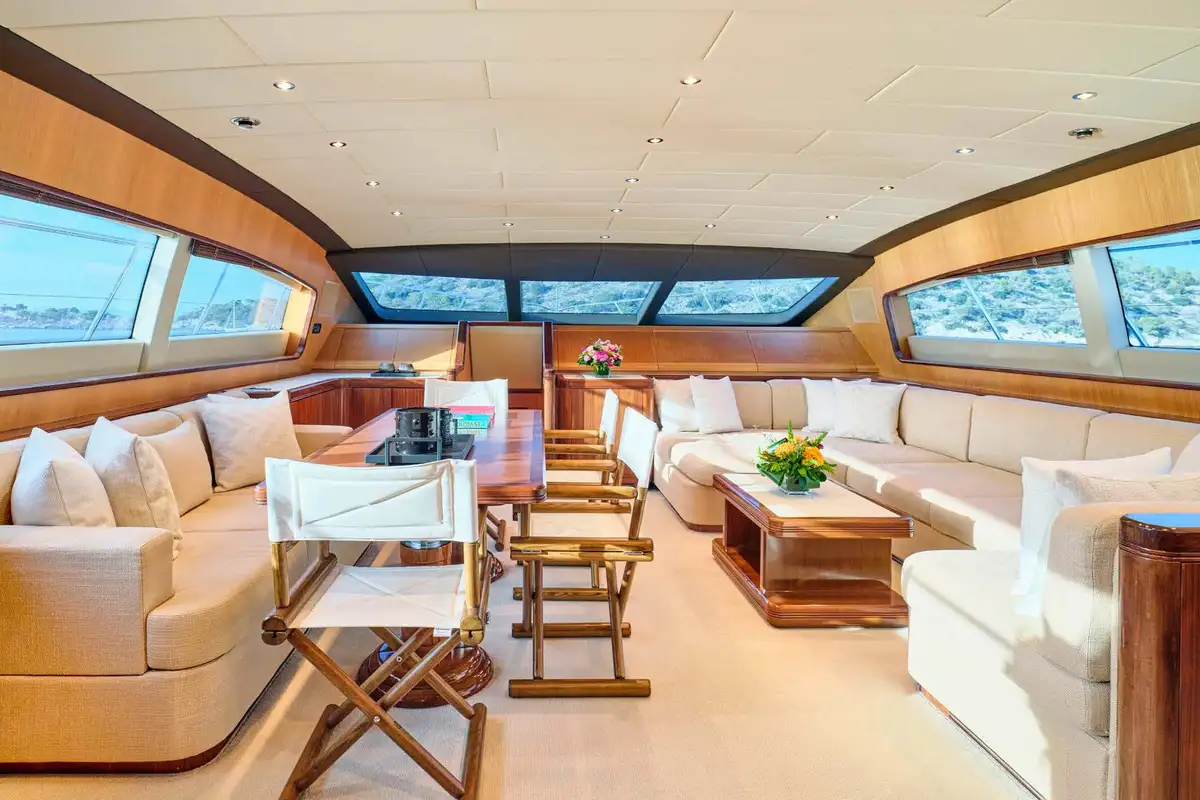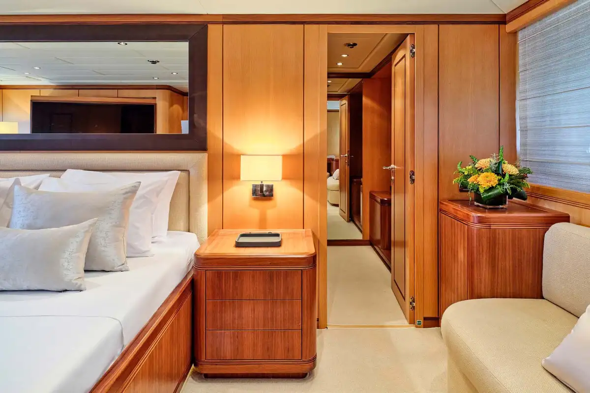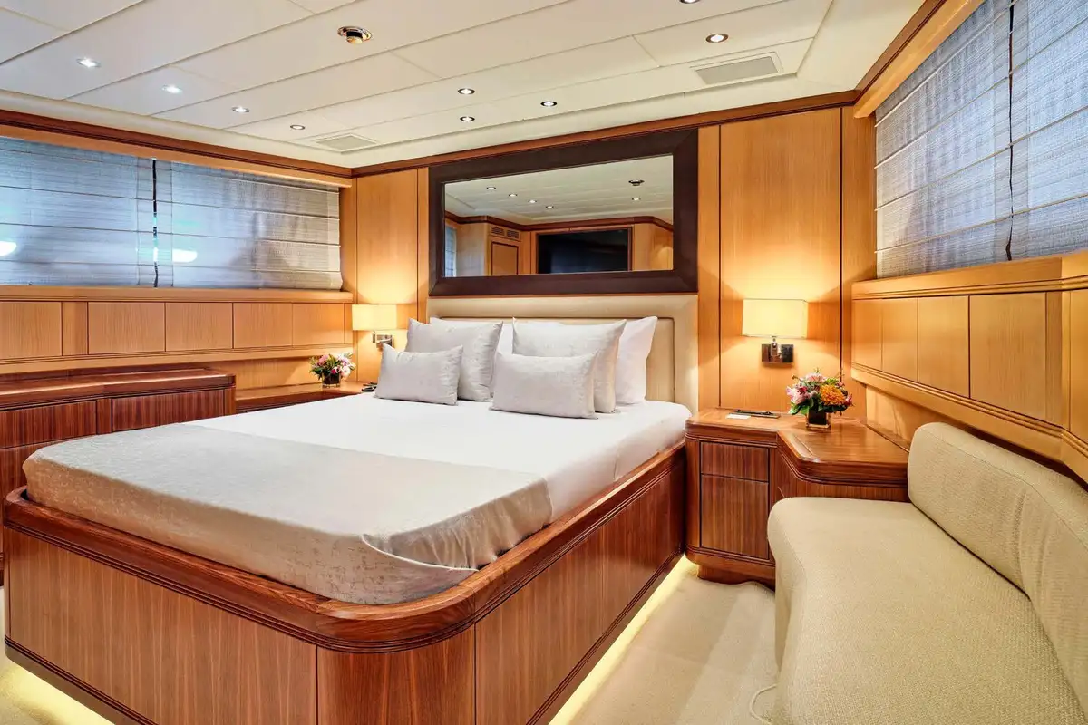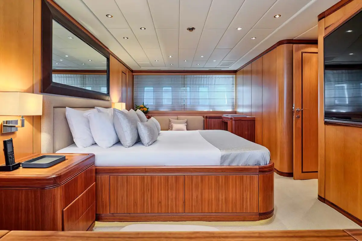 Rest assured, you won’t be compromising the quality of the living space on board. Her refined and inviting main deck lounge and cosy skylounge are freshly and tastefully upgraded in a cool contemporary style, beautifully finished in varnished blond hardwoods with new sofas, carpets and lighting throughout. With lounge and dining areas on two levels there’s ample space for guests to gather in groups or find their own nooks to relax in. She also has brand new audio/video entertainment systems.