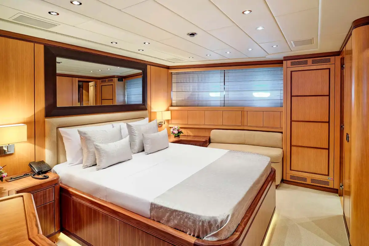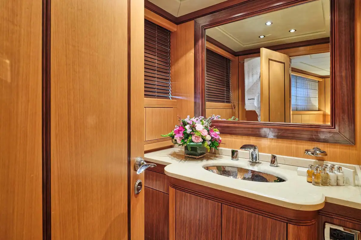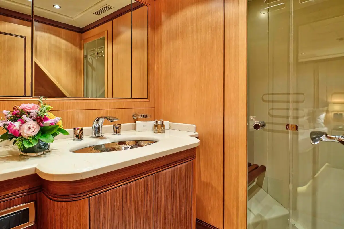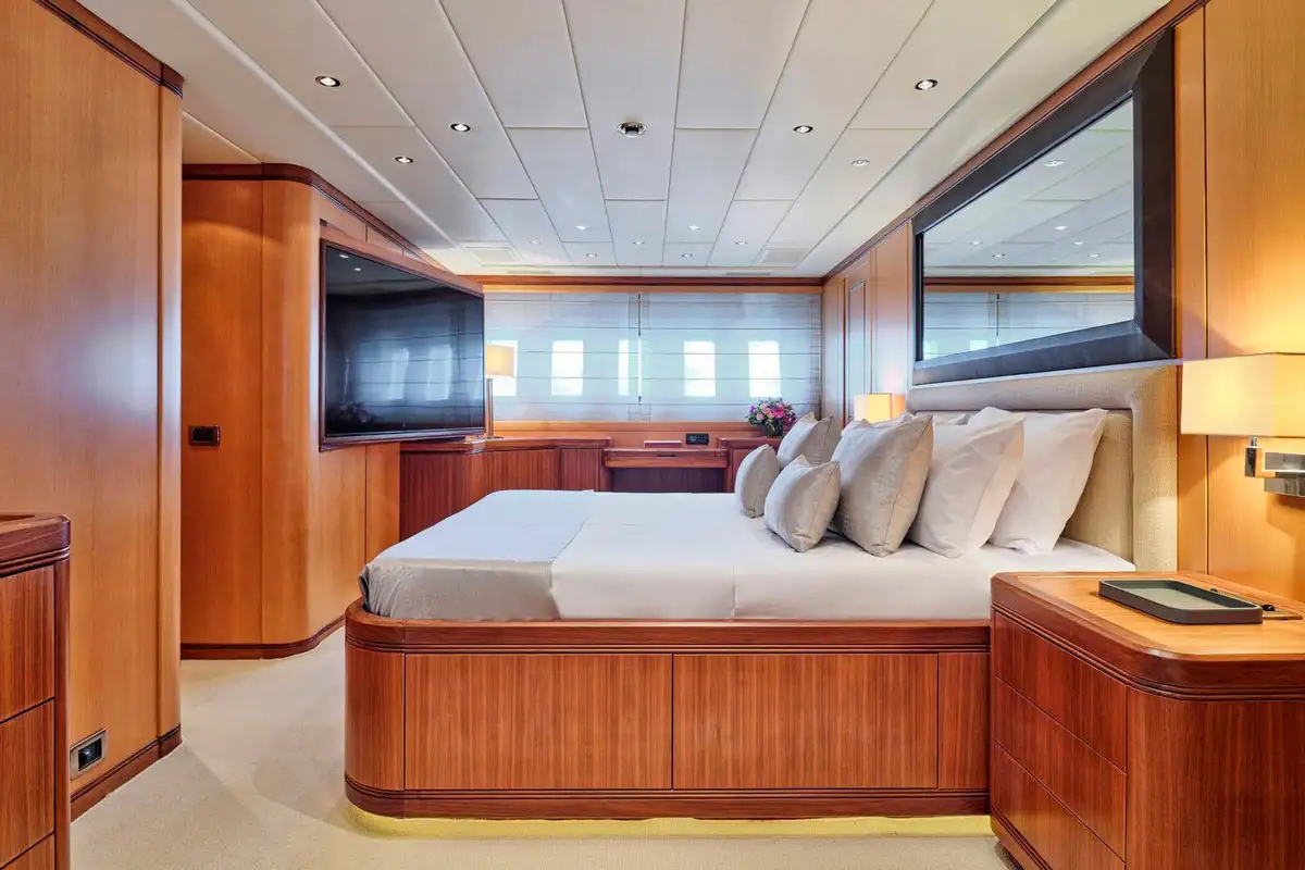 The master suite is a full-beam cabin with a king size bed, desk and sofa, a big TV, his-and-hers en suite bathrooms and five tall windows on each side. There’s also a nice VIP suite in the bow with the same finely crafted, contemporary finish and a sofa on one side. The other two cabins are twins, each with an extra fold-out bunk, giving a total of eight guest beds on board.