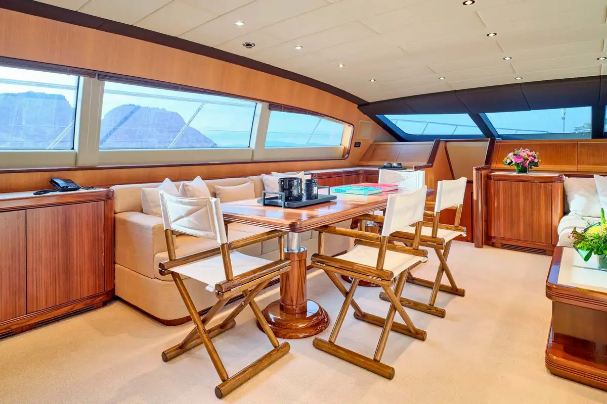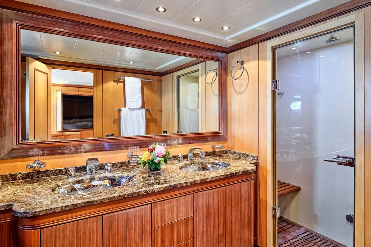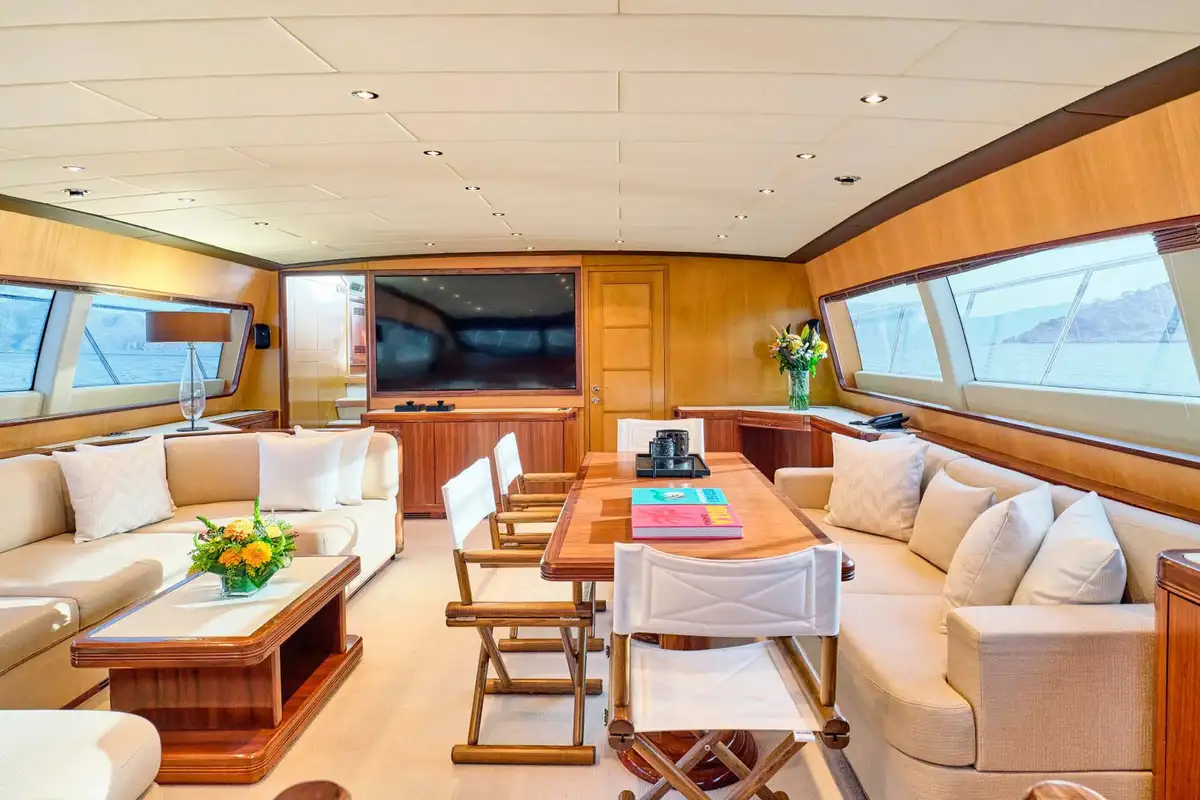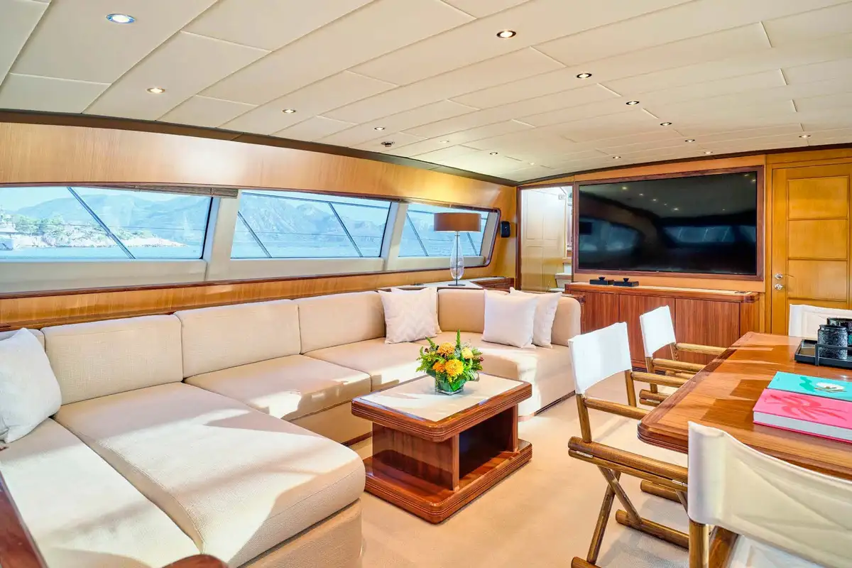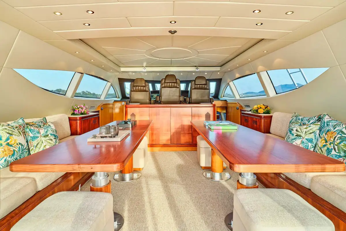 The master suite is a full-beam cabin with a king size bed, desk and sofa, a big TV, his-and-hers en suite bathrooms and five tall windows on each side. There’s also a nice VIP suite in the bow with the same finely crafted, contemporary finish and a sofa on one side. The other two cabins are twins, each with an extra fold-out bunk, giving a total of eight guest beds on board.